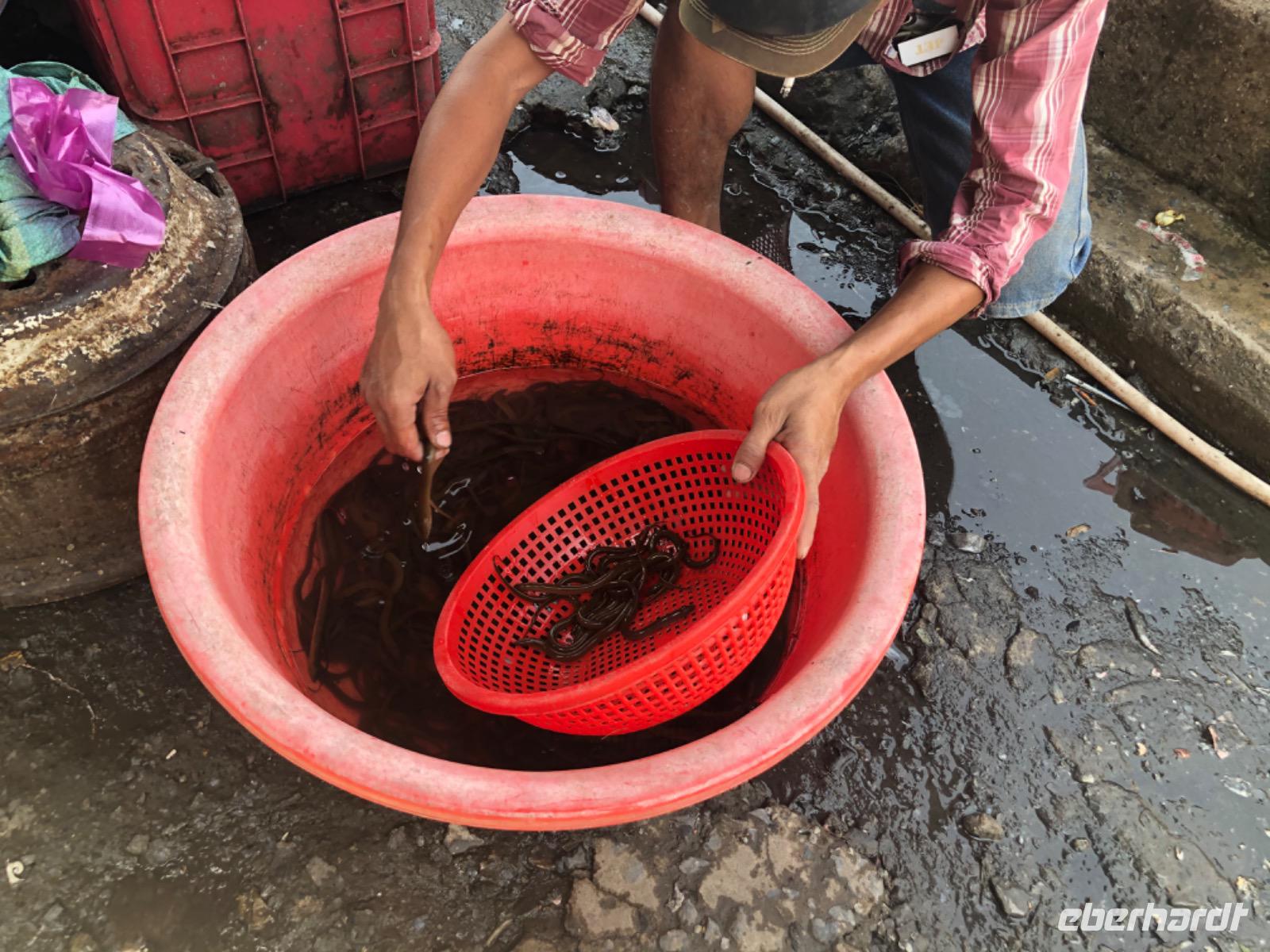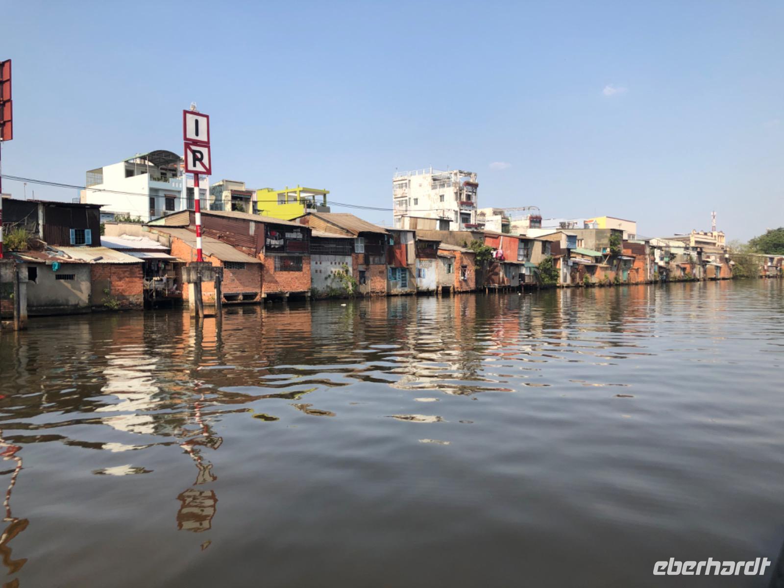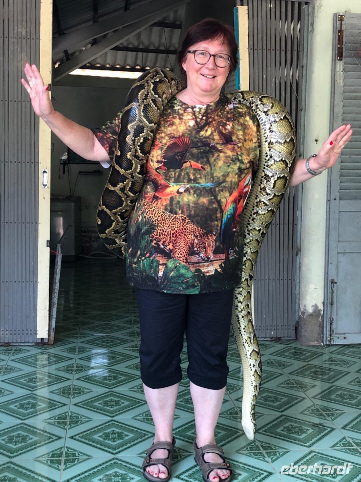 Heute fahren wir mit dem Speedboot ins Mekong Delta. Hien holt uns vom Hotel ab und wir laufen zum Hafen. Zunächst tuckern wir ein wenig aus der Stadt hinaus, bevor unsere Bootsführer richtig Gas gibt. An den Ufern ist nun die andere Seite Saigons zu sehen. Neben den Glitzerpalästen, den modernen Wolkenkratzern und den restaurierten Bauten mit historischem Hintergrund, gibt es eben auch das Leben am Wasser. Und dieses sieht für uns nach bitterer Armut aus. Die Häuser stehen auf Stelzen im Wasser. Das scheint nicht sehr vertrauenserweckend und manches Häuschen ist auch schon in sich zusammen gestürzt. Aber die Mehrzahl steht und reiht sich Haus für Haus am Ufer entlang. Eine Müllabfuhr gibt es nicht und so landet aller Dreck im Fluss. Manchmal können wir das riechen. Nach fast neunzig Minuten Fahrt legen wir bei einer Familie einen Stopp ein. Nicht nur, dass wir das WC benutzen dürfen, die Familie züchtet Pythons und eine davon darf, wer will, sich um den Hals legen lassen. Nicht alle wollen.