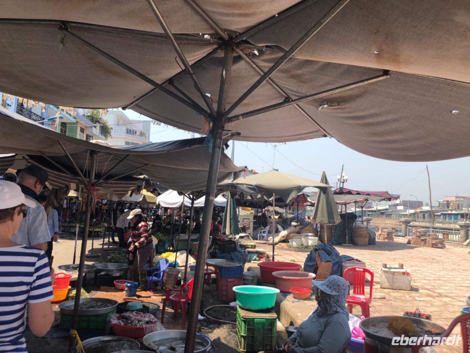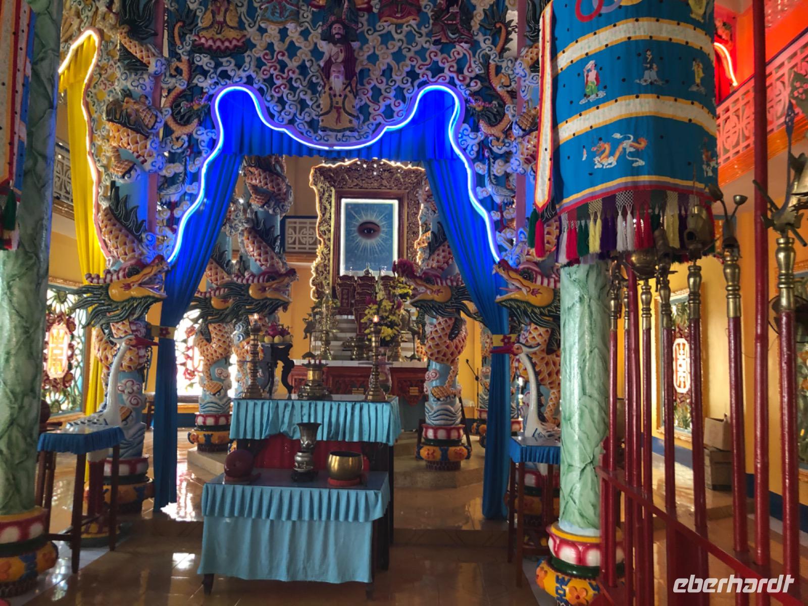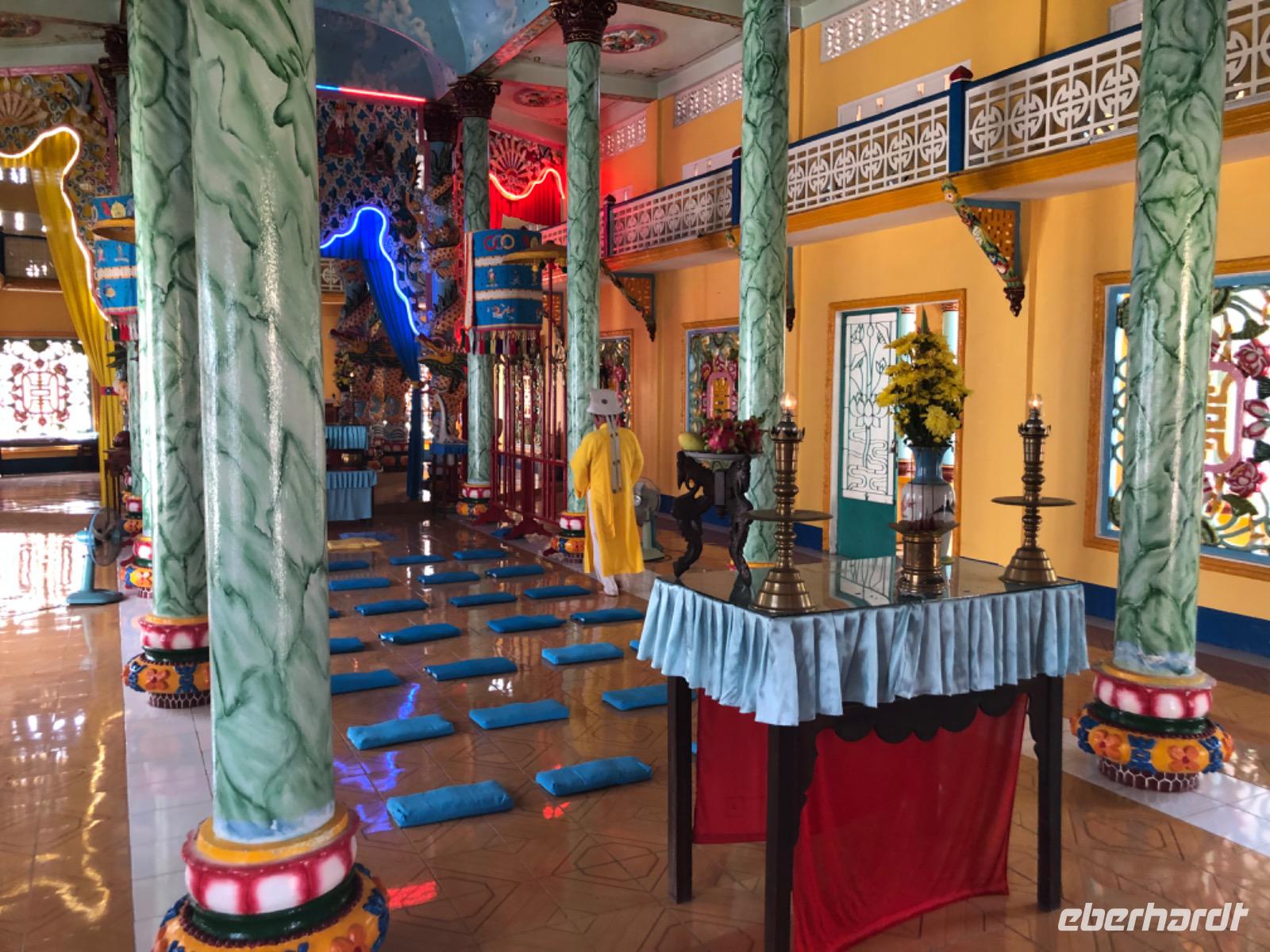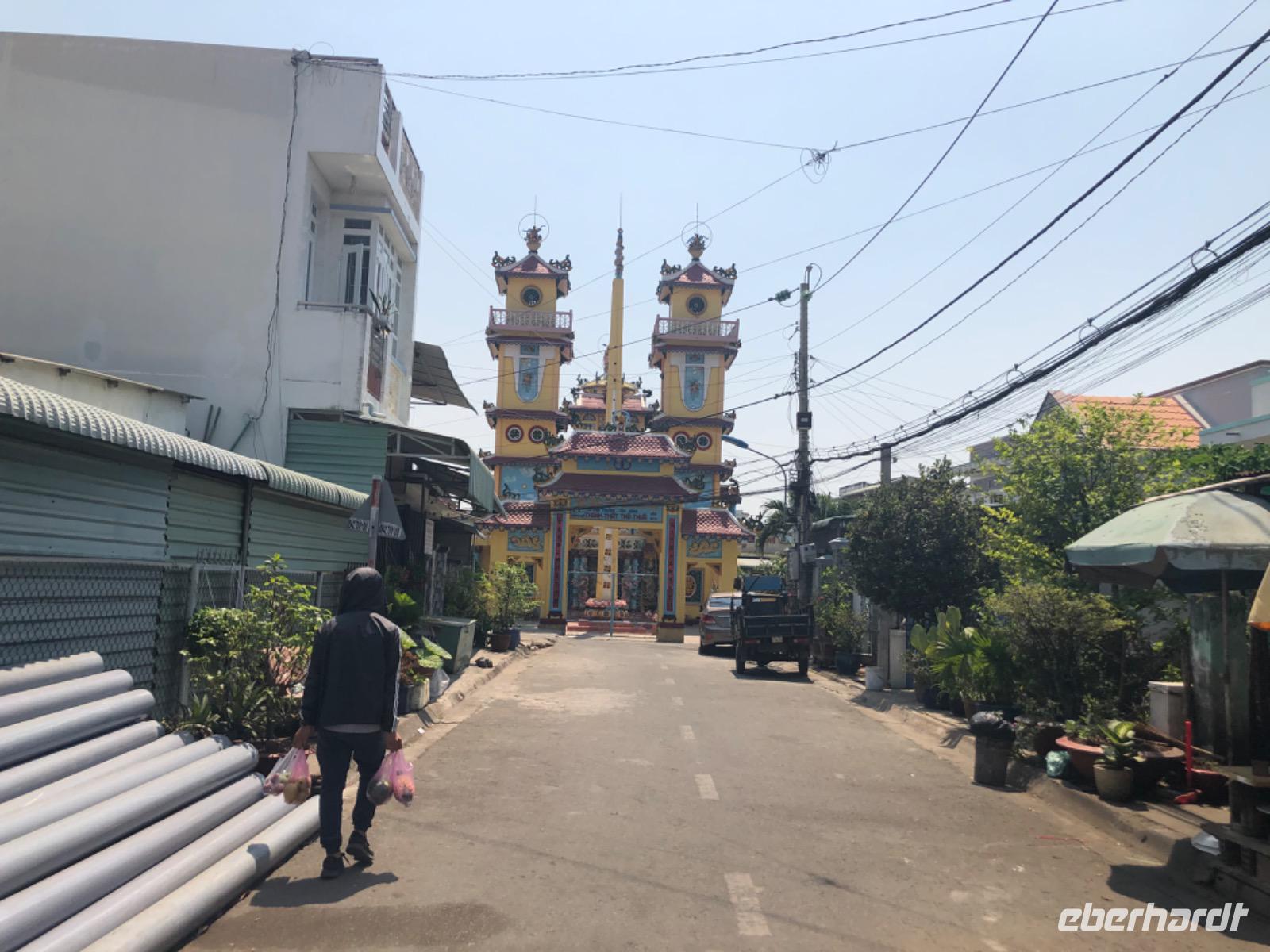 Wir unternehmen einen Spaziergang entlang der Felder und Hien erklärt uns, was hier angebaut wird. Mit kleinen Ruderbooten fahren wir zurück zum Schnellboot. Beim nächsten Stopp spazieren wir über einen Markt, wo viel Gemüse, aber auch Fisch und Frösche verkauft werden. Wir besuchen einen CaoDai Tempel und erfahren einiges über diesen uns unbekannten Glauben. Kurz kommen wir noch an einem Tempel vorbei, in dem ein Mönch ein Kinderheim eingerichtet hat. Hien erzählt uns, dass er sein Trinkgeld spart und an das Kinderheim spendet.