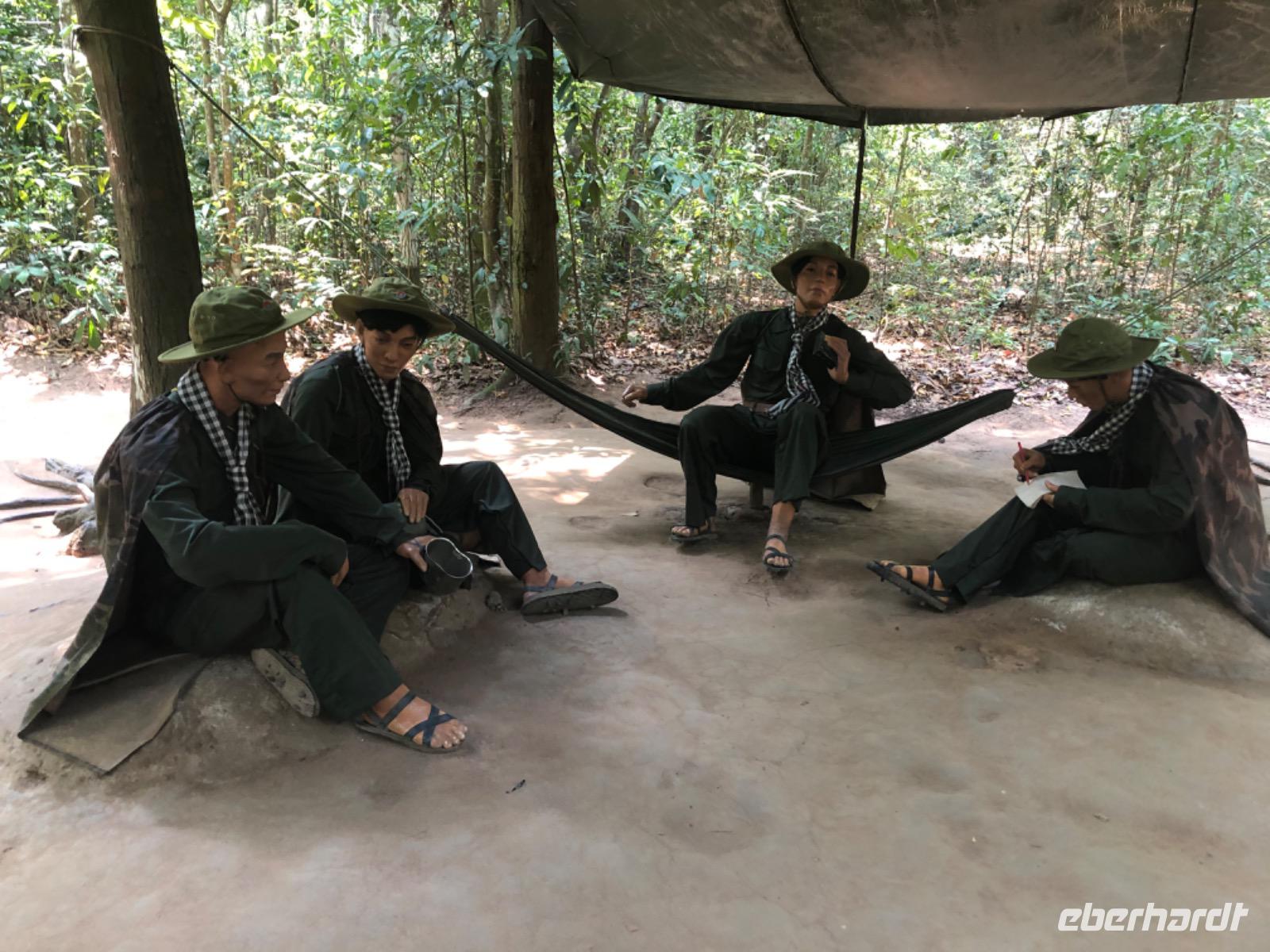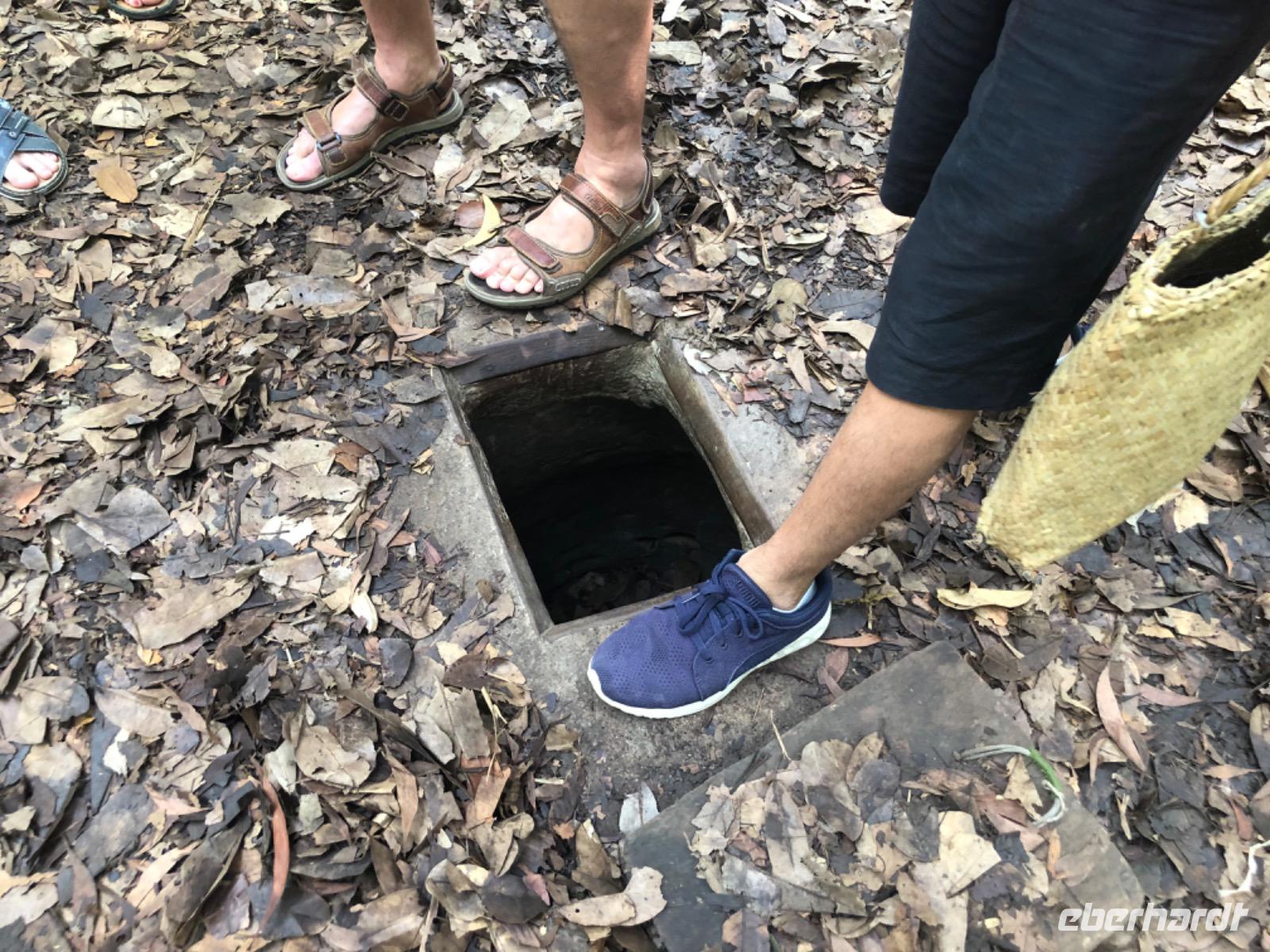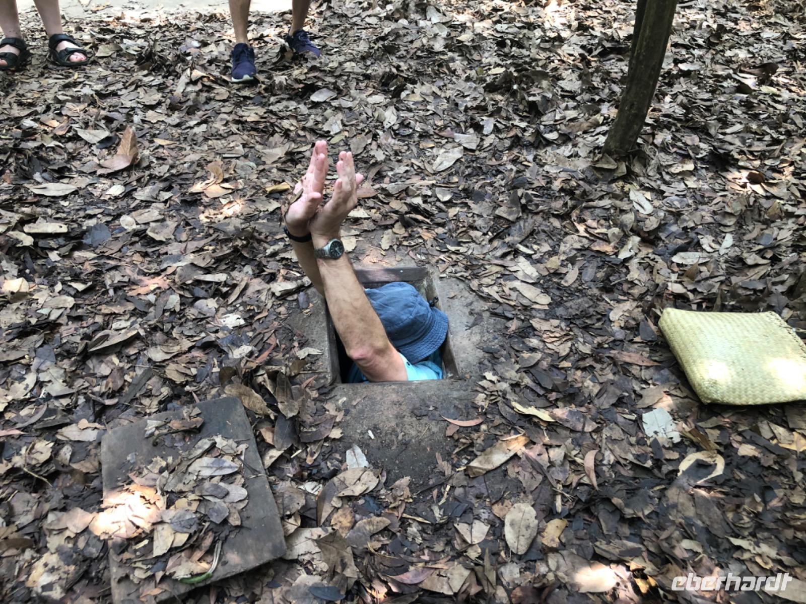 Während des Rundgangs sehen wir, wie versteckt die Eingänge zu den Tunneln waren. Einige von uns trauen sich sogar, sich in das schmale Loch hinab zu lassen. Nachfolgend sind noch viele Konstruktionen zu sehen, mit denen sich die Vietnamesen gegen die Angreifer verteidigten. Dazu gehören zum Beispiel Fallen am Boden, in denen vergiftete und angespitzte Bambusrohre auf den Feind lauerten. Aber auch eine Krankenstation und eine Werkstatt sind nachgestellt, so dass wir uns bildhaft vorstellen können, wie sich das unterirdische Leben abgespielt hat. Die Vietnamesen haben heutzutage eine überraschend entspannte Einstellung zu den Amerikanern und ihren Verbrechen. Es war eben Krieg, sagen sie.