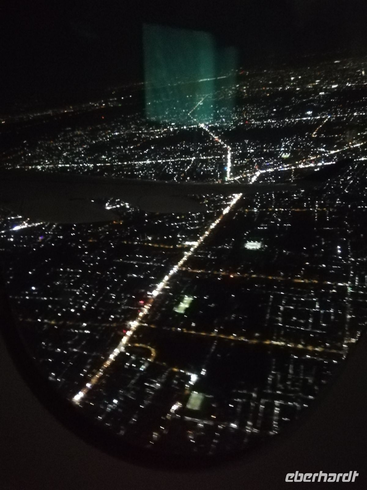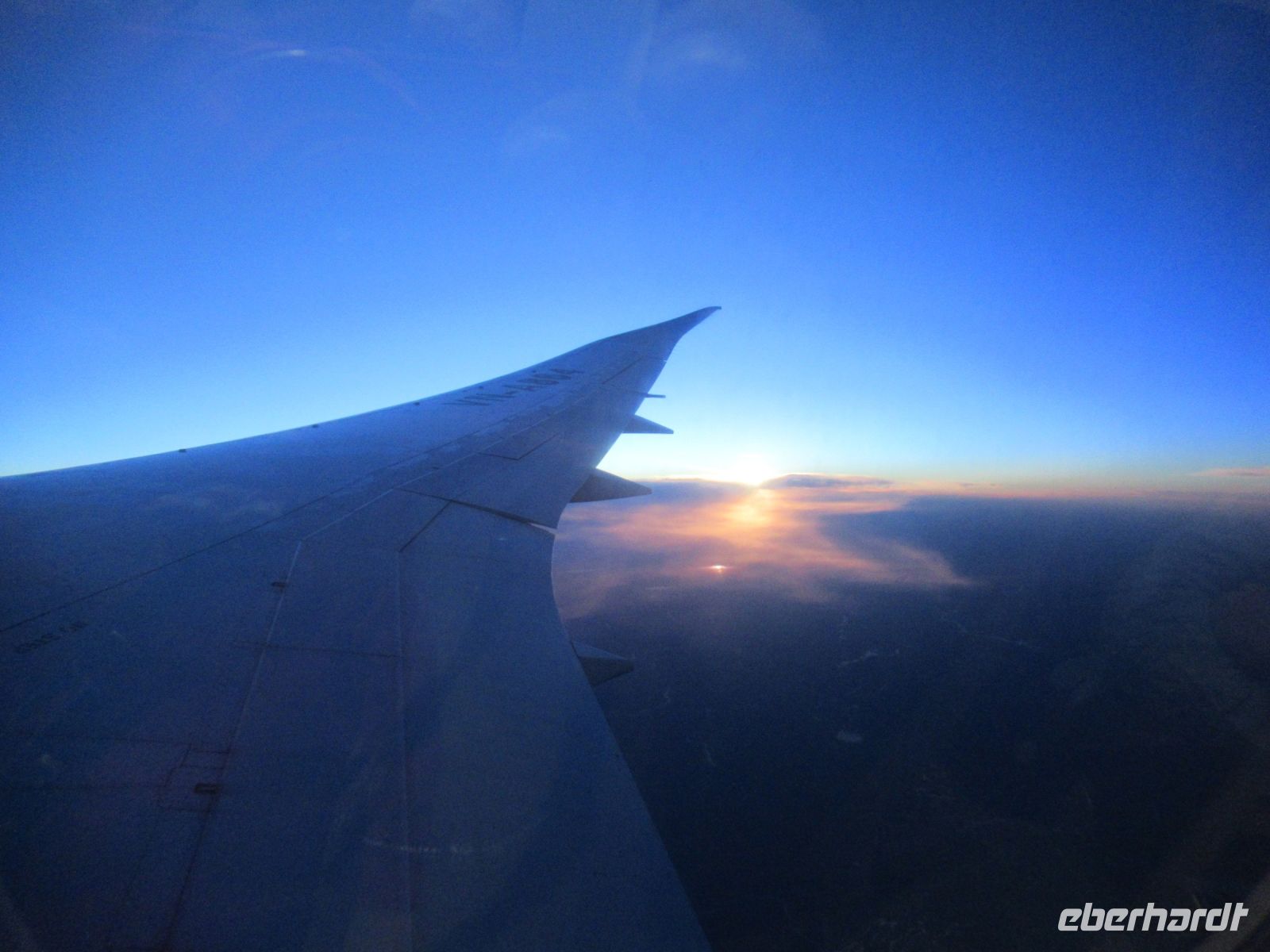 Die Crew serviert uns zwei leckere Mahlzeiten und wir versuchen etwas zu schlafen, aber die innere Uhr ist noch nicht so ganz auf die Nacht und die Essenszeiten eingestellt.