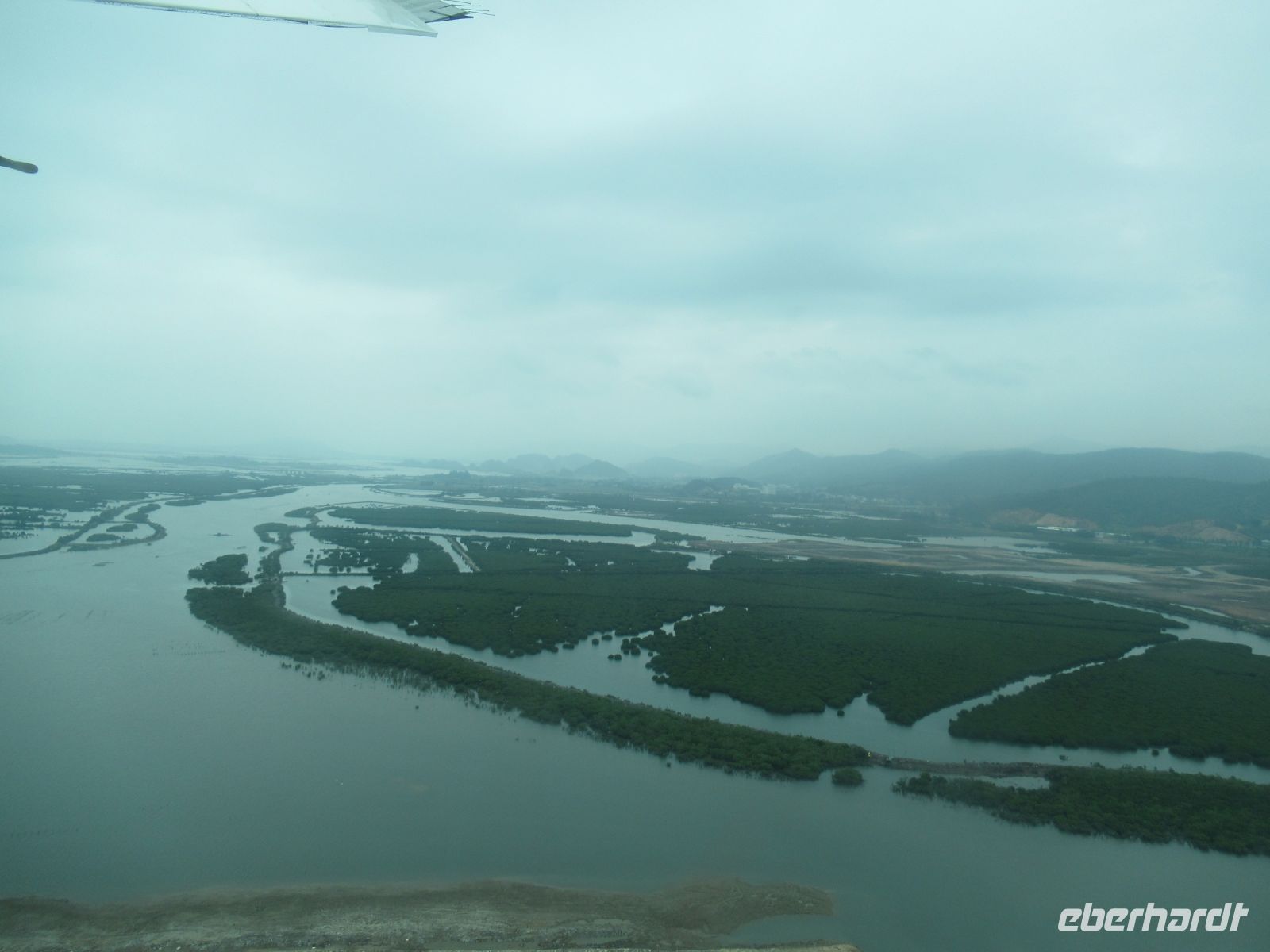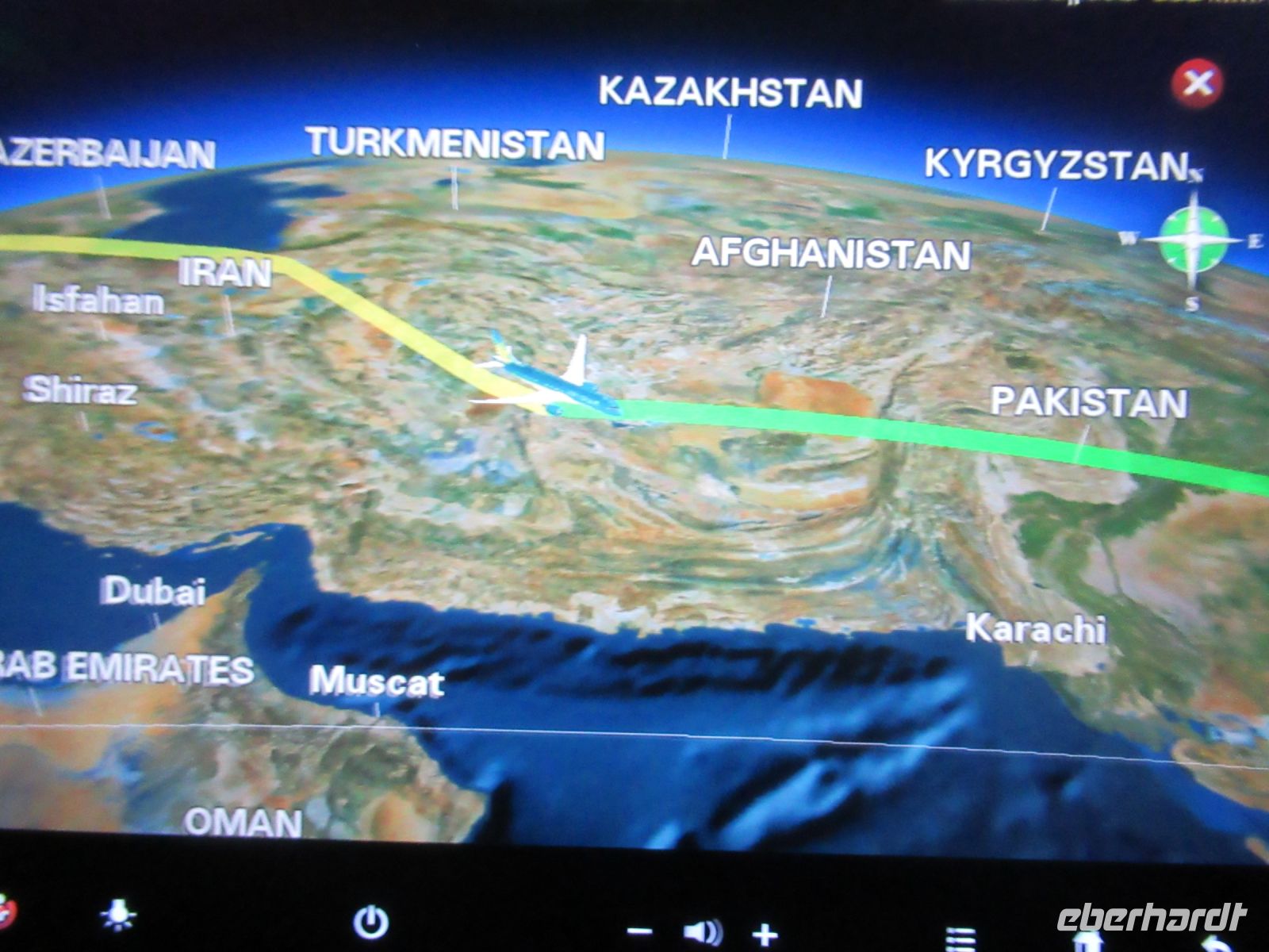 Der Flug ist pünktlich und um 14:00 Uhr heben wir ab. Die freundliche Crew - schlanke Damen in den türkisen langen Kleidern bringen schon etwas asiatische Stimmung. Wir fliegen knapp 9.000 km, Flugdauer knapp 11 Stunden quer durch den Kontinent, wo es am Land nicht mehr weiter geht…