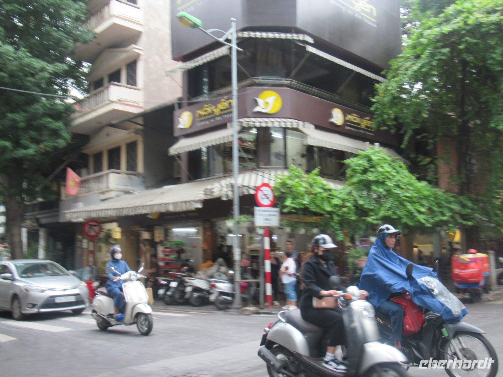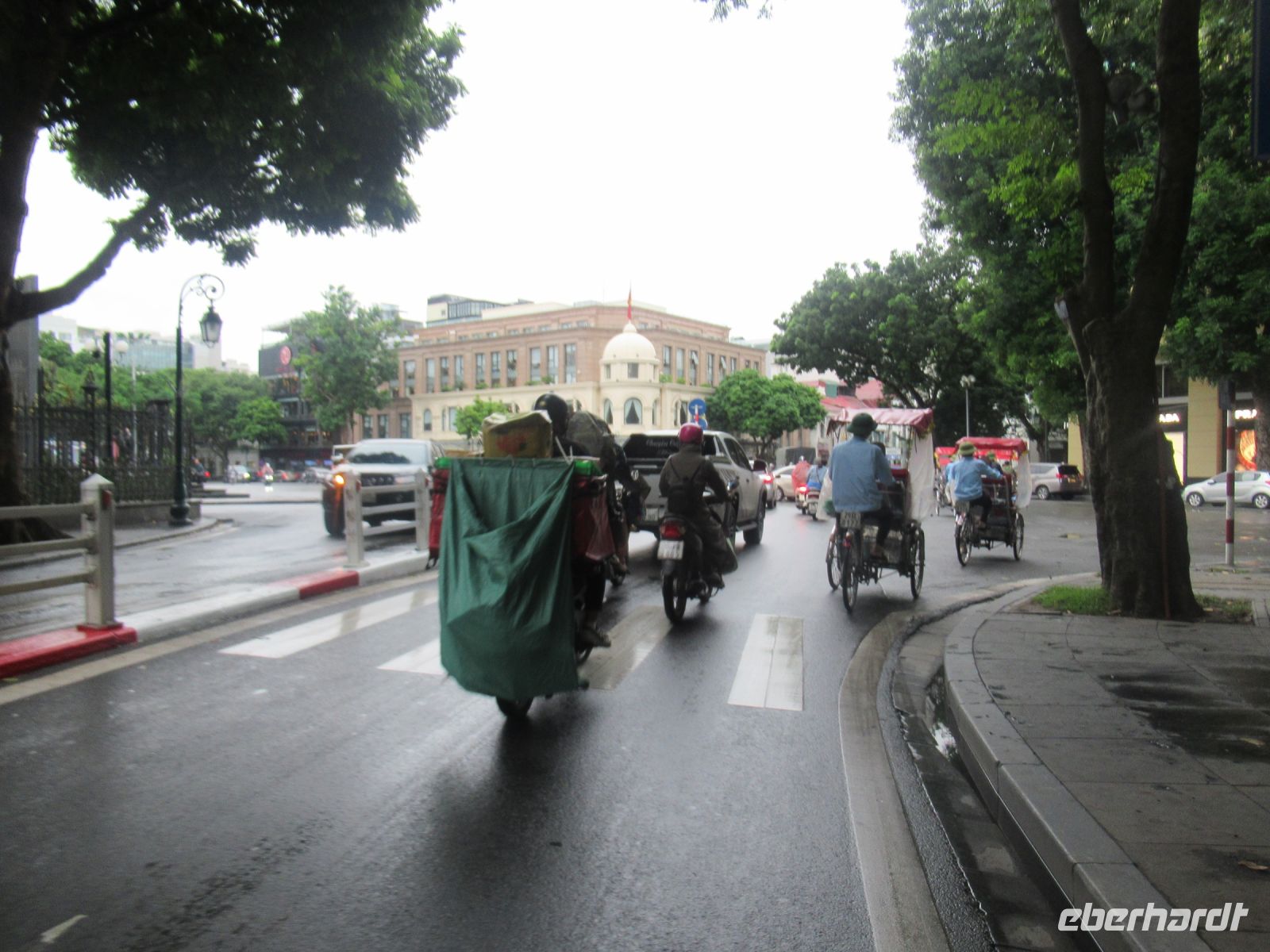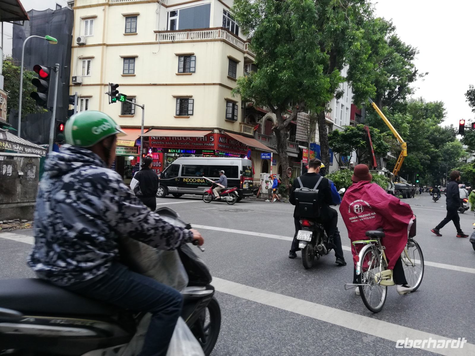 Der Bus ist auch schon da, nur Hanoi ist nicht sehr freundlich zu uns, es regnet und wir beobachten den schon berüchtigten Verkehr in Hanoi. Motorräder aber auch viele Autos sind auf den Straßen, die Motor-radfahrer lassen ich aber von dem Regen nicht entmutigen.