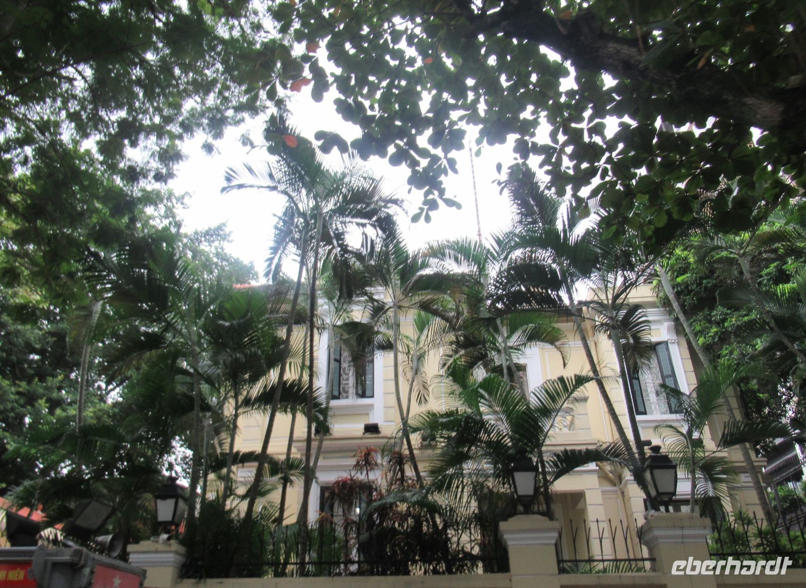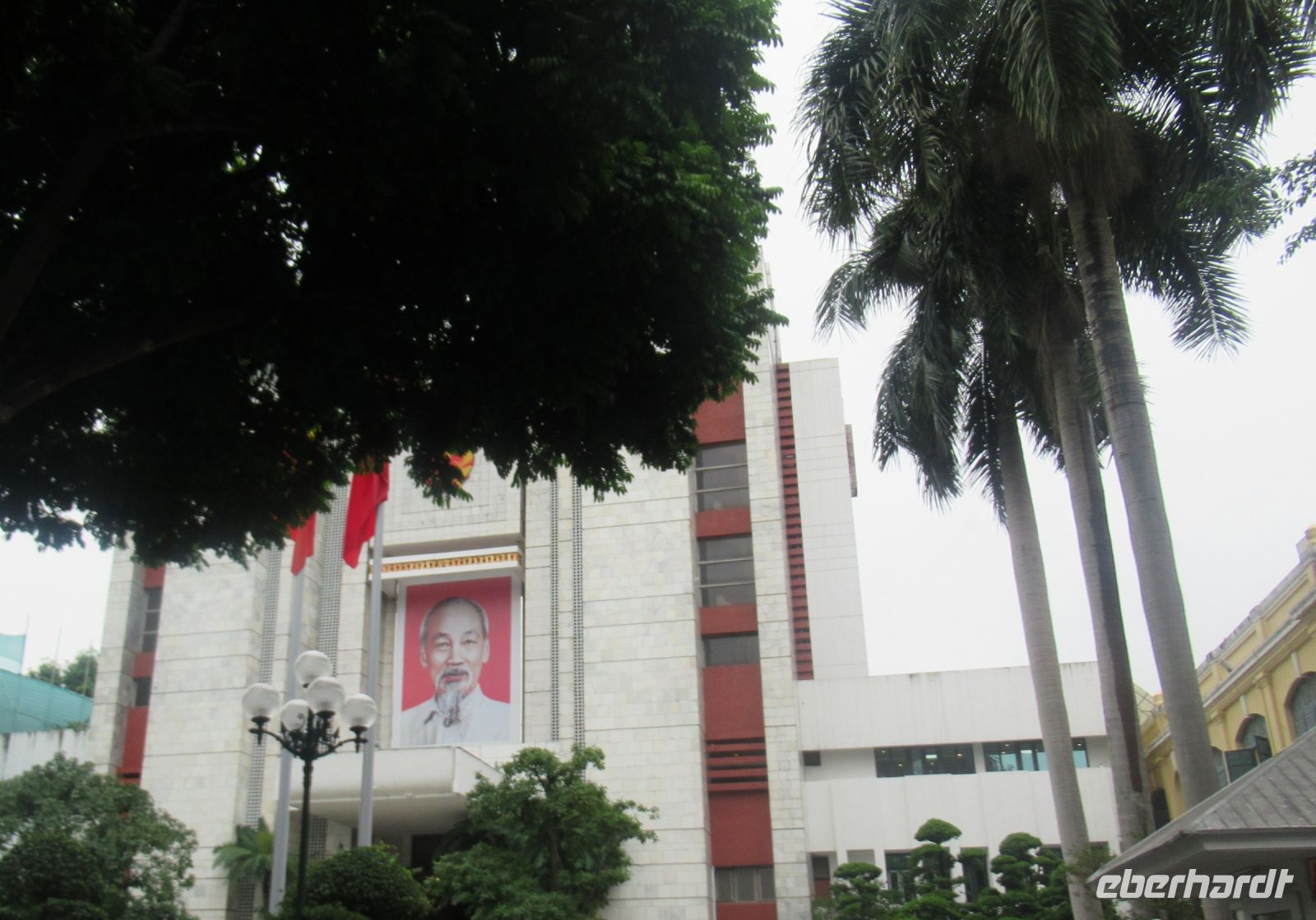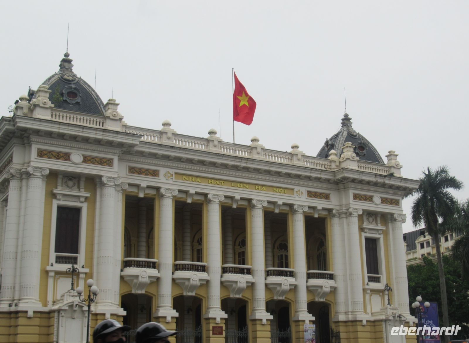 Nach der Rikscha Fahrt kommt etwas Sonne raus und wir laufen zu Fuß mit Chau an dem wunderschönen Gebäude der Hanoi Opera vorbei, durch die Parkanlage mit Ho-Chi-Ming Statue und bald beschließen wir, ins Hotel zu fahren und zu prüfen, ob wir evtl. doch etwas früher einchecken können. Leider ging es noch nicht, aber wir konnten schon die Formalitäten erledigen und die Koffer abgeben.