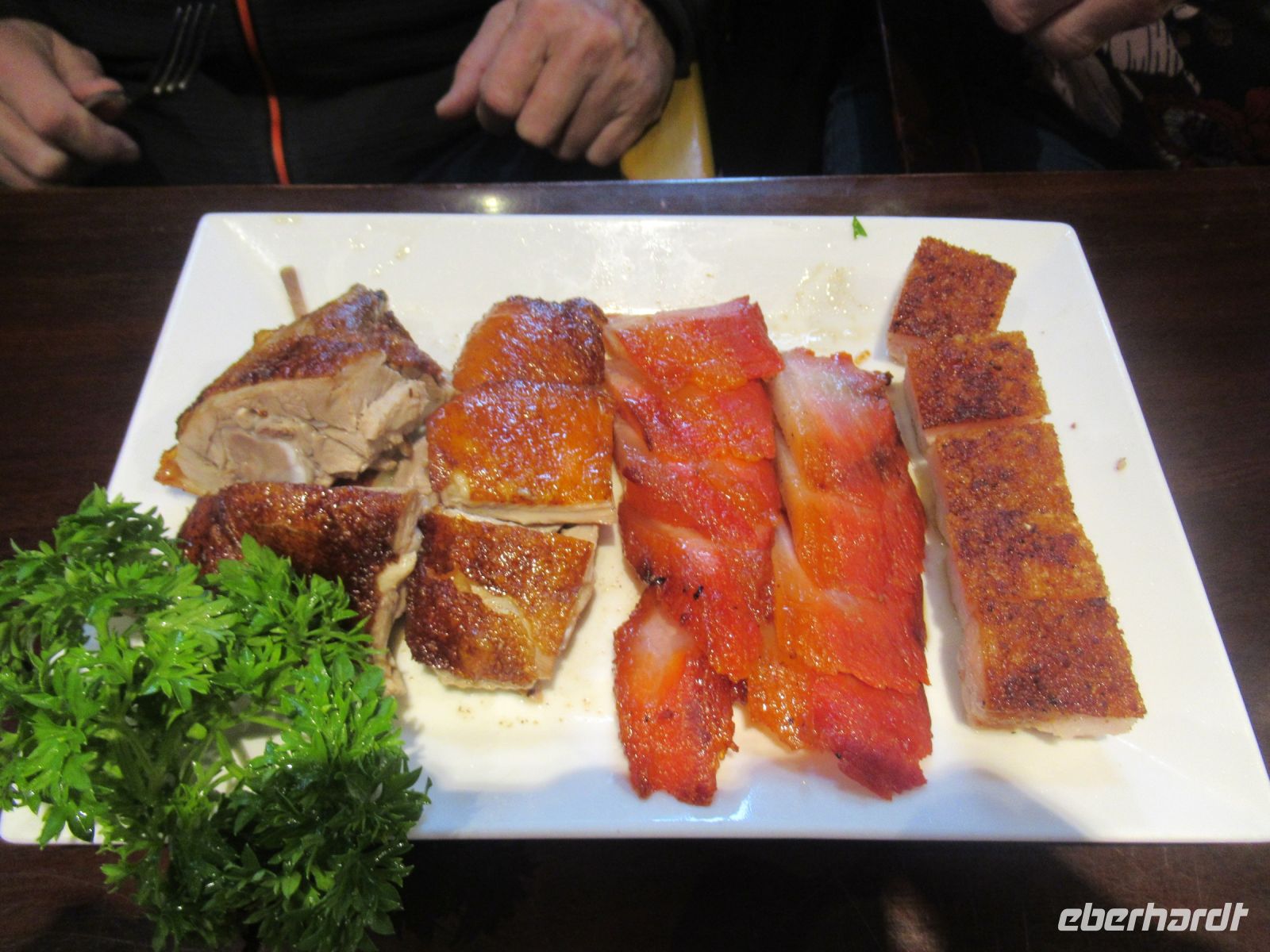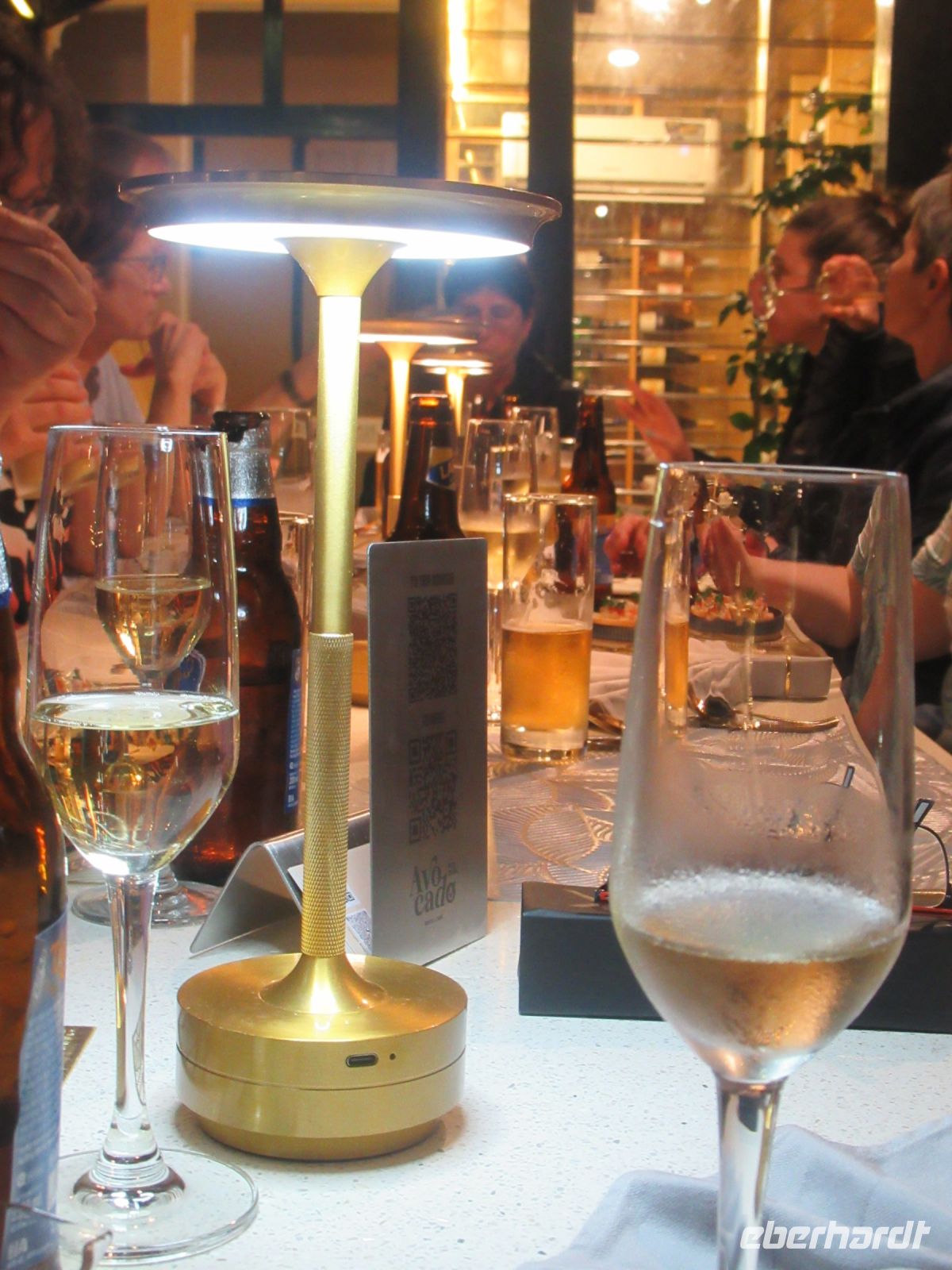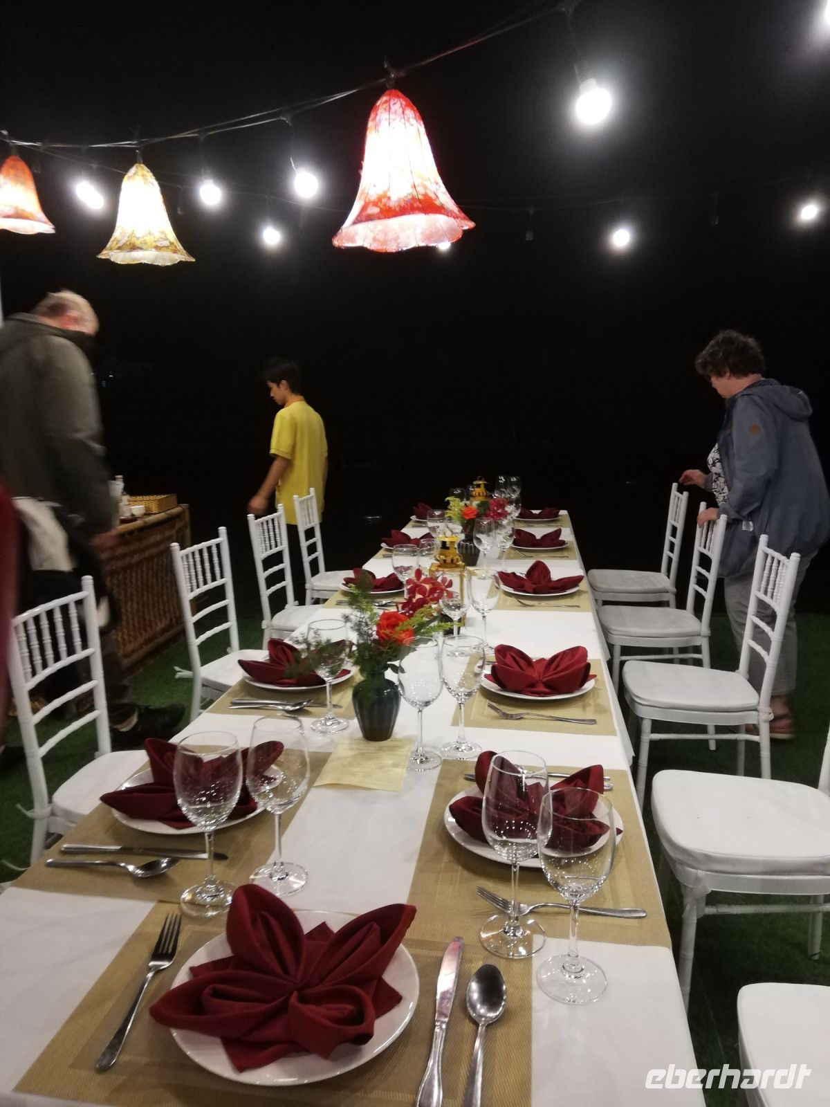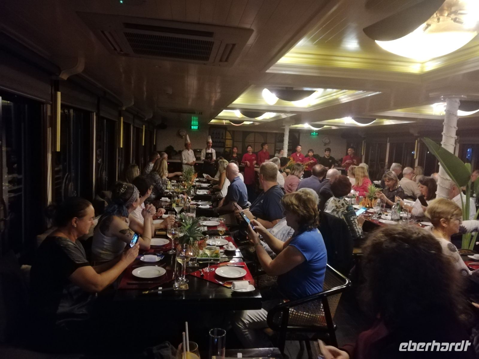 Wir werden an einer Tafel platziert und diesmal gibt es Entenbrust, Fisch oder vegetarische Speisen.