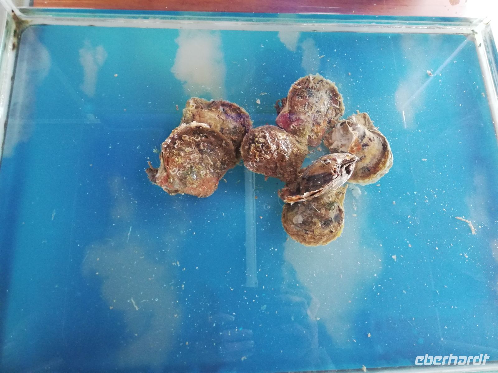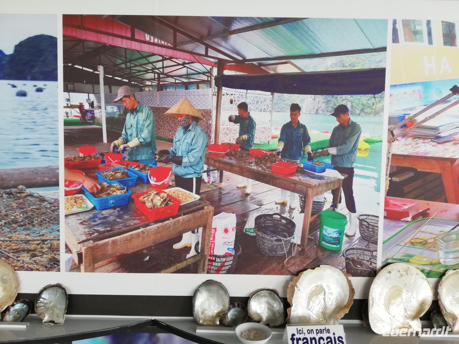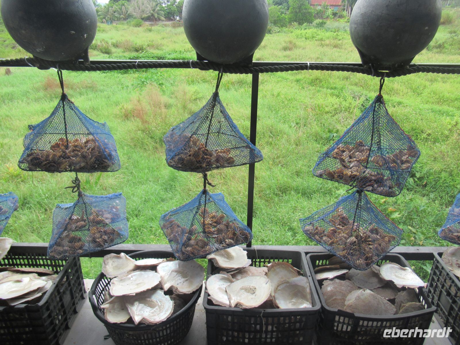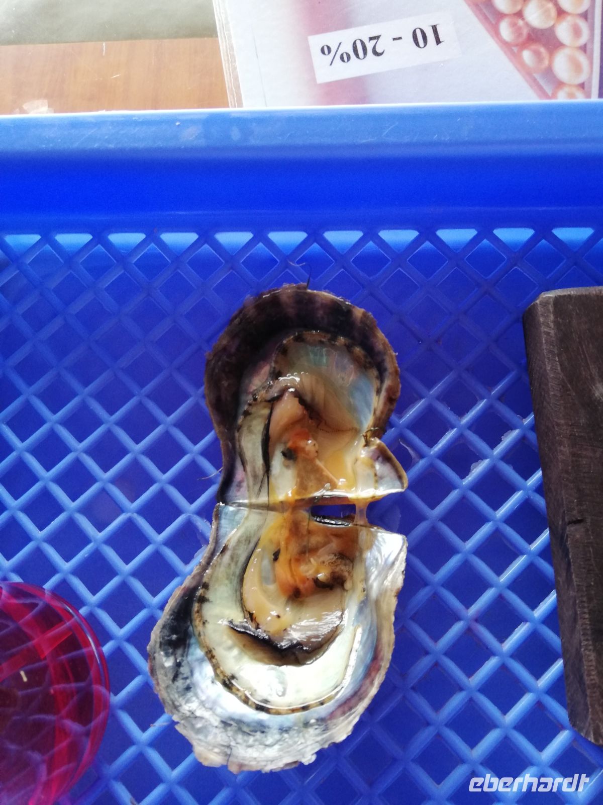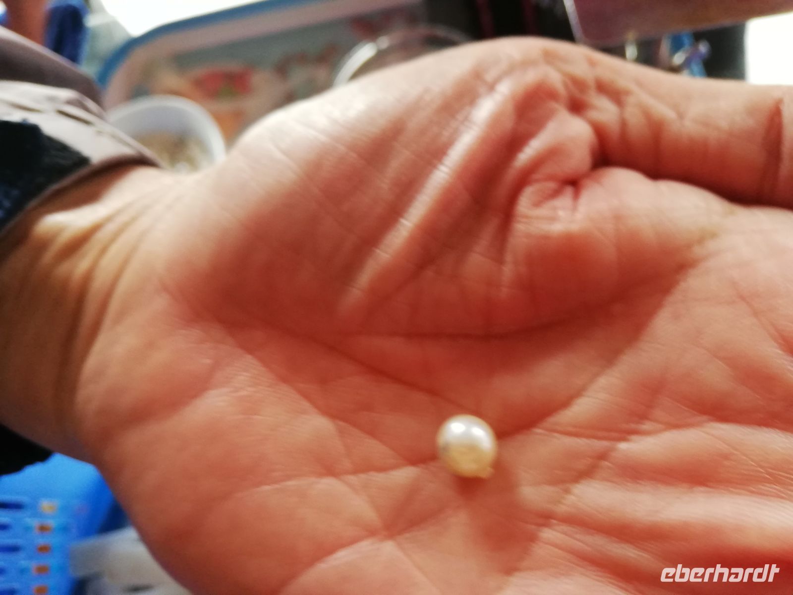 Auf dem Weg besuchen wir noch eine Perlenzuchtstation. Hier bekommen wir erklärt und gezeigt, wie Perlen gezüchtet werden. Man setzt den Muscheln spezielle Kügelchen ein – die umschließt die Muschel und dann wachsen Perlen. Es dauert zwei bis drei Jahren bis sich die Perlmuttschicht bildet und die Perle nachwächst.