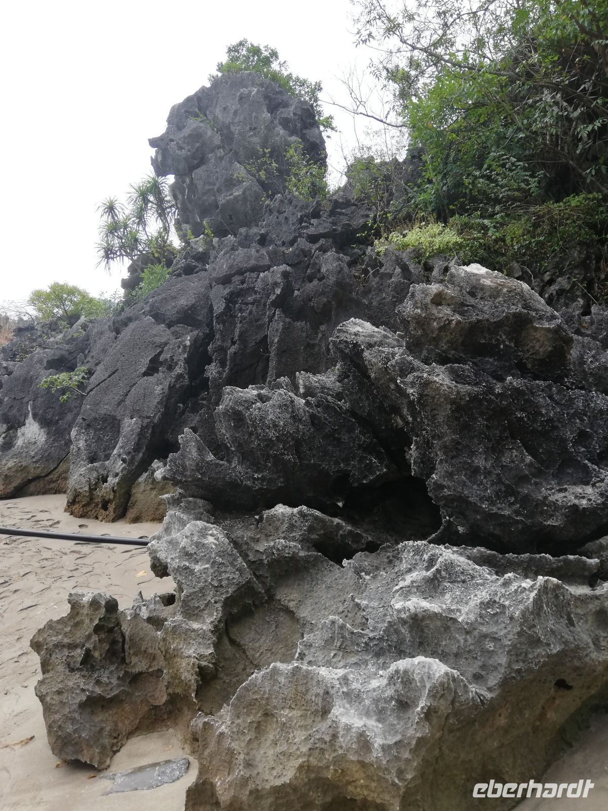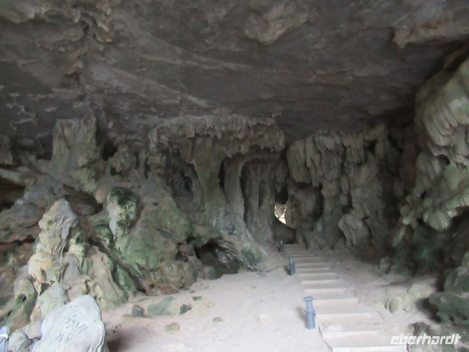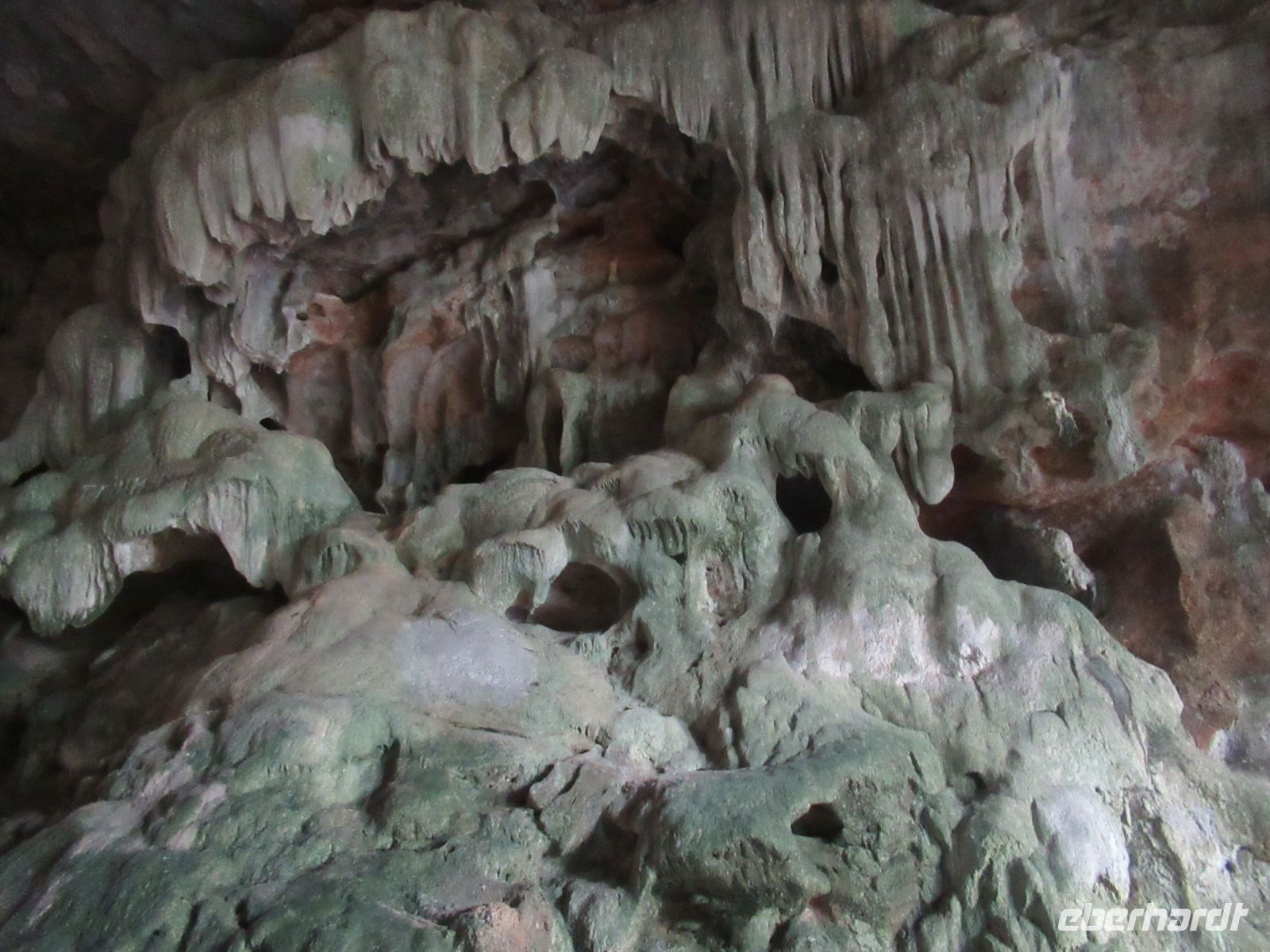Durch eine kleine Tropfsteinhöhle mit Stalagmiten, Stalaktiten und Felsenformationen kommen wir an das andere Strandufer wo wir die zweite Gruppe trafen. Es waren nur noch wenige im Wasser, es war auch recht kühl. Etwas schade, dass man die beiden Varianten nicht kombinieren konnte. Das haben manche Gäste bedauert, da die Kajaktour auch interessant wäre und zeitlich hätte man es schaffen können.