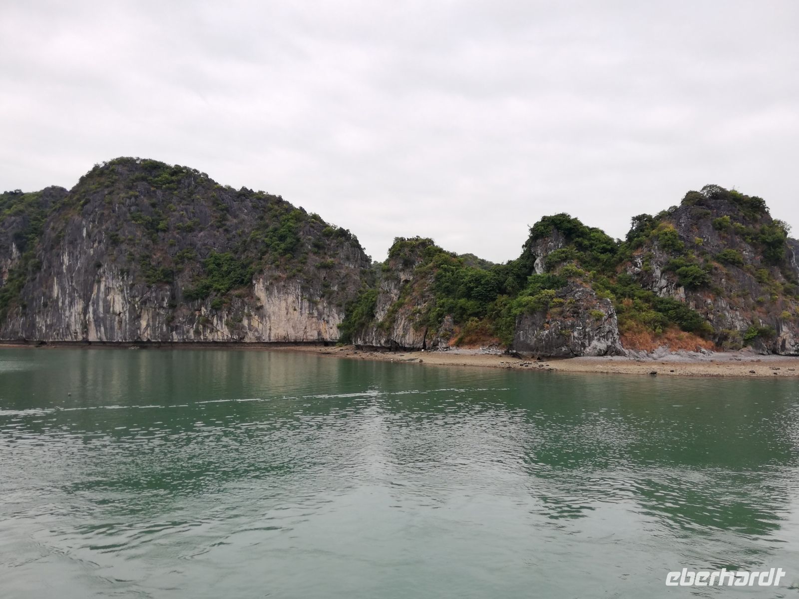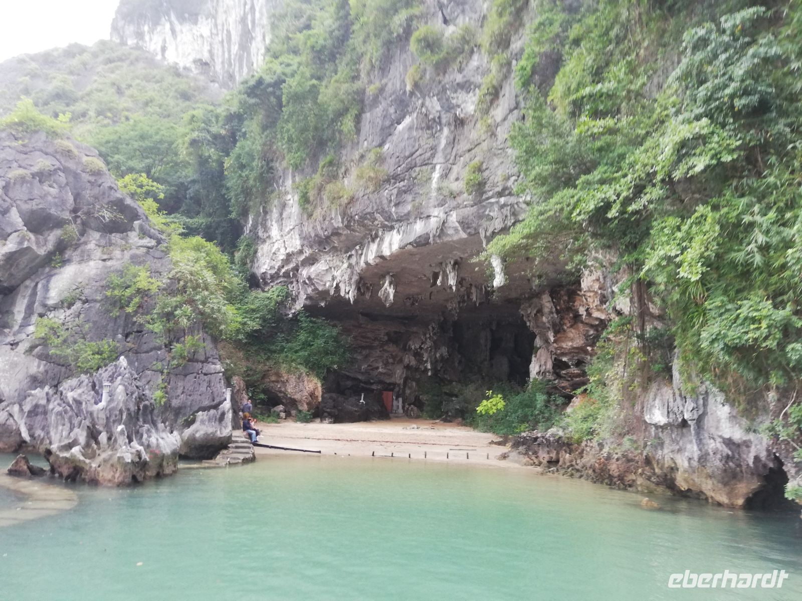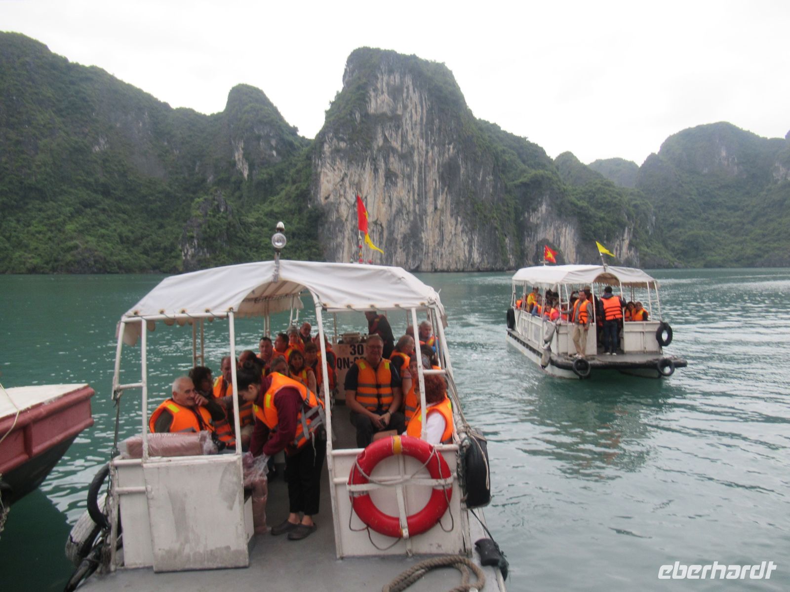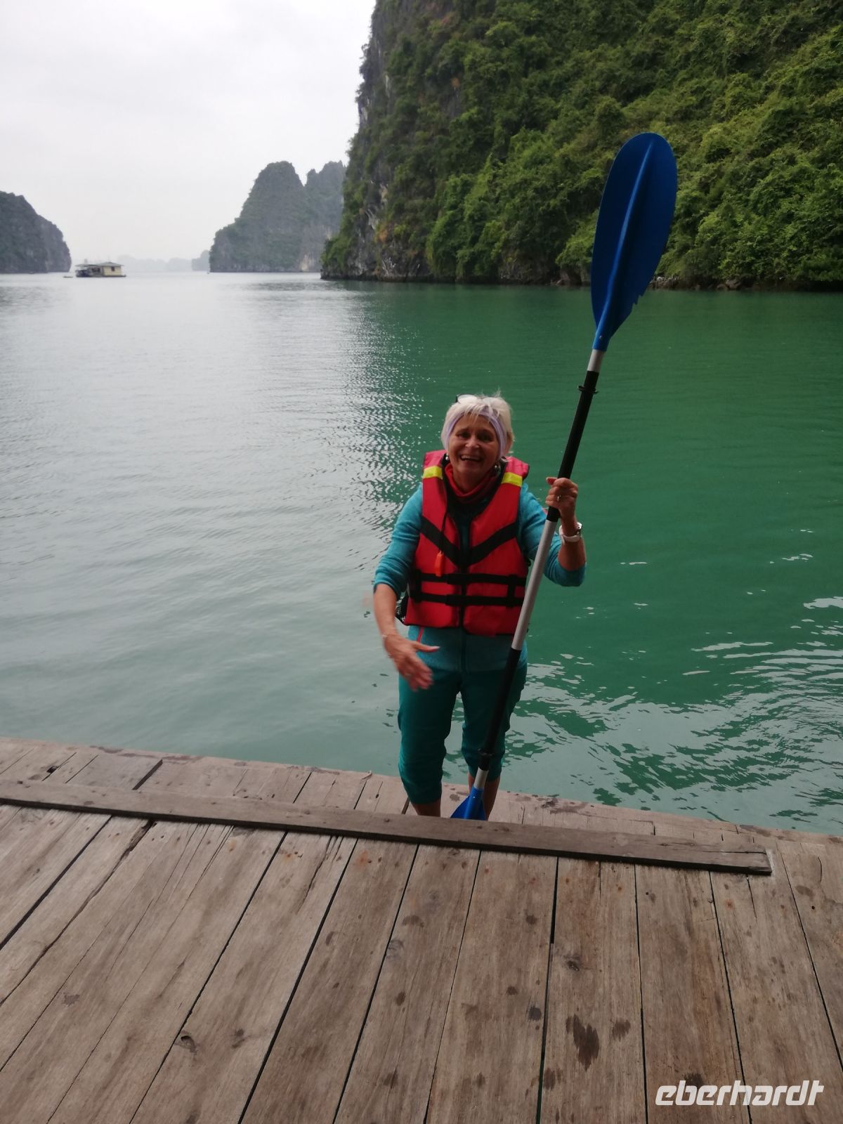 Nun schnell umziehen und auf das heutige Programm vorzubereiten. Wir steigen in die Tenderbote. Eine Gruppe hat sich für den Besuch der Höhle und Baden am Sandstrand entschieden, die Anderen für eine kleine Kajaktour in den Halong Gewässern. Wieder teilt sich die Gruppe – ich gehe mit den sportlichen Damen zum Kajak, die andere Gäste entscheiden sich für die Badevariante. Es war zwar nicht besonders lang, aber es war schon ein Erlebnis direkt am Wasser zu sein und die Berge zum Greifen nah zu sehen.