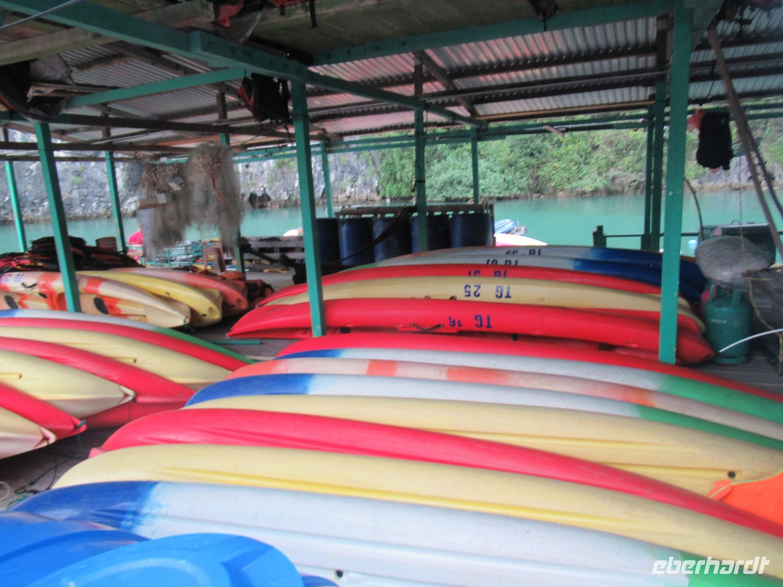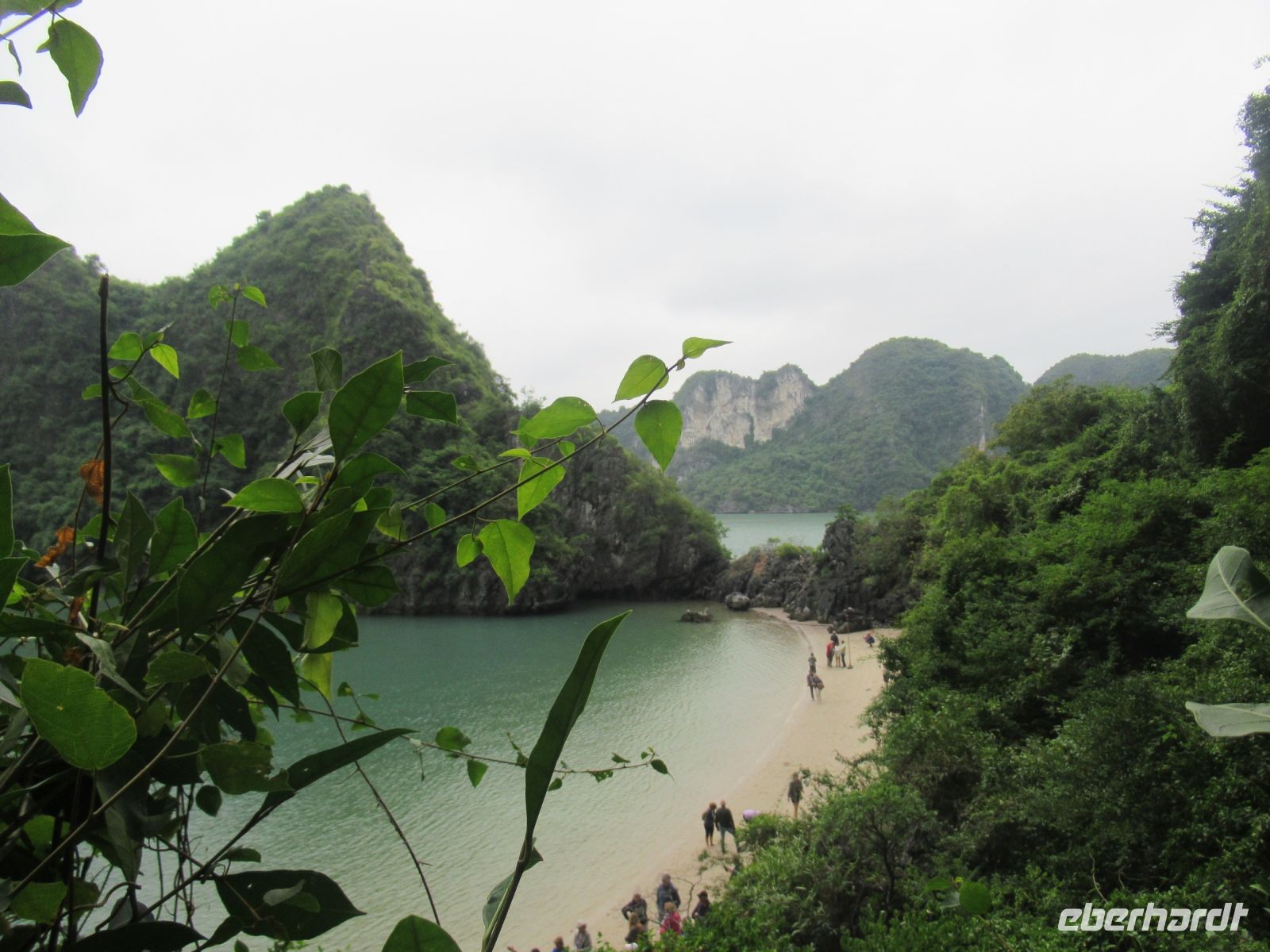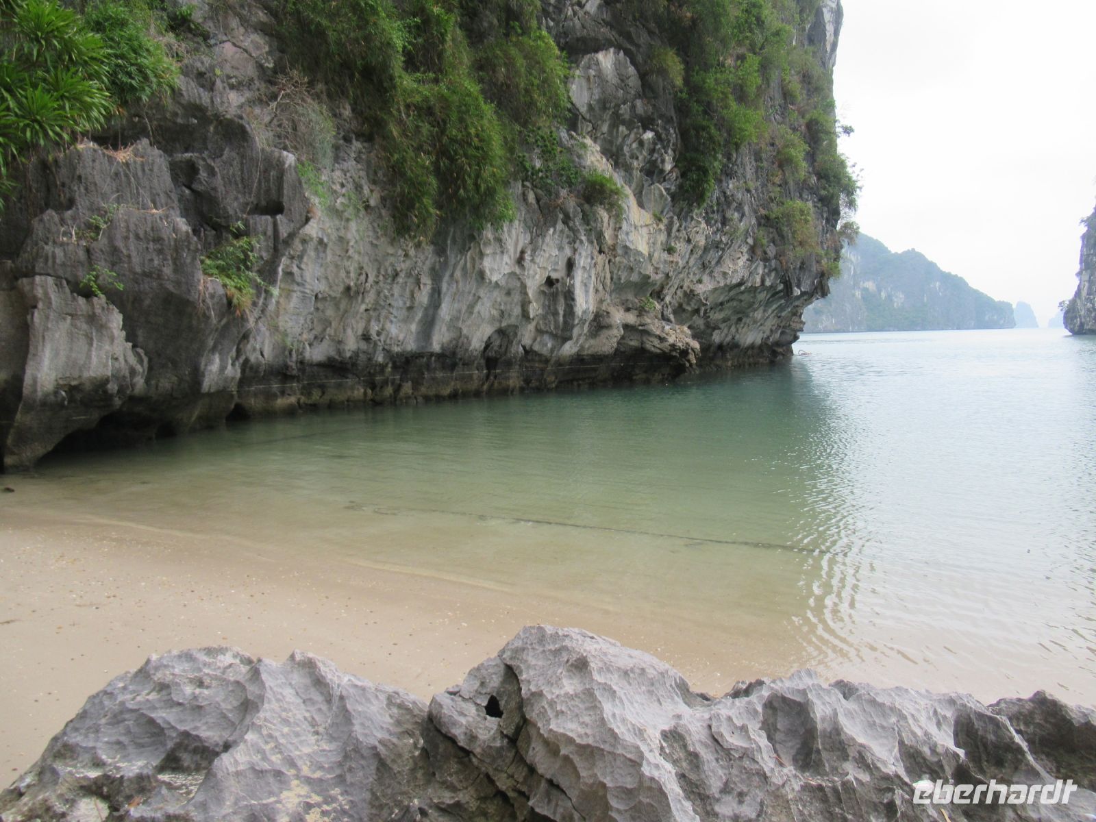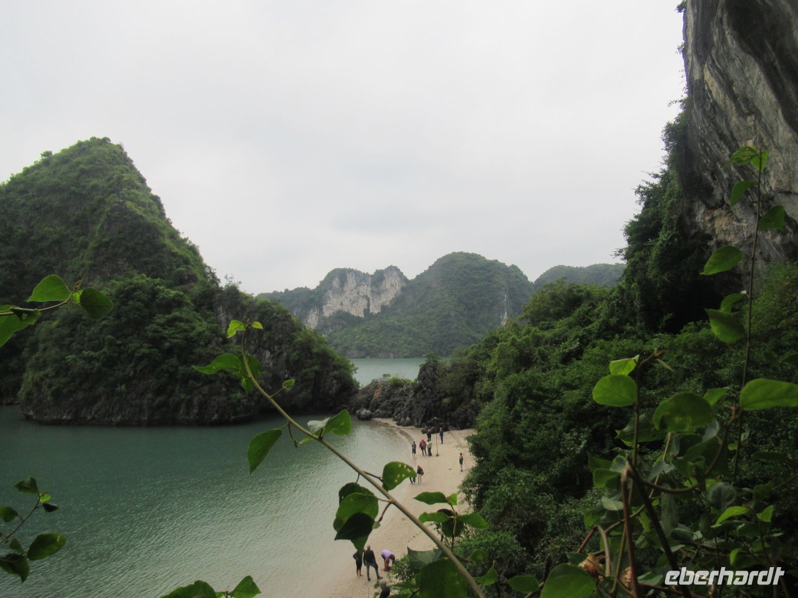 Nun schnell umziehen und auf das heutige Programm vorzubereiten. Wir steigen in die Tenderbote. Eine Gruppe hat sich für den Besuch der Höhle und Baden am Sandstrand entschieden, die Anderen für eine kleine Kajaktour in den Halong Gewässern. Wieder teilt sich die Gruppe – ich gehe mit den sportlichen Damen zum Kajak, die andere Gäste entscheiden sich für die Badevariante. Es war zwar nicht besonders lang, aber es war schon ein Erlebnis direkt am Wasser zu sein und die Berge zum Greifen nah zu sehen.