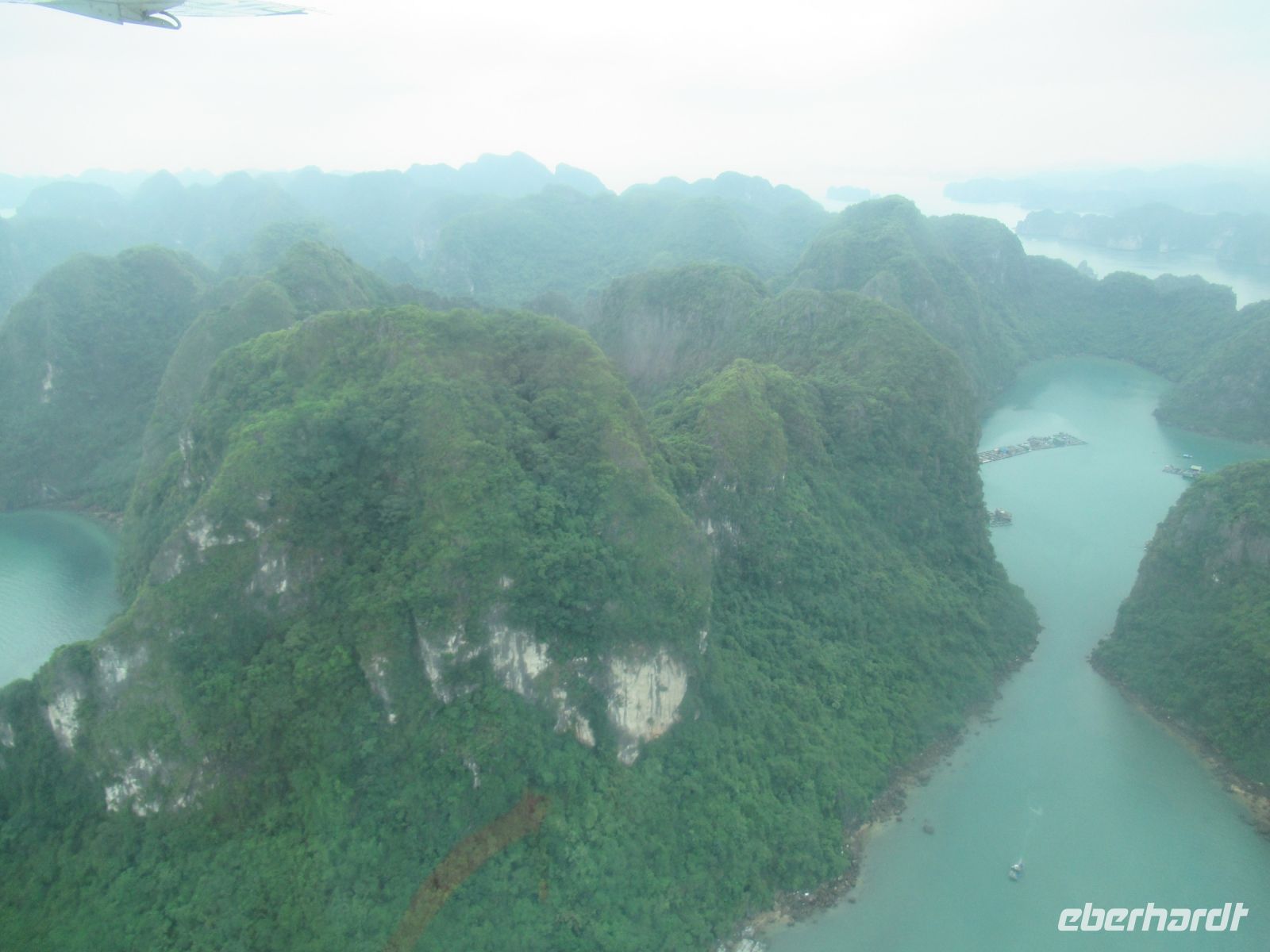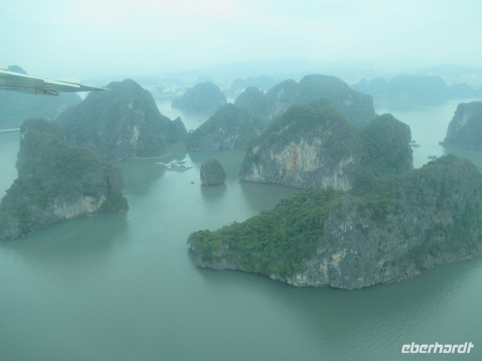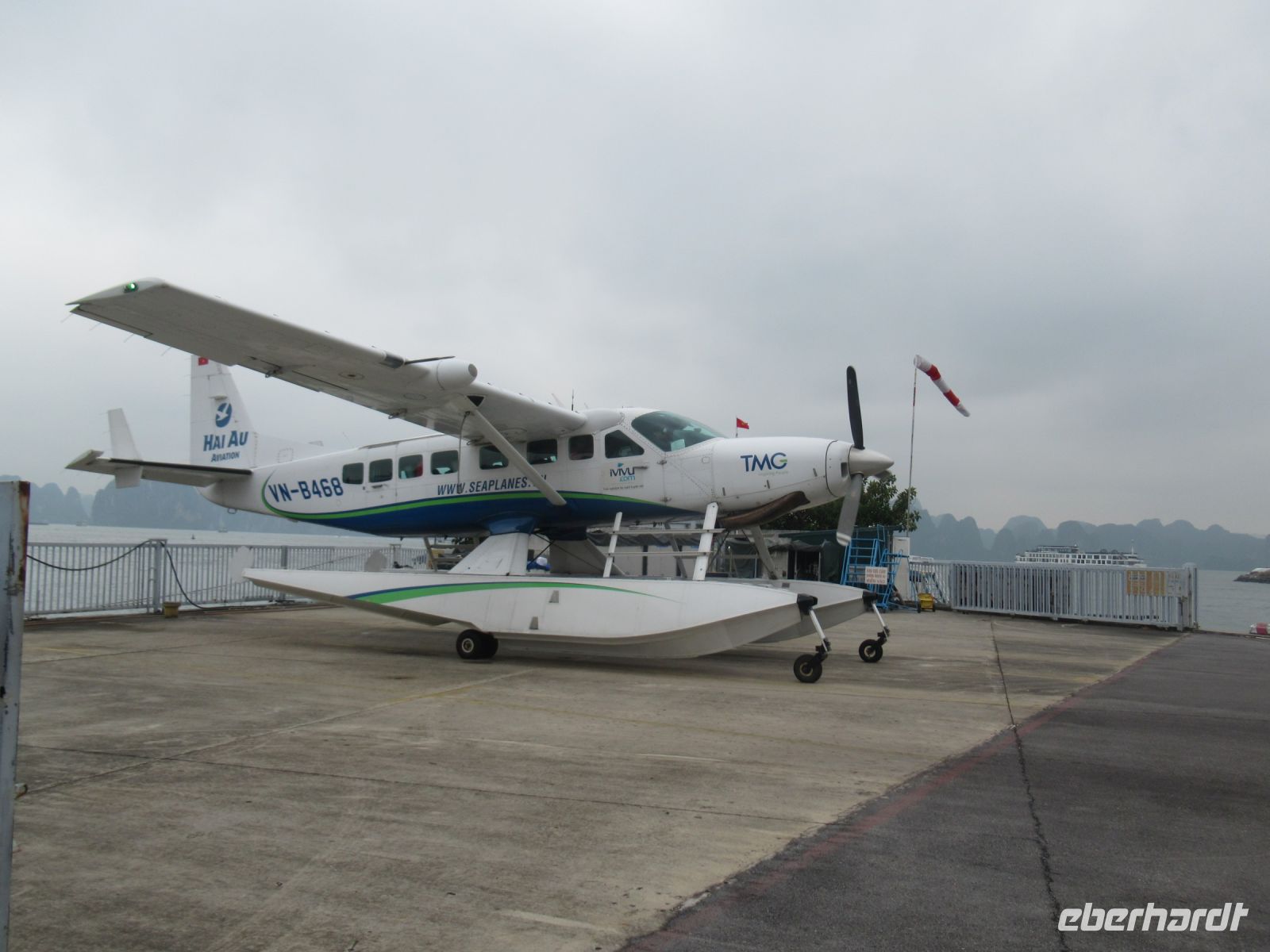 Aber wir haben noch einen „Joker“ einzulösen. Koffer in die Lobby stellen und bei erreichen des Festlandes geht es auf die Waage… nein, es wird jetzt nicht geprüft, ob wir nach dem guten Essen zugenommen haben, sondern beim Wasserflugzeug ist es wichtig, dass das Gesamtgewicht eingehalten wird. Wir wollen letztendlich fliegen und nicht schwimmen. Also wird die Gruppe wieder auf zwei Flugzeuge verteilt und wir dürfen beobachten, wie die Ersten über die Halong Bucht abheben. Voller Begeisterung kommt die erste Gruppe zurück und jetzt geht es für uns ab in die Lüfte. Ein wahnsinniges Erlebnis, diese Landschaft noch einmal von oben zu sehen.