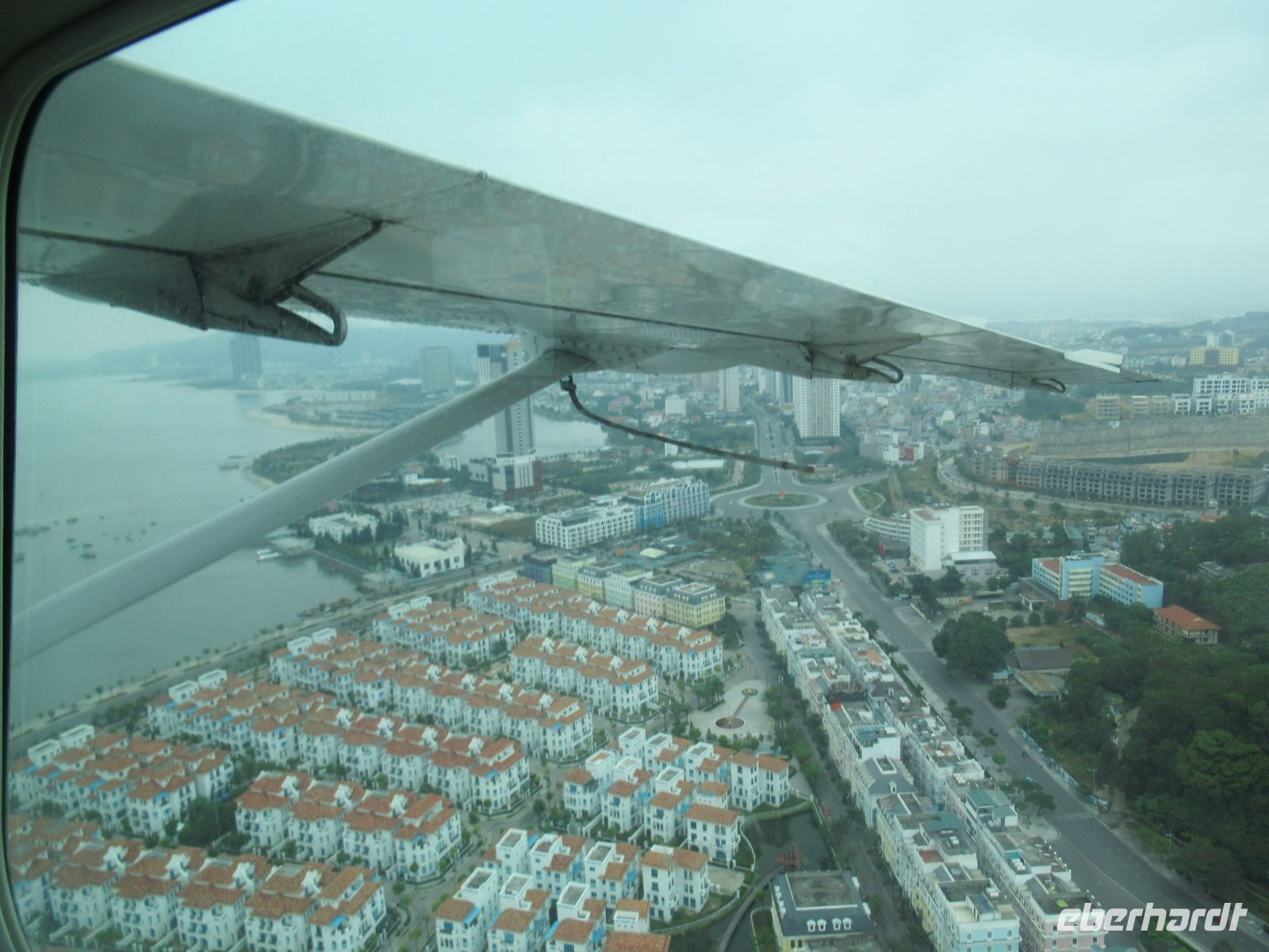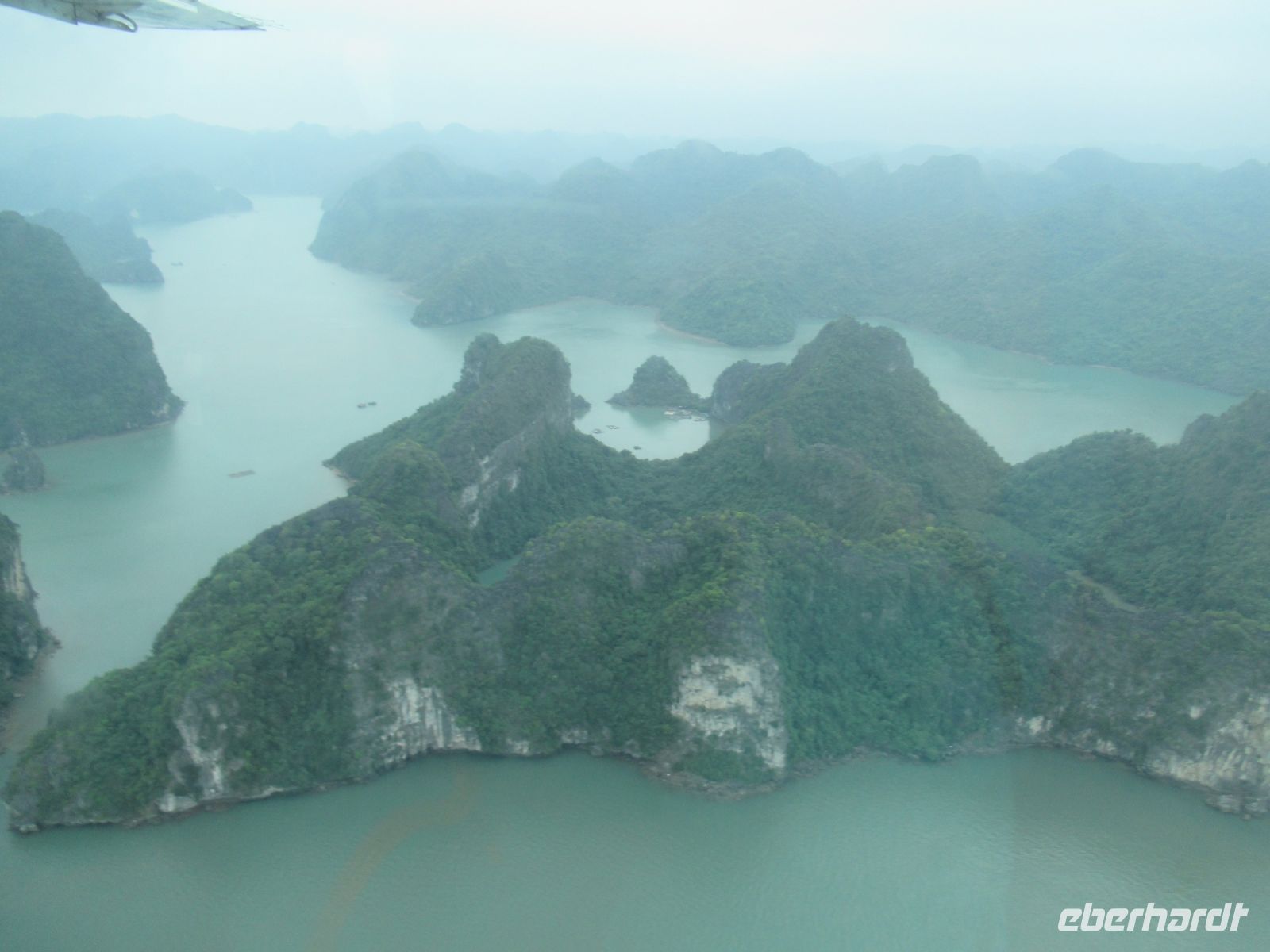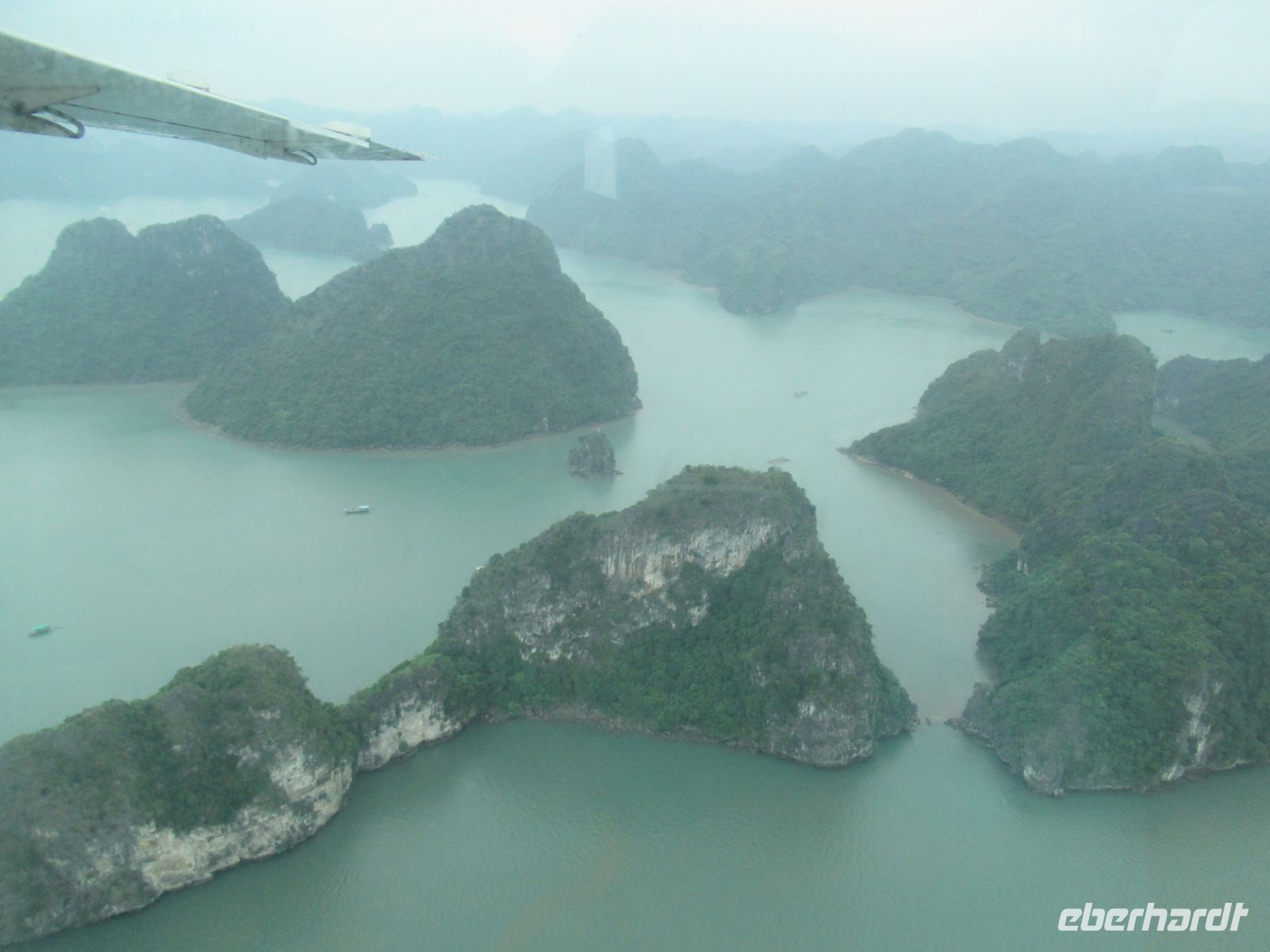 Aber wir haben noch einen „Joker“ einzulösen. Koffer in die Lobby stellen und bei erreichen des Festlandes geht es auf die Waage… nein, es wird jetzt nicht geprüft, ob wir nach dem guten Essen zugenommen haben, sondern beim Wasserflugzeug ist es wichtig, dass das Gesamtgewicht eingehalten wird. Wir wollen letztendlich fliegen und nicht schwimmen. Also wird die Gruppe wieder auf zwei Flugzeuge verteilt und wir dürfen beobachten, wie die Ersten über die Halong Bucht abheben. Voller Begeisterung kommt die erste Gruppe zurück und jetzt geht es für uns ab in die Lüfte. Ein wahnsinniges Erlebnis, diese Landschaft noch einmal von oben zu sehen.