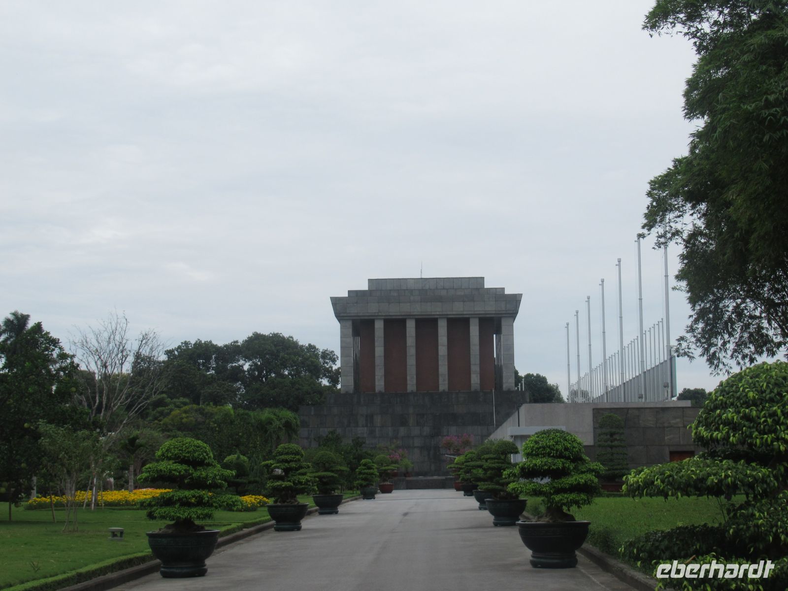 Wir betrachten das Mausoleum am Ba-Dinh-Platz, das 1975 fertig gestellt wurde und wo er einbalsamiert ist nur von außen. Auf den Seiten des Ho Chi Minh-Mausoleums sind zwei Inschriften zu sehen: (über-setzt) „Lang lebe die Sozialistische Republik Vietnam“ und „Nichts ist wertvoller als Unabhängigkeit und Freiheit“. Hier an dieser Stelle verlas der Präsident Ho Chi Minh 1945 die Unabhängigkeitserklärung Viet-nams.