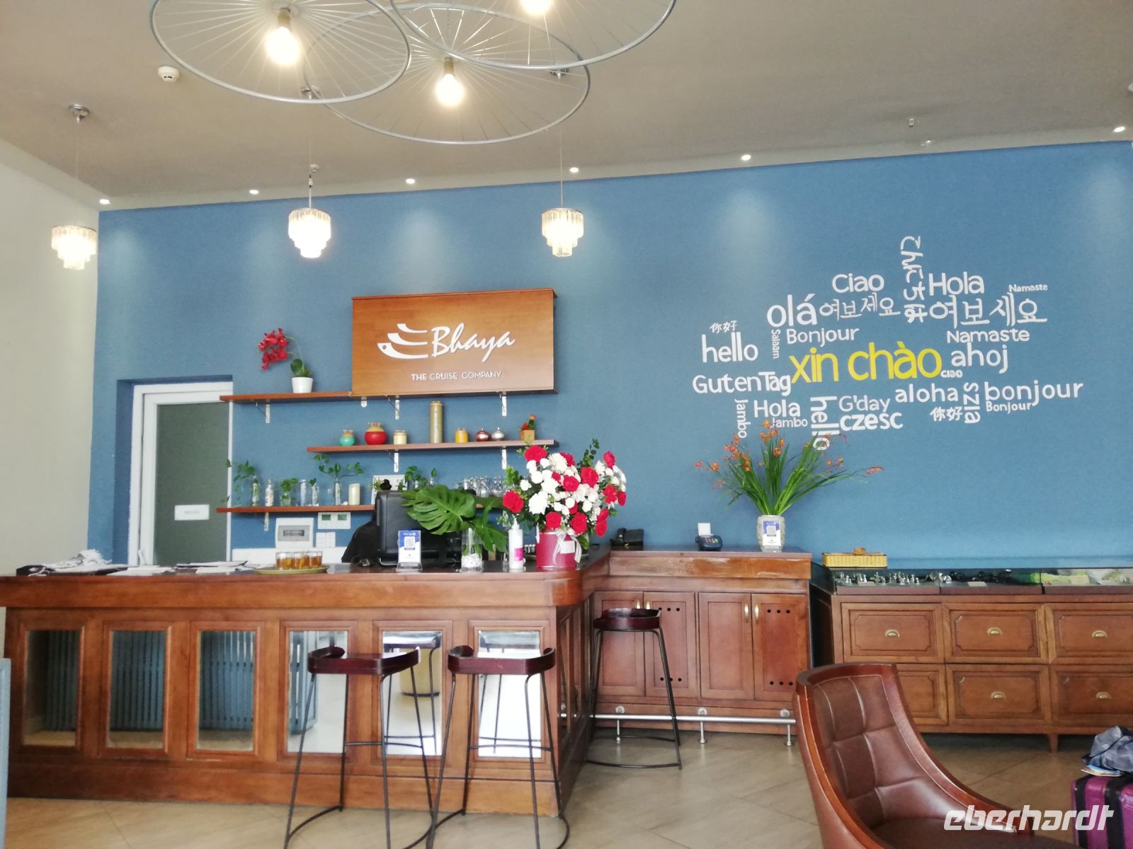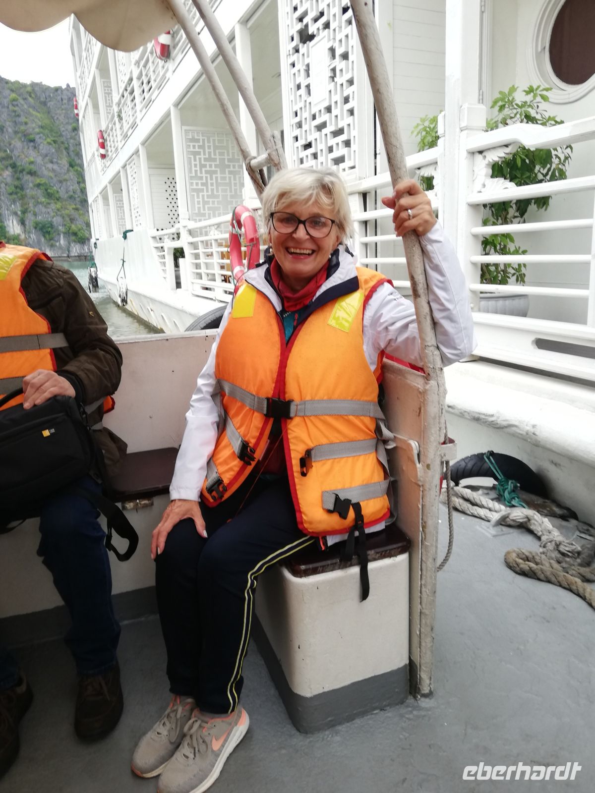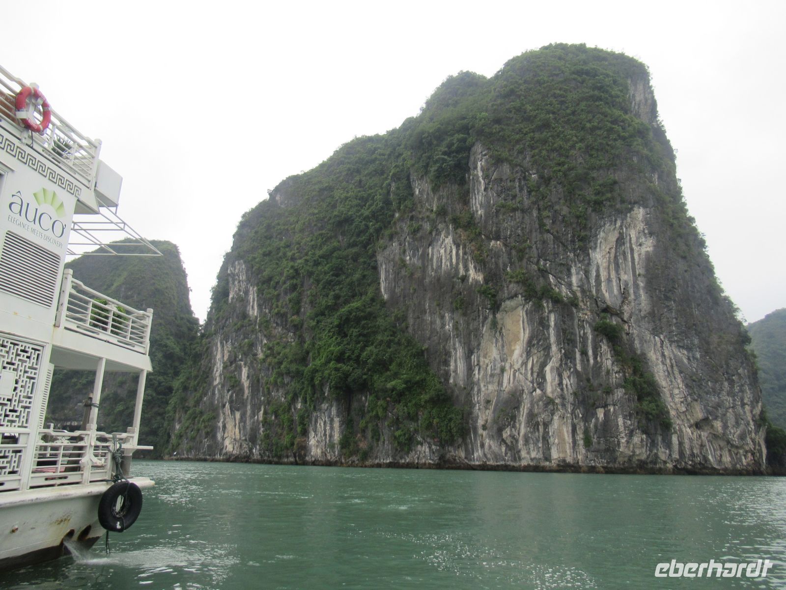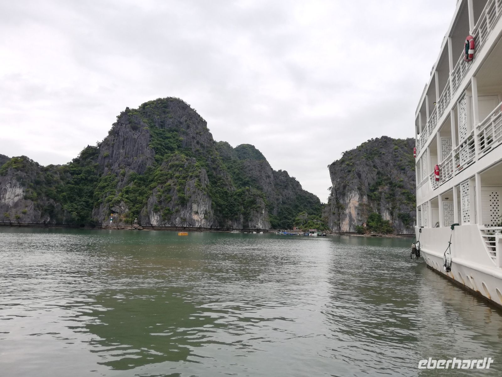 Über eine Brücke erreichen wird das Bhaya Cruises Center. Wir checken ein und warten bei einem Drink auf die Einschiffung. Bald ist es soweit, die Crew empfängt uns freundlich mit kleinem Trommelkonzert und wir dürfen unsere Kajüten beziehen. Alle sind sehr schön und mit Balkon, auf dem Bett liegt unser Programm für die nächsten zwei halben Tage. Bald nehmen wir Fahrt auf in dieser zauberhaften Region und bewundern die ersten Hügel-Inselchen, von denen es hier ca. 2.000 gibt. Die Region umfasst ca. 1500 km² und wurde im Jahre 1994 von der UNESCO zum Weltnaturerbe erklärt.