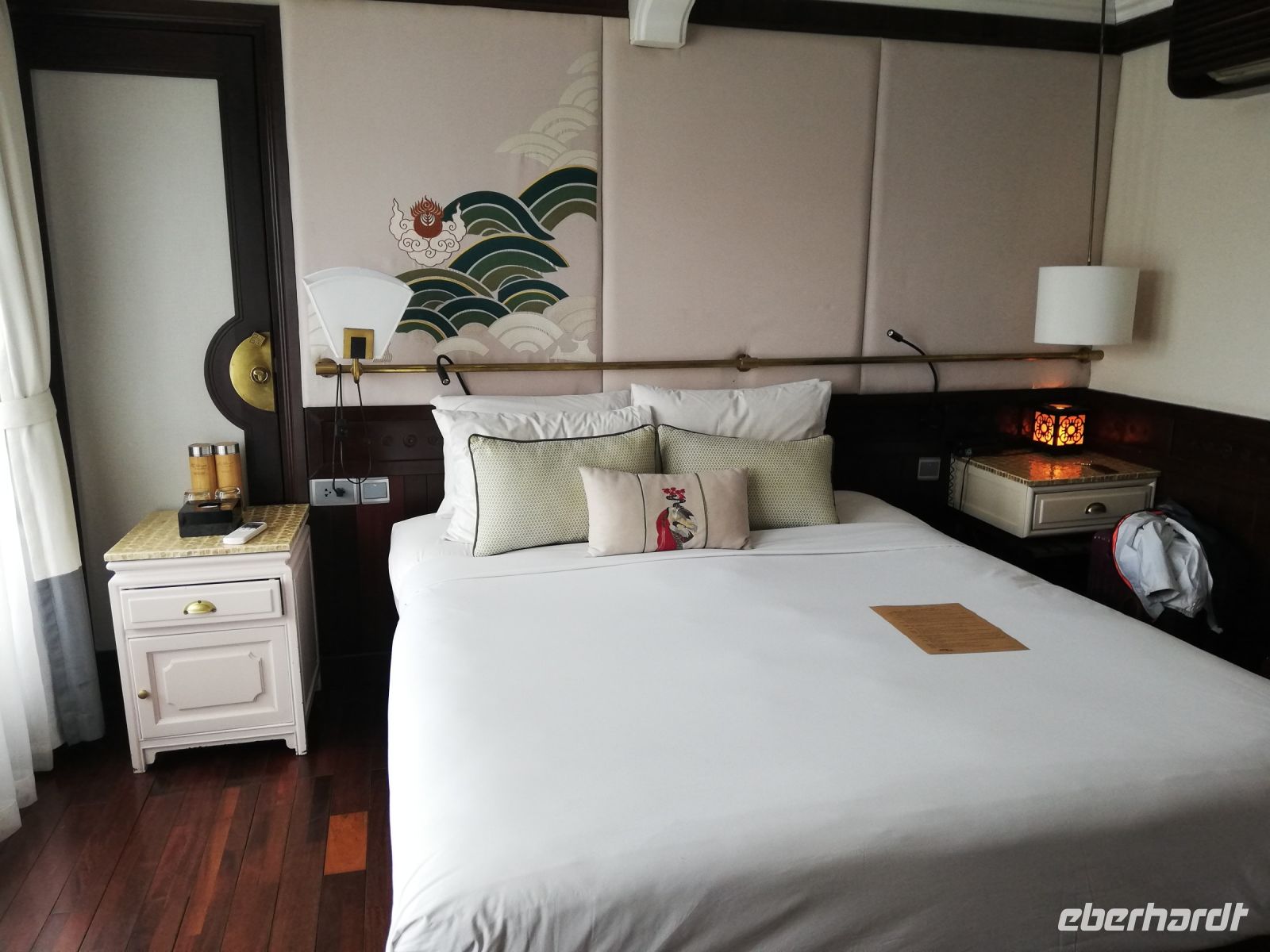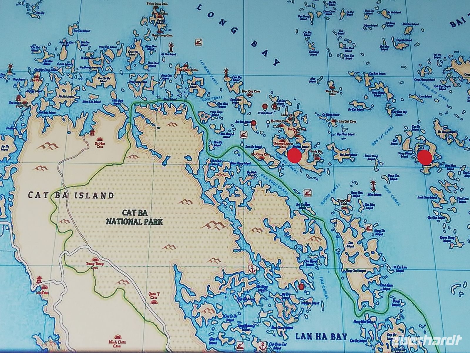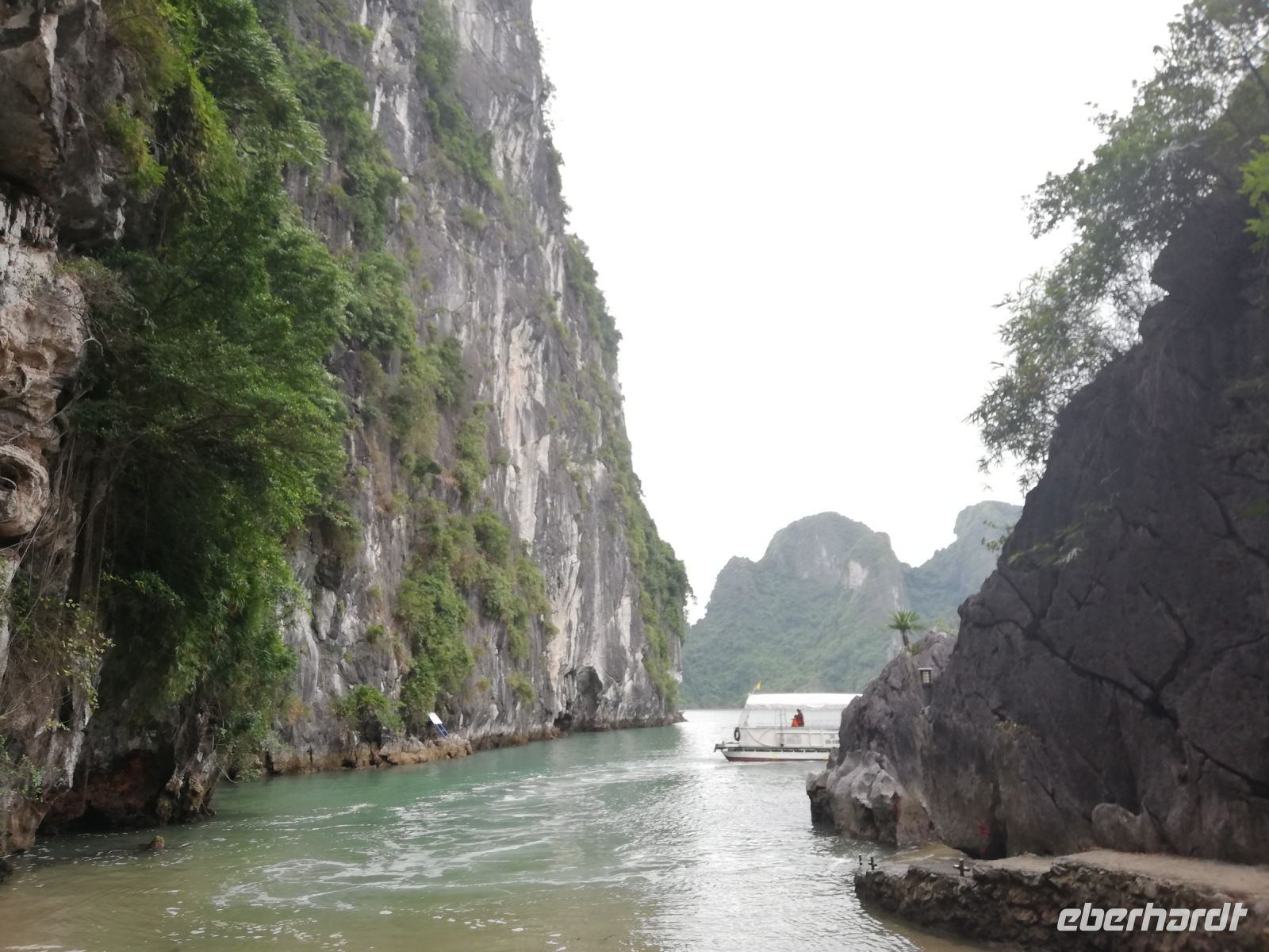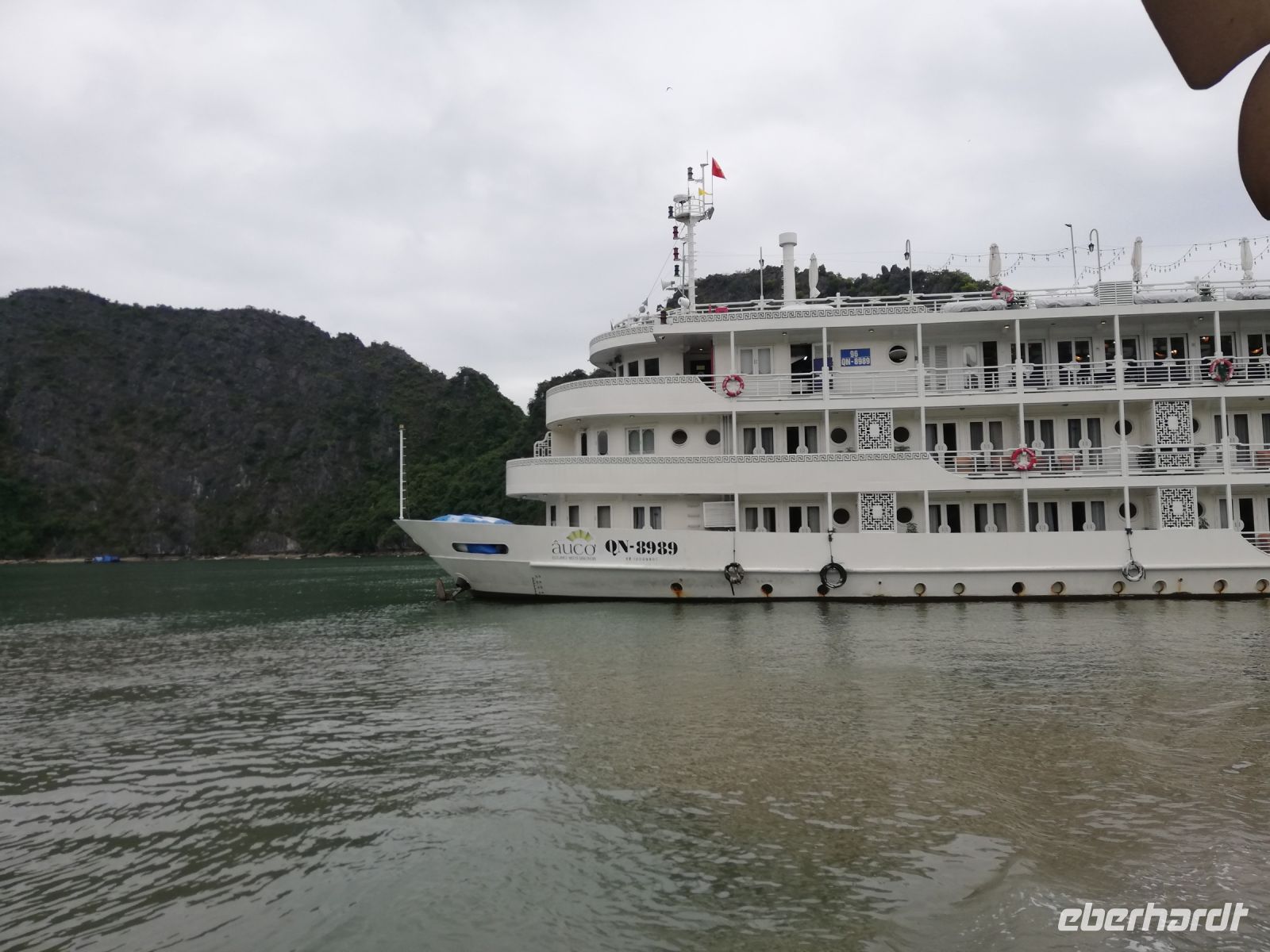 Über eine Brücke erreichen wird das Bhaya Cruises Center. Wir checken ein und warten bei einem Drink auf die Einschiffung. Bald ist es soweit, die Crew empfängt uns freundlich mit kleinem Trommelkonzert und wir dürfen unsere Kajüten beziehen. Alle sind sehr schön und mit Balkon, auf dem Bett liegt unser Programm für die nächsten zwei halben Tage. Bald nehmen wir Fahrt auf in dieser zauberhaften Region und bewundern die ersten Hügel-Inselchen, von denen es hier ca. 2.000 gibt. Die Region umfasst ca. 1500 km² und wurde im Jahre 1994 von der UNESCO zum Weltnaturerbe erklärt.