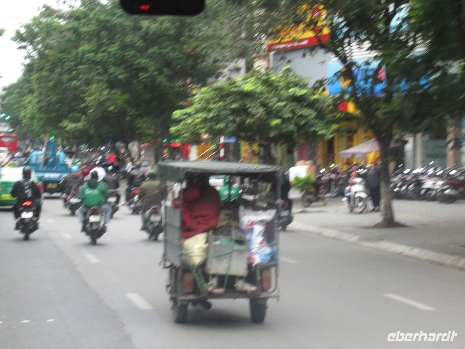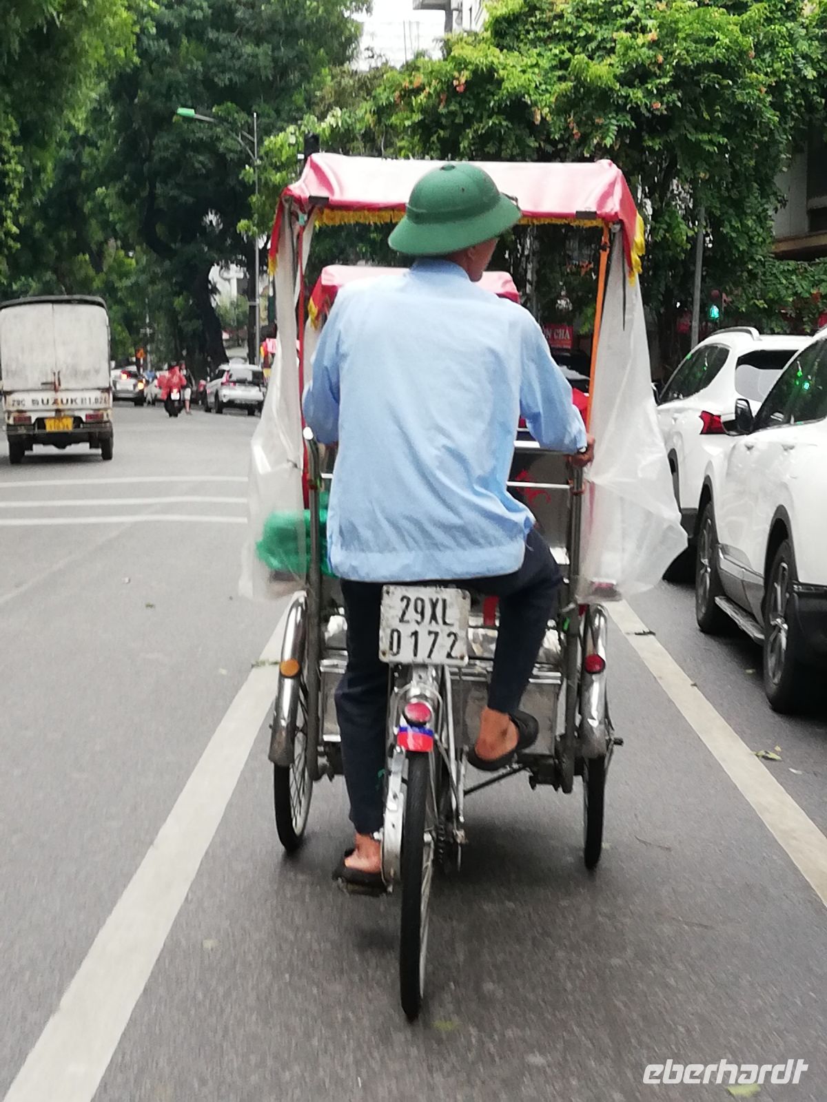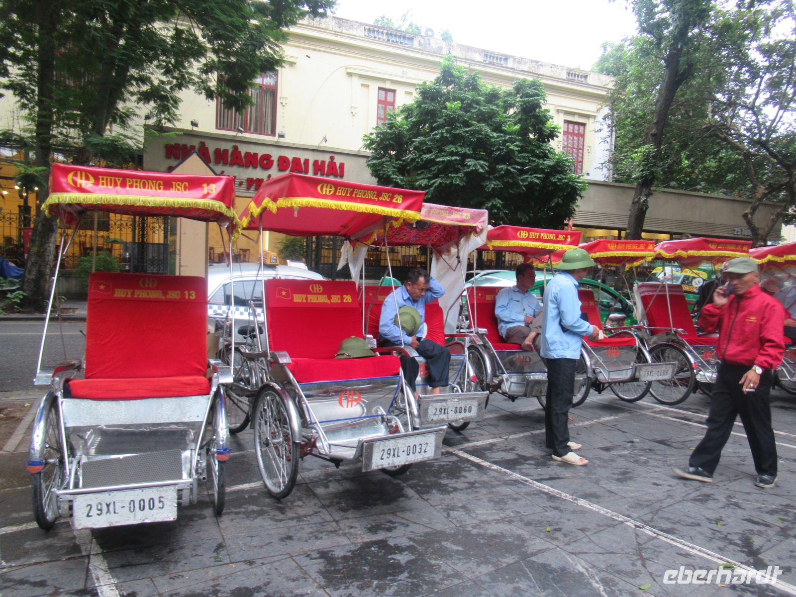 1 Euro = ca. 25.000 VTN. Darauf müssen wir uns erst gewöhnen und rechnen, daher habe ich an die Gäste eine kleine Tabelle mit der Umrechnung versendet oder verteilt, damit wir beim Einkaufen wissen, was es kostet. Der Reiseführer führt uns zu dem Rikschastand – jeder einzelne Gast fährt mit einem Rikschafahrer durch die Straßen von Hanoi. Wir steigen ein uns lassen uns mit den Rikschafahrer durch Hanoi treiben.