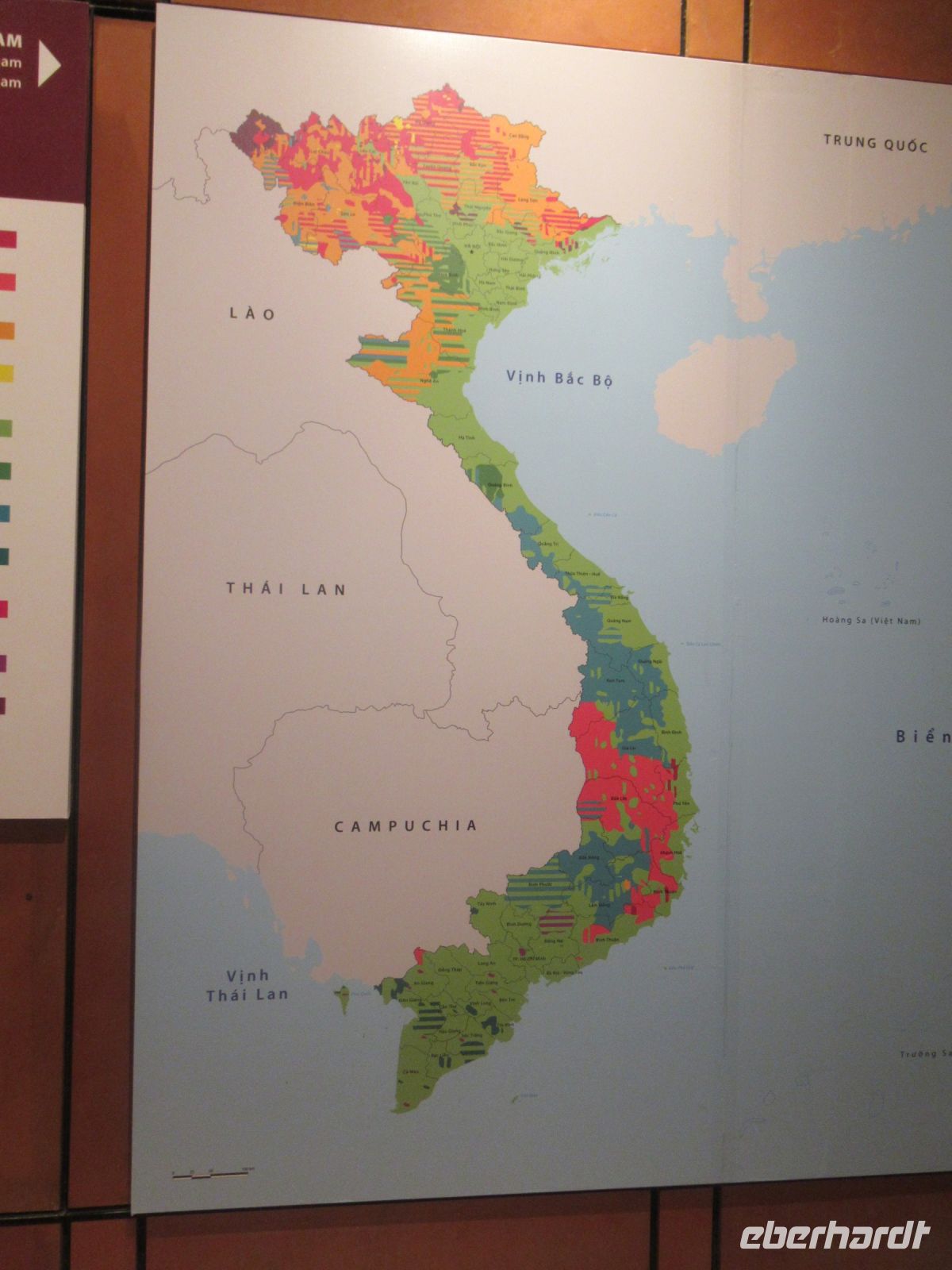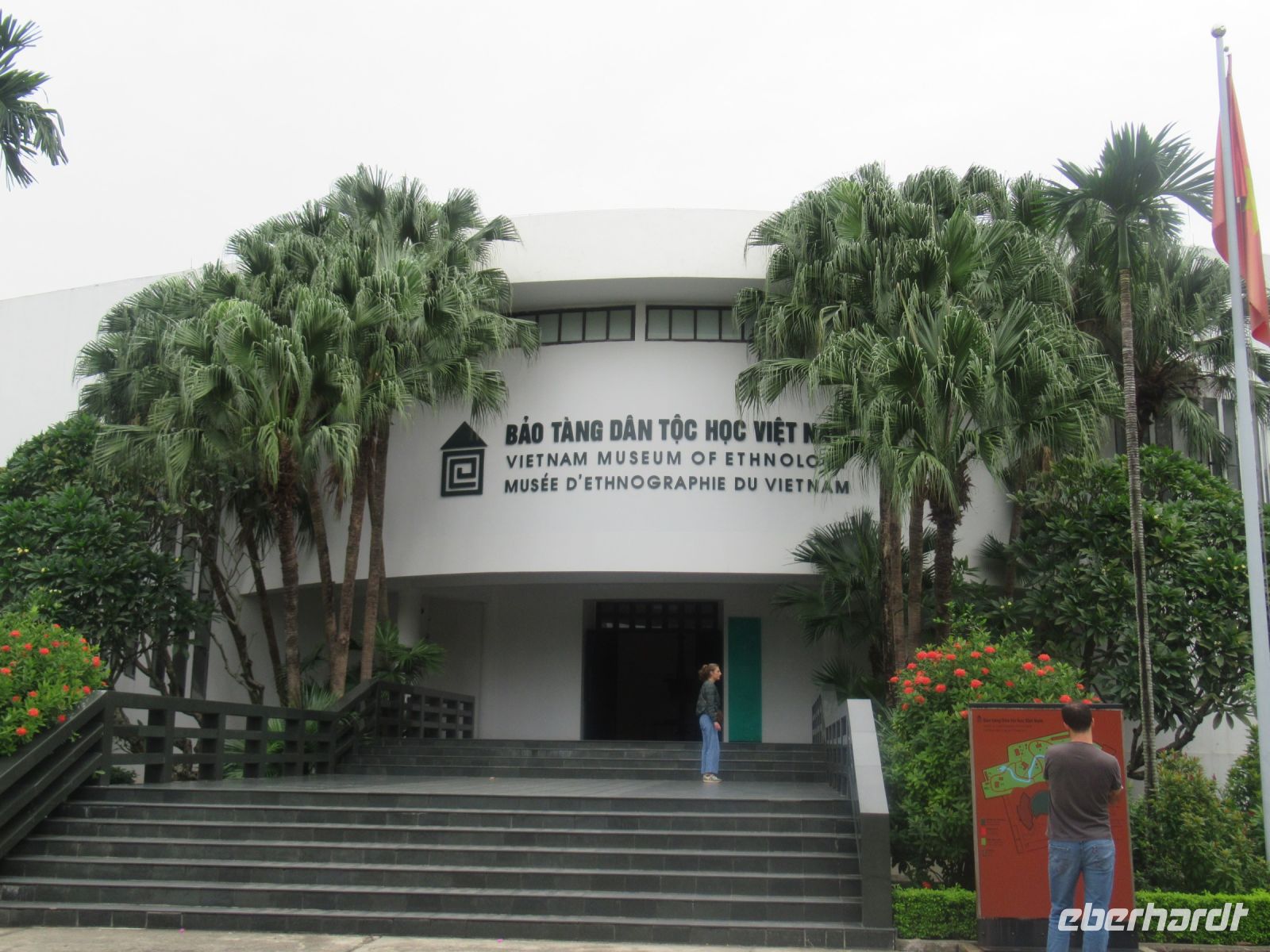 Wir besuchen das Ethnologische Museum. Das Museum wurde etwas außerhalb des Stadtzentrums neu gebaut und 1997 neu eröffnet. Es umfasst eine Fläche von 13.000 m² mit sehr schönem modernem Bau und Freigelände. Wir besuchen nur die Innenausstellung. Der Schwerpunkt der Ausstellung sind die 54 offiziellen Völker und anerkannte Minderheiten von Vietnam. Das ist in der Eingangshalle anschaulich auf der Karte skizziert.