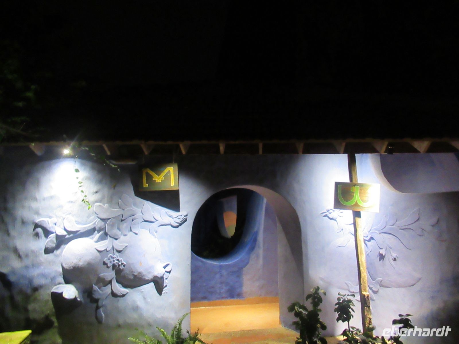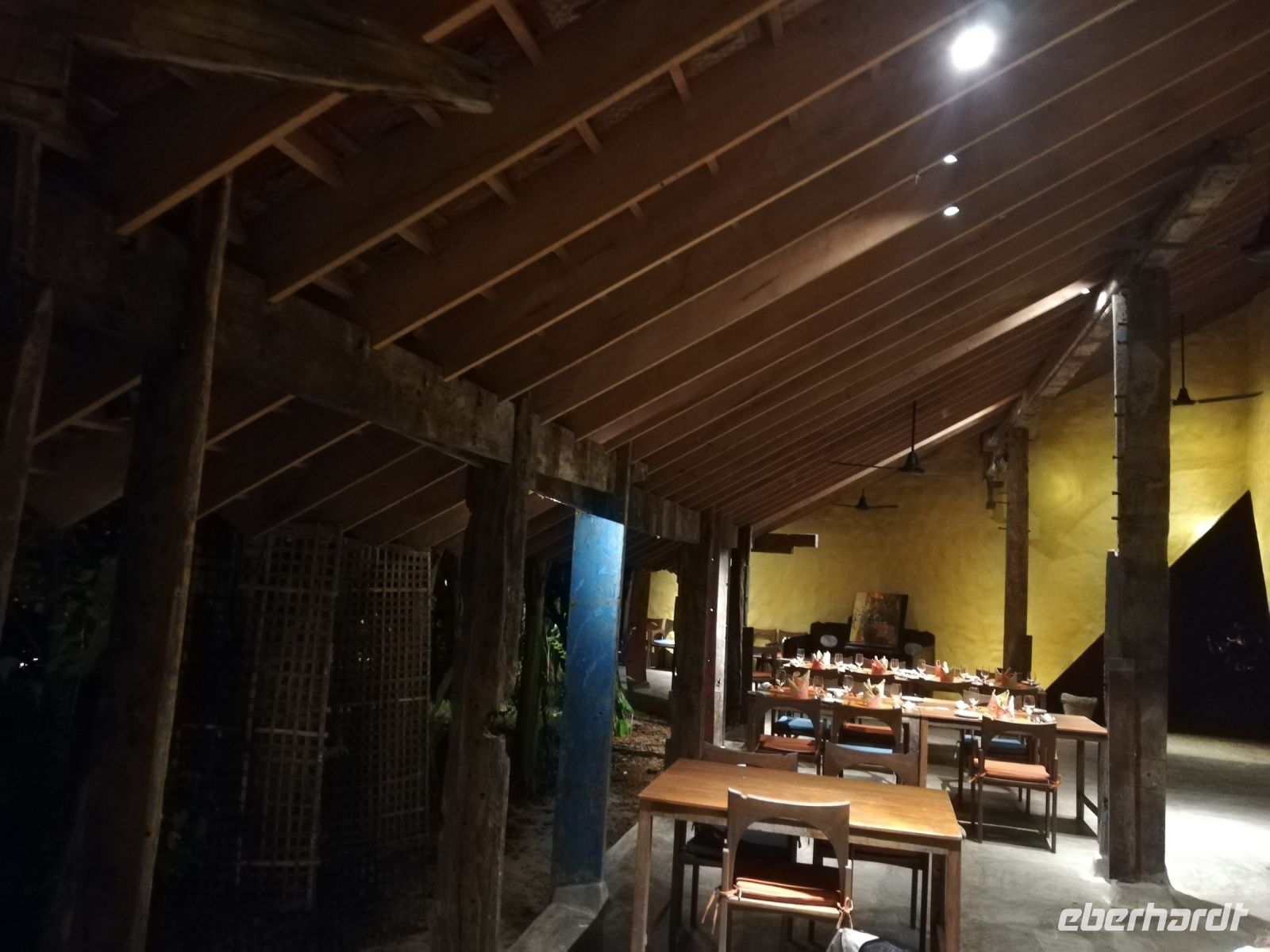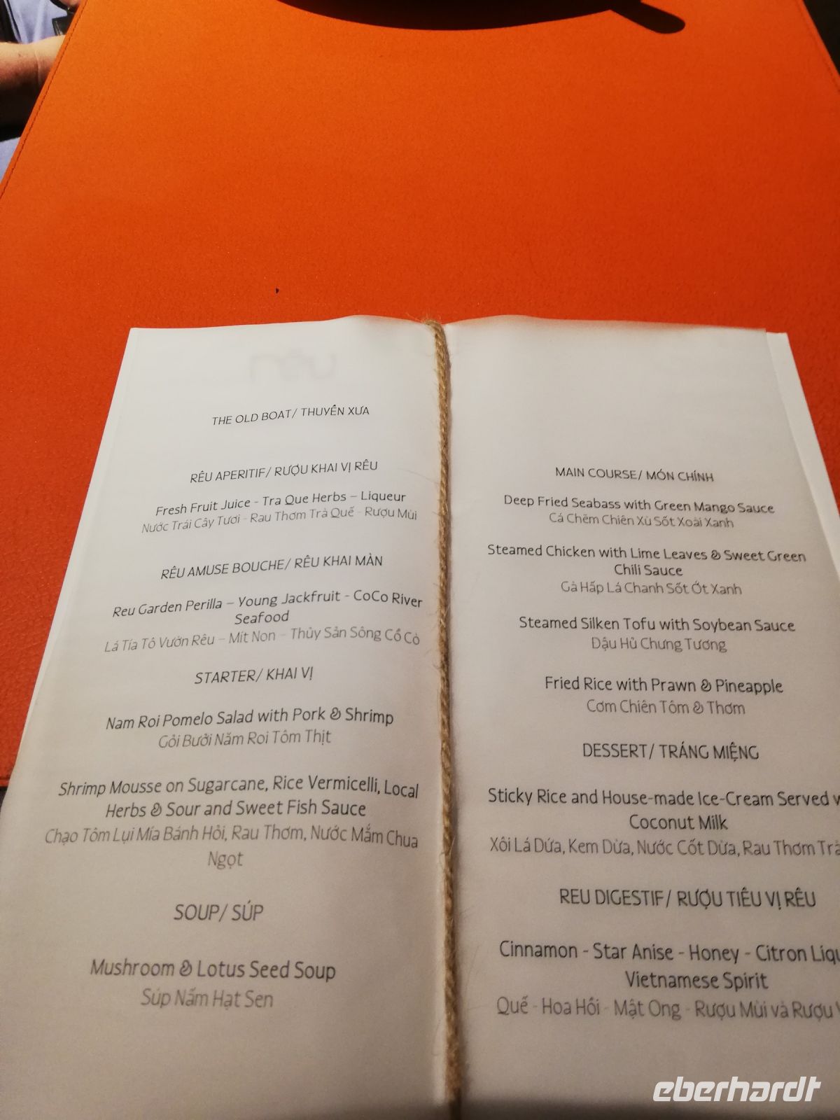 Wir steigen in den Bus und bevor wir im Hotel ankommen, gibt es noch ein Abendessen – ein zusätzliches „Überraschungsabendessen“ vom Eberhardt Travel. Nun sind wir gespannt. Wir landen irgendwo… da wir kaum was sehen können, denn mittlerweile ist es fast dunkel. Am Parkplatz erwartet uns ein Elektroauto und nur die letzten Schritte müssen wir zu Fuß machen, aber es regnet – nein, es schüttet wie aus Ei-mern. Es werden uns Regenschirme gereicht. So erreichen wir ein einzigartiges Restaurant in einem bäuerlichen, aber extravagant gestalteten Gebäude. Unsere Tafel ist auf der überdachten Terrasse gedeckt, wir schieben noch etwas den Tisch, damit wir nichts von dem Regen abbekommen. Wir werden super freundlich empfangen, die Auswahl der Speisen wird abgestimmt. Wir sind in Vietnam an einer der längsten Küste überhaupt, dennoch isst ein großer Teil der Gruppe keine Meeresfrüchte oder Fisch…Aber die Kellner und die Köche sind flexibel und bald werden wir vom Feinsten kulinarisch verwöhnt. Das Agritu-rismo Projekt – „Reu Restaurant Old Boot“ kitzelt unsere Geschmacksnerven bei jedem Gang. Ein toller Empfang in der Region und in einem außergewöhnlichen Haus, wo aus einem alten Herrenhaus mit Boot-selementen und alten Bretter mit viel Kreativität und Mut etwas Außergewöhnliches geschaffen wurde. Wir bedanken uns bei dem jungen Team und können es für die nächsten Gäste nur empfehlen.