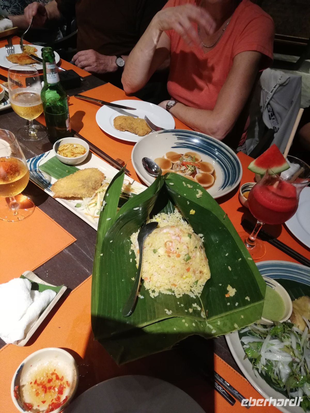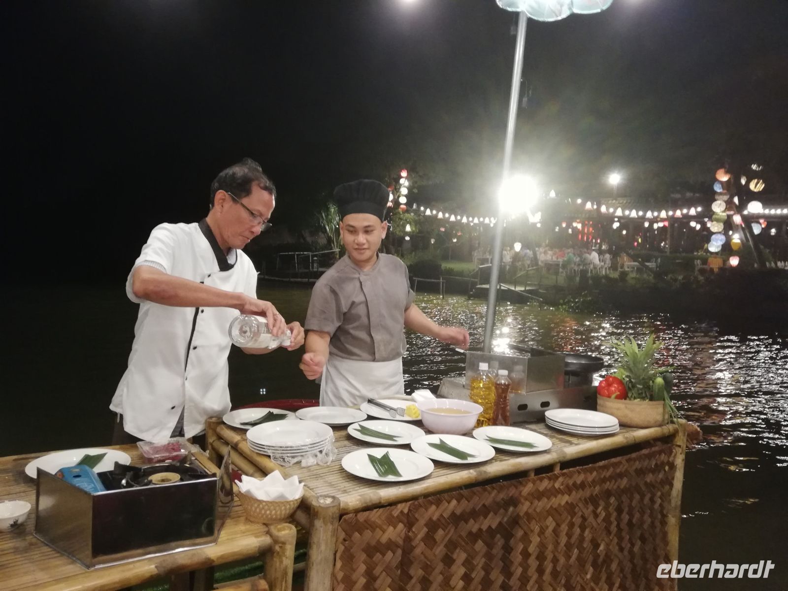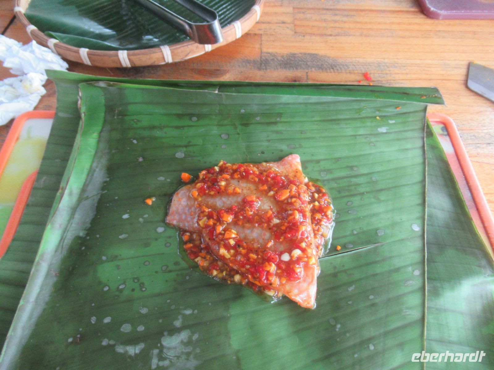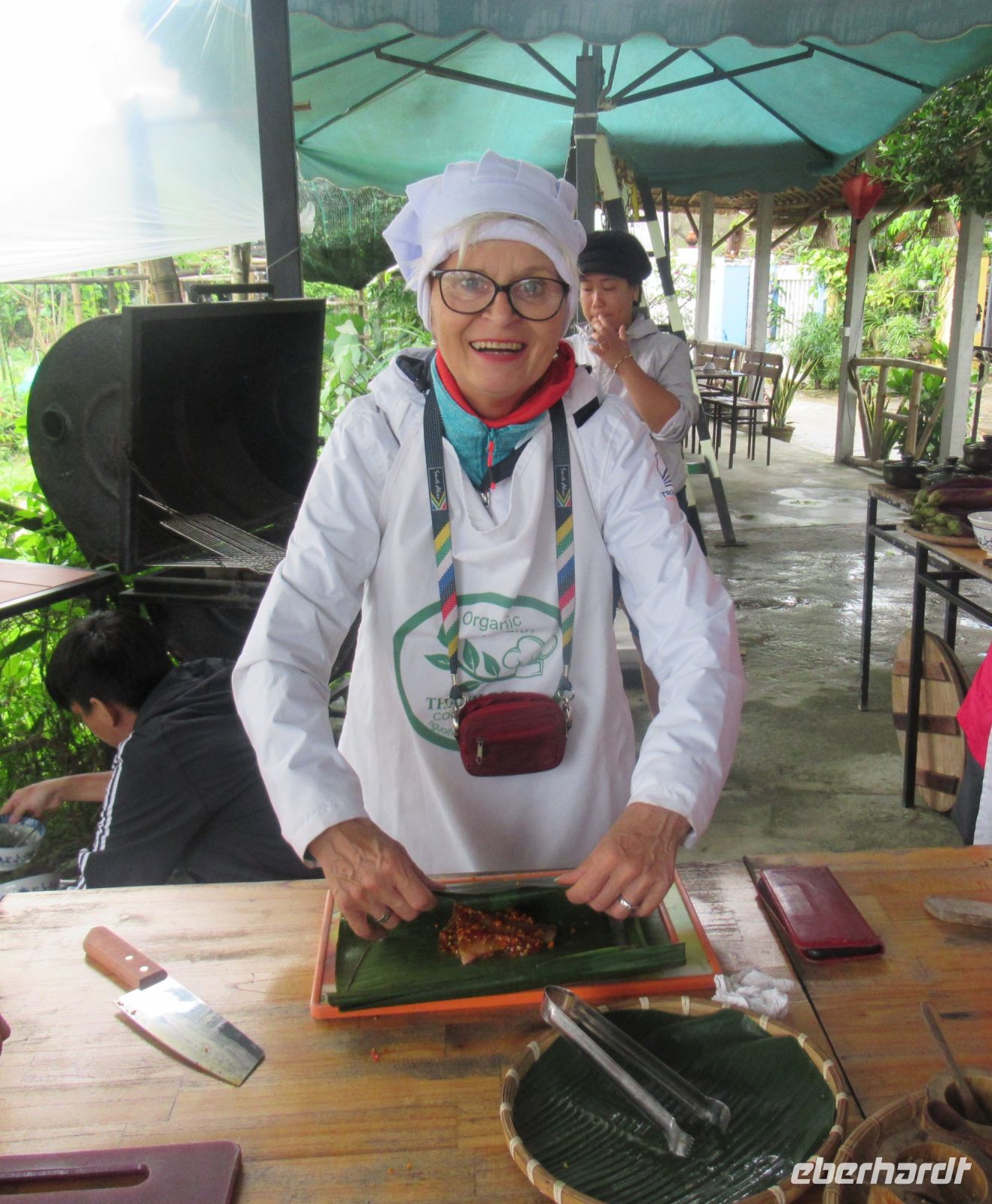 Sie erklärt uns, wie wir zunächst die „frischen“ Gewürze hacken und in Öl einlegen sollen – frische Kur-kumawurzel, Pfefferoni, Ingwer, dazu Salz und Pfeffer. In diese Marinade legen wir unsere Portion Fisch oder Hähnchenfilet. Wir erhalten noch ein Bananenblatt, wo wir die Portion einpacken – das wird dann von den Helfern auf den Grill gelegt. Im Hintergrund wird noch Teig für eine Art Pfannkuchen vorbereitet. Jeder von uns erhält einen kleinen Gaskocher und kleine Pfanne. Jetzt dürfen wir unseren Teig noch mit diversen Zutaten, wie Gemüse oder Shrimps, ganz nach unserem Geschmack, ergänzen und braten und umdrehen. Hier ist wohl ein Drache dabei, der bei manchen Gästen das Feuer spuckt. Vorsicht ist gebo-ten. Dann wickeln wir noch die Frühlingsrollen ein. Inzwischen sind unsere Fisch- oder Fleischportionen in den Bananenblätter gegrillt und jeder kann jetzt sein eigenes Gericht essen. Dazu wird noch Reis serviert. Hervorragend haben wir unter der Anleitung gekocht. An der Stelle dürfen wir unsere Gastgeber, aber auch uns selbst loben.