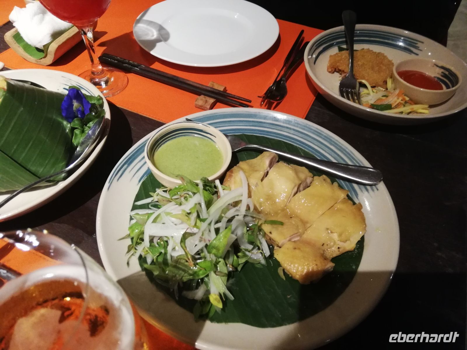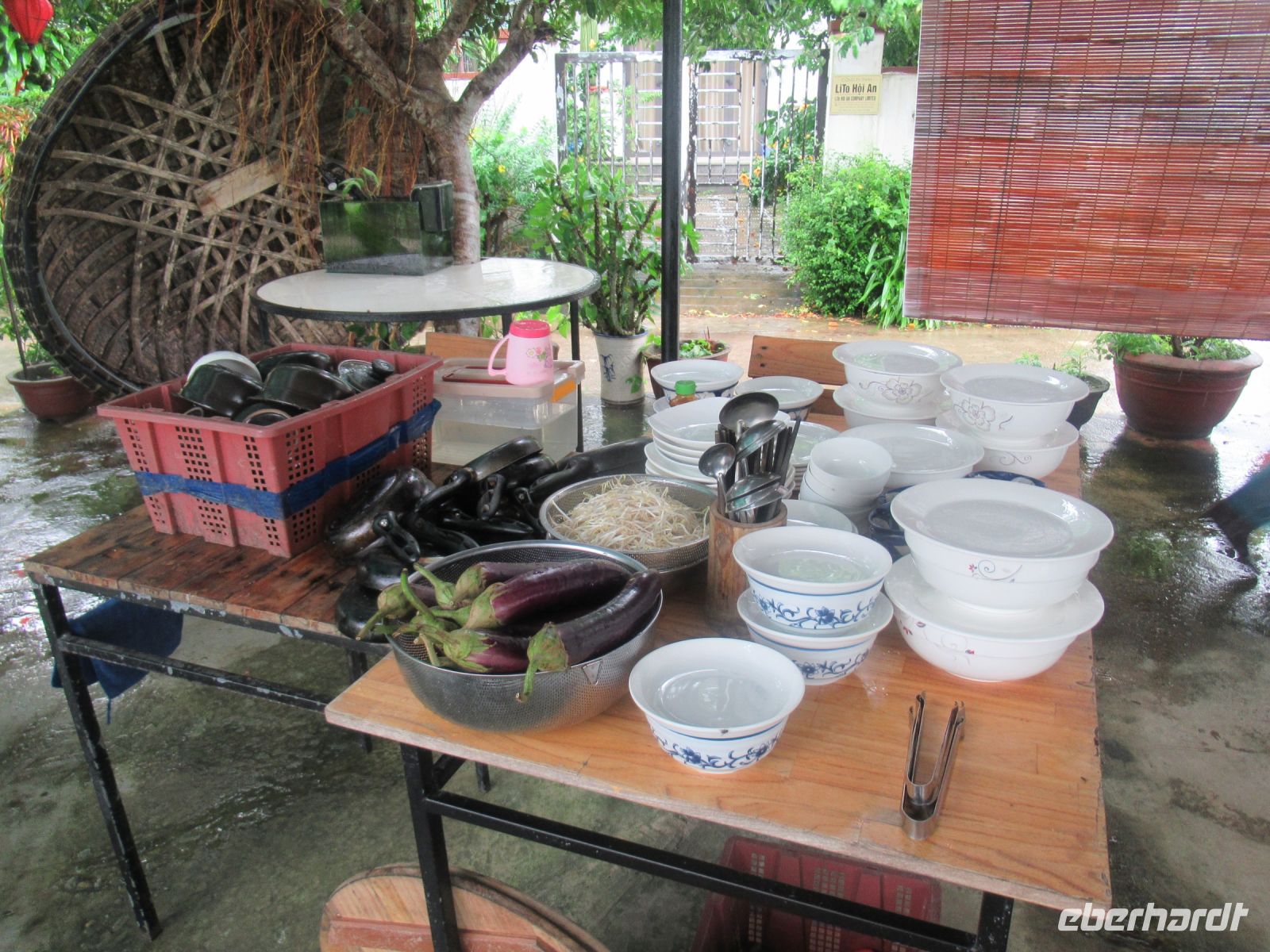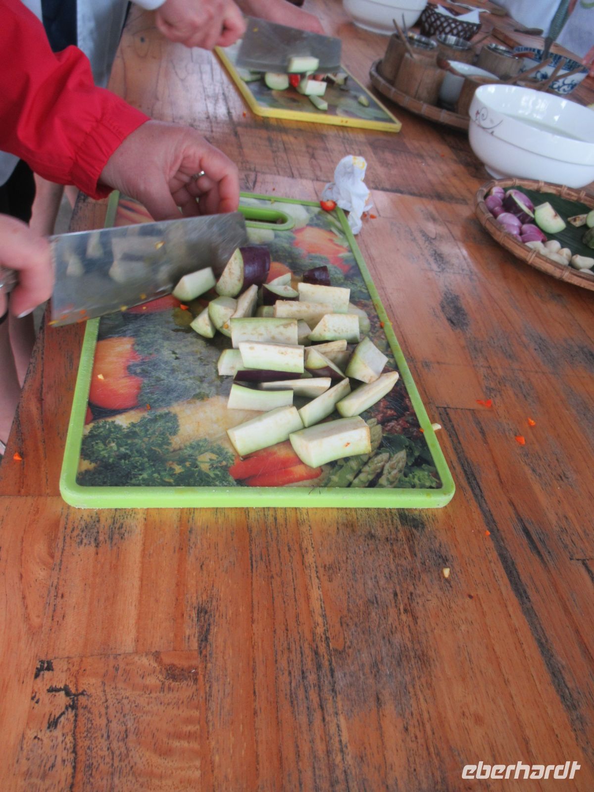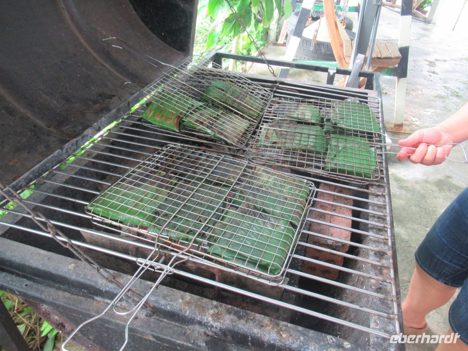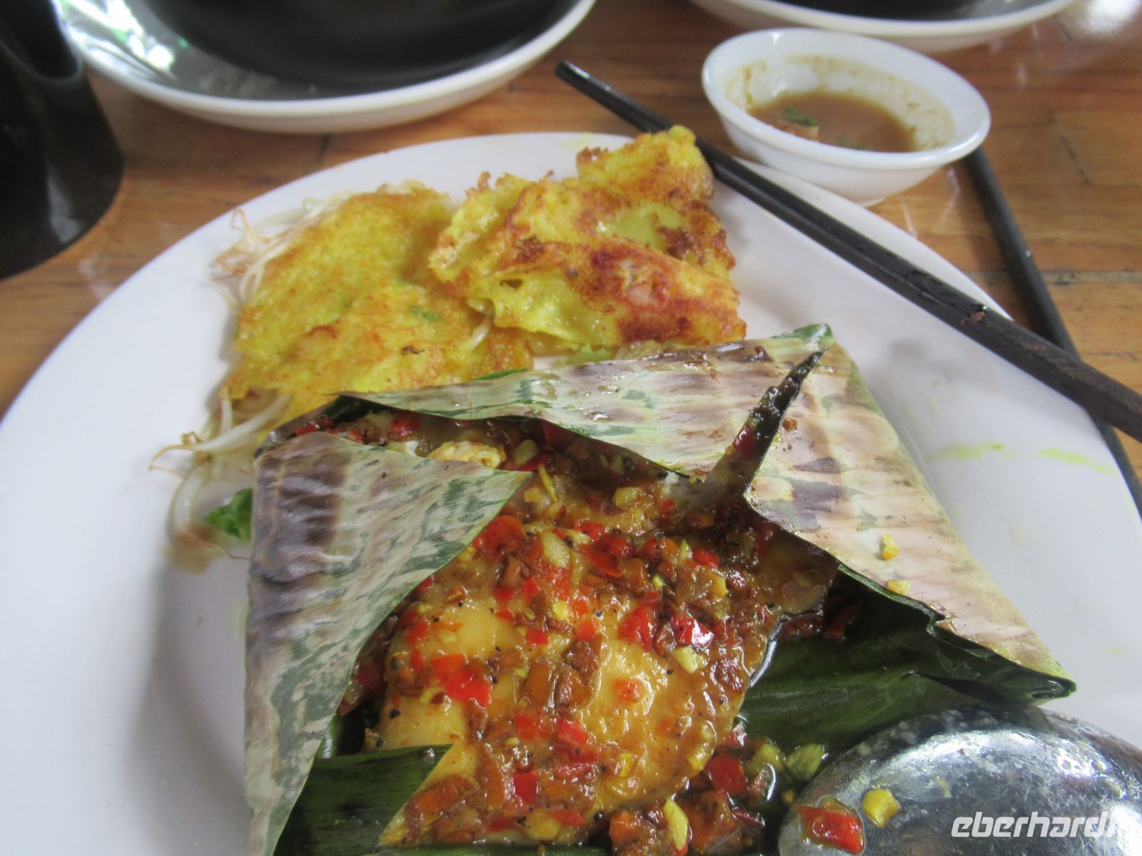 Sie erklärt uns, wie wir zunächst die „frischen“ Gewürze hacken und in Öl einlegen sollen – frische Kur-kumawurzel, Pfefferoni, Ingwer, dazu Salz und Pfeffer. In diese Marinade legen wir unsere Portion Fisch oder Hähnchenfilet. Wir erhalten noch ein Bananenblatt, wo wir die Portion einpacken – das wird dann von den Helfern auf den Grill gelegt. Im Hintergrund wird noch Teig für eine Art Pfannkuchen vorbereitet. Jeder von uns erhält einen kleinen Gaskocher und kleine Pfanne. Jetzt dürfen wir unseren Teig noch mit diversen Zutaten, wie Gemüse oder Shrimps, ganz nach unserem Geschmack, ergänzen und braten und umdrehen. Hier ist wohl ein Drache dabei, der bei manchen Gästen das Feuer spuckt. Vorsicht ist gebo-ten. Dann wickeln wir noch die Frühlingsrollen ein. Inzwischen sind unsere Fisch- oder Fleischportionen in den Bananenblätter gegrillt und jeder kann jetzt sein eigenes Gericht essen. Dazu wird noch Reis serviert. Hervorragend haben wir unter der Anleitung gekocht. An der Stelle dürfen wir unsere Gastgeber, aber auch uns selbst loben.
