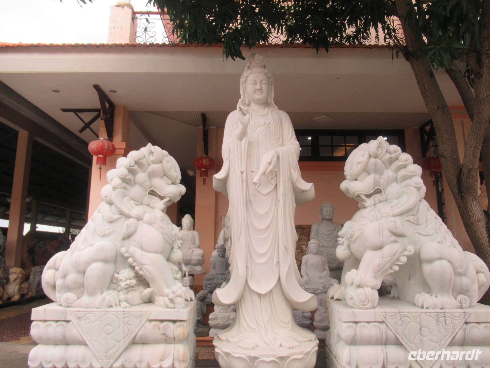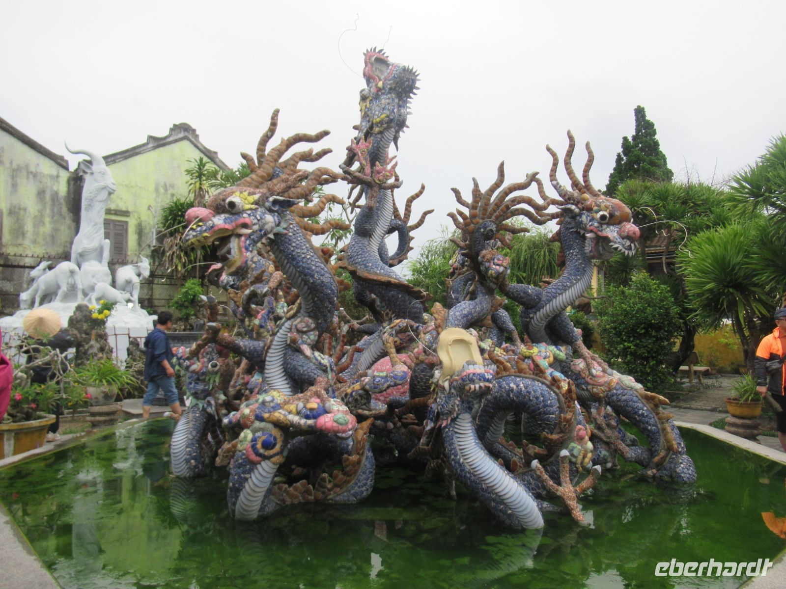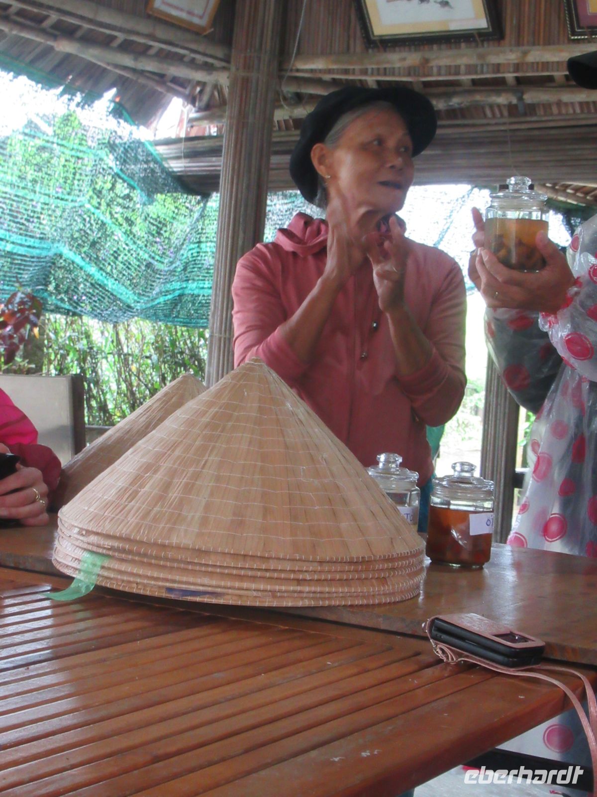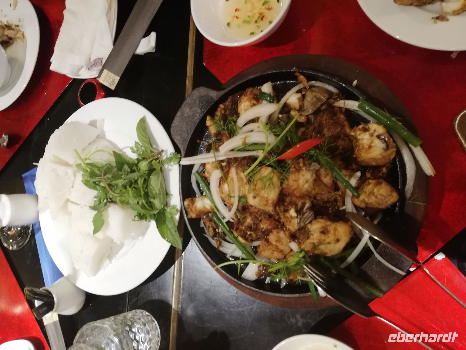 Langsam näherten wir uns dem Ende des Rundganges und hinter dem Souvenirshop wurden wir in einem Gartenlokal sehr gut zu Mittag verköstigt. Eine große Auswahl vietnamesischen Spezialitäten wurde uns auf Platten serviert, auch den berühmten Elefantenfisch konnten wir auch noch mal probieren.