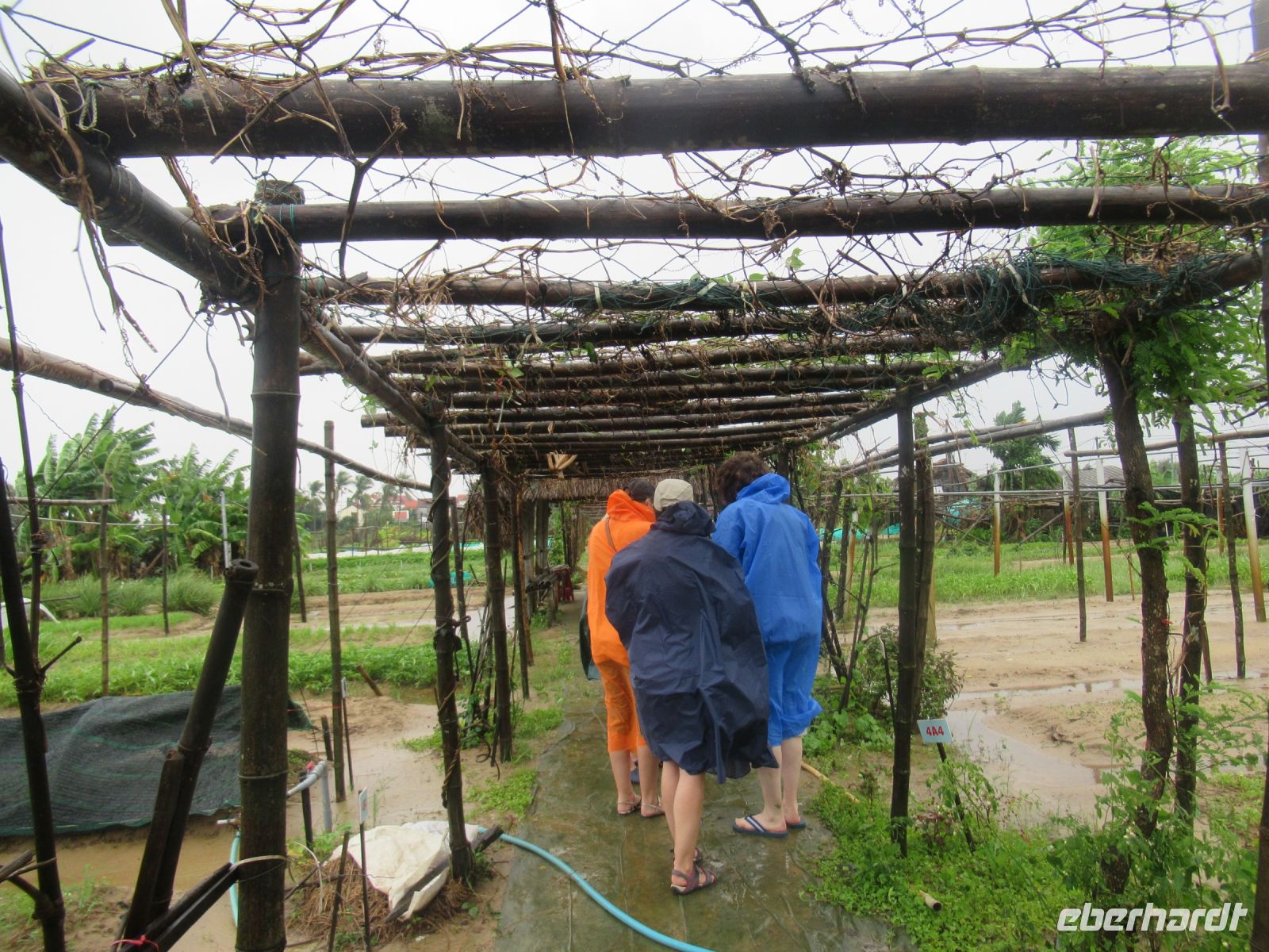 Wir nehmen Platz an einem Tisch ein und werden von den Eigentümern nett empfangen. Dann über-nimmt wohl die Seniorchefin, eine von Leben und harter Arbeit gezeichnete Frau, und erklärt uns sehr ausführlich und anschaulich die Bio-Art des Düngens der angepflanzten Gemüsearten. Tim übersetzt uns. Wir gehen dann zu den Feldern und zu den Wirtschaftsgebäuden. Es regnet immer noch, und es ist auch nicht besonders warm. Aber wir waren alle klug und haben unsere Badeschlappen angezogen, da können die Turnschuhe nicht nass werden.