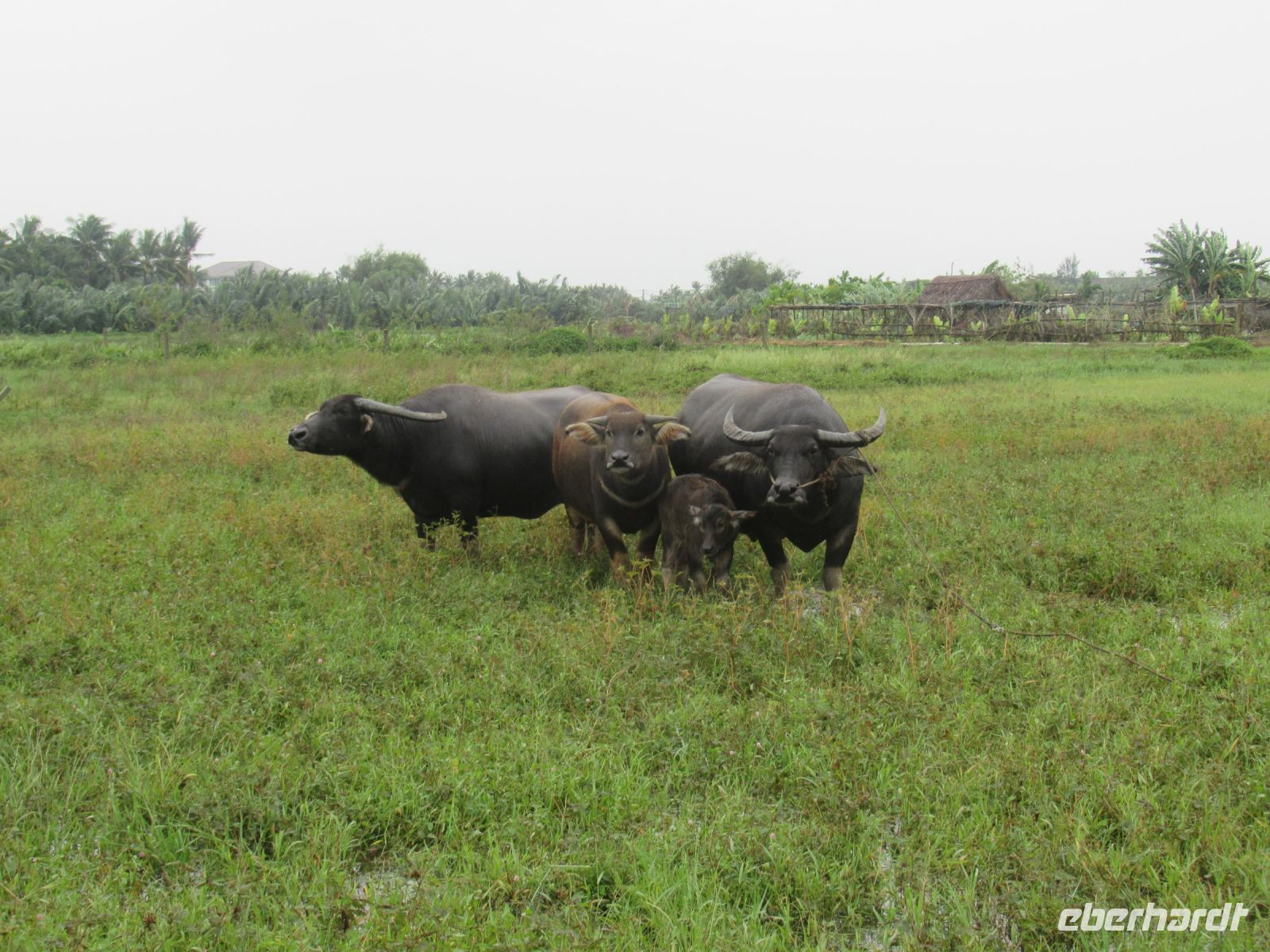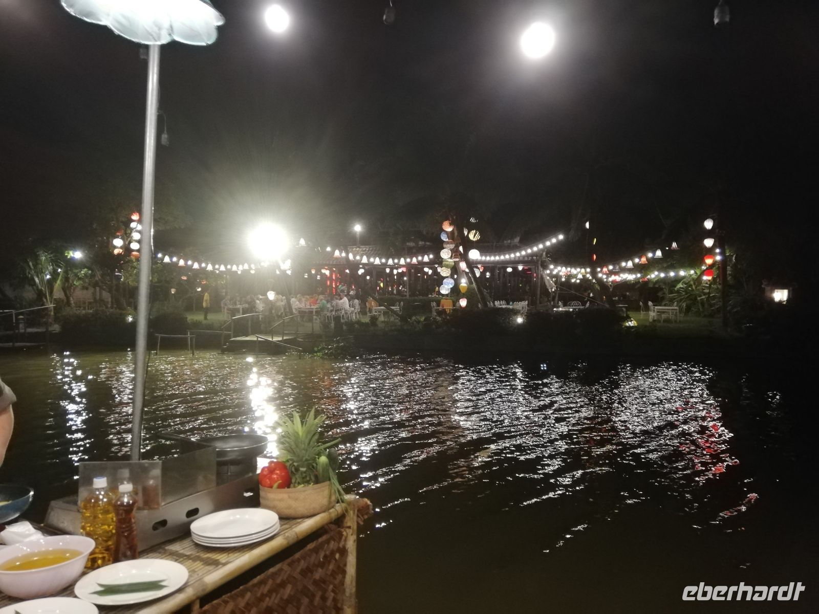 Gegen Mittag werden wir mit Holzboten durch eine idyllische Landschaft zu einem Familienrestaurant gebracht. Eine Idylle pur.