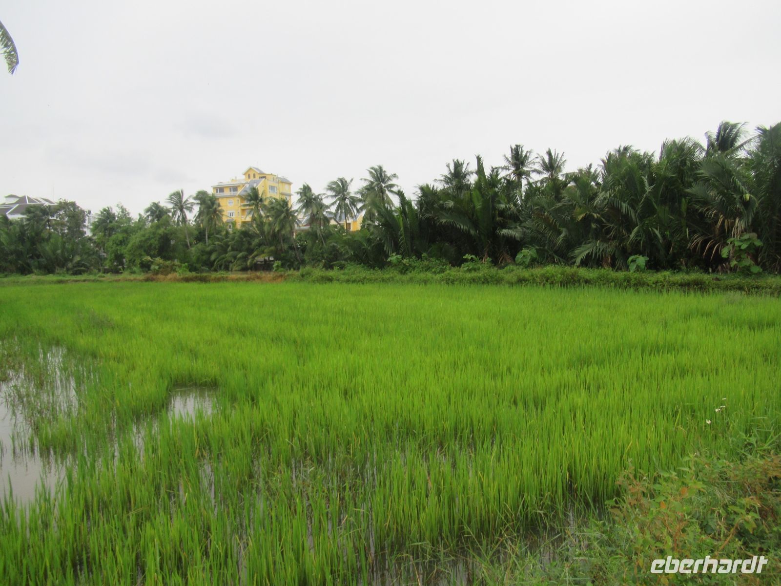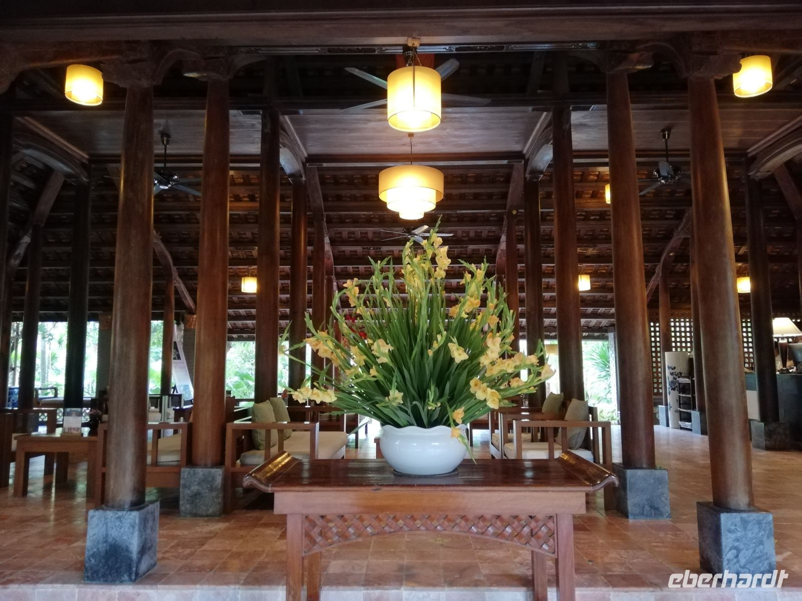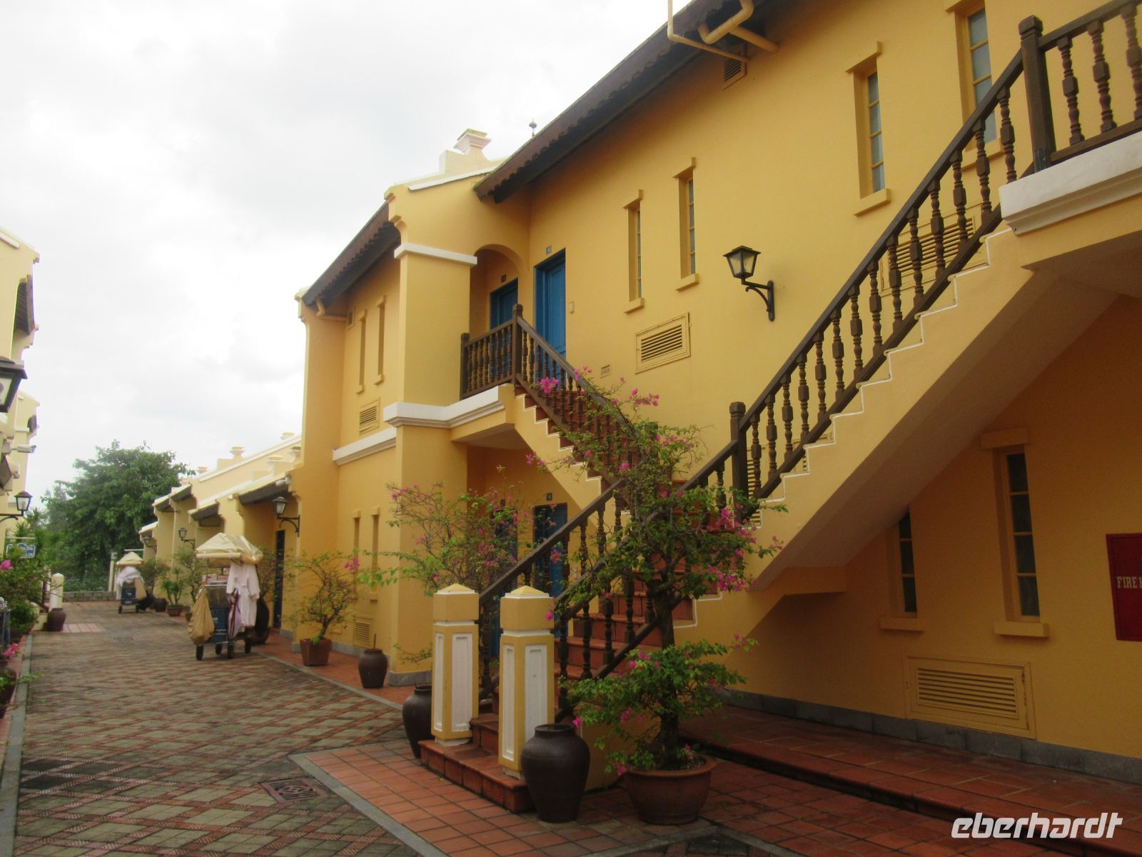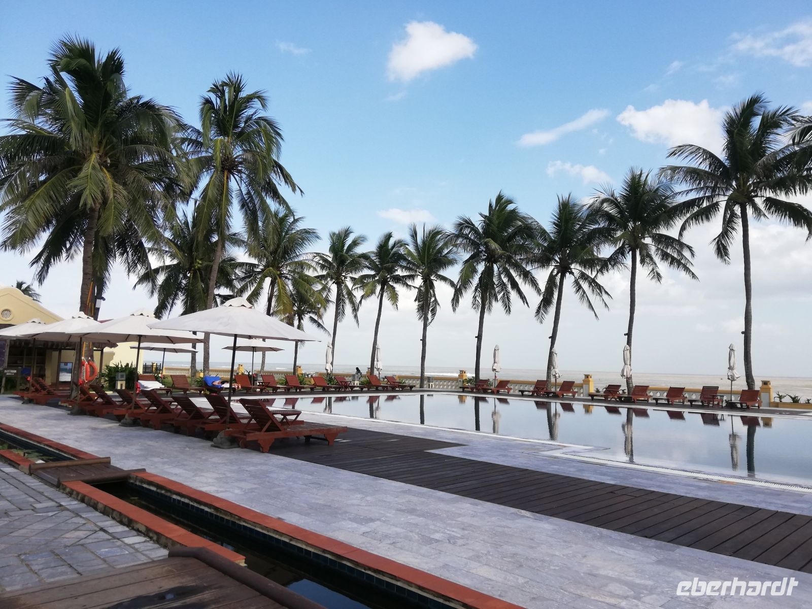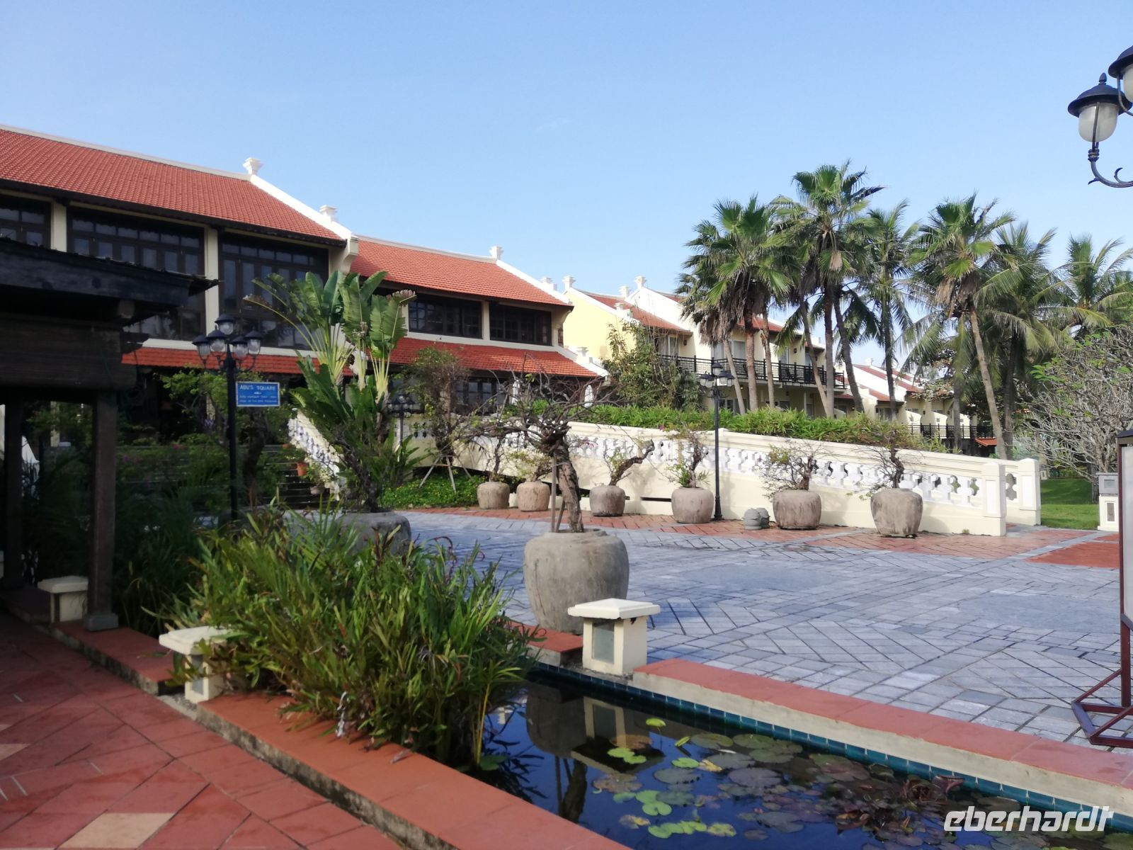 Jetzt aber los, wir werden die paar Meter wieder mit dem Elektroauto gefahren und der Bus bringt uns in unser nächstes Hotel, in das „Viktoria Hoi An Beach Resort and Spa“. Wir werden freundlich empfangen in einem, auf eine andere Art, wunderschönem Hotel. Die Zimmer sind über einen Gang von außen zu er-reichen und man fühlt sich wie in einem kleinen Dorf. Wir sind direkt an der Küste von Hoi An.