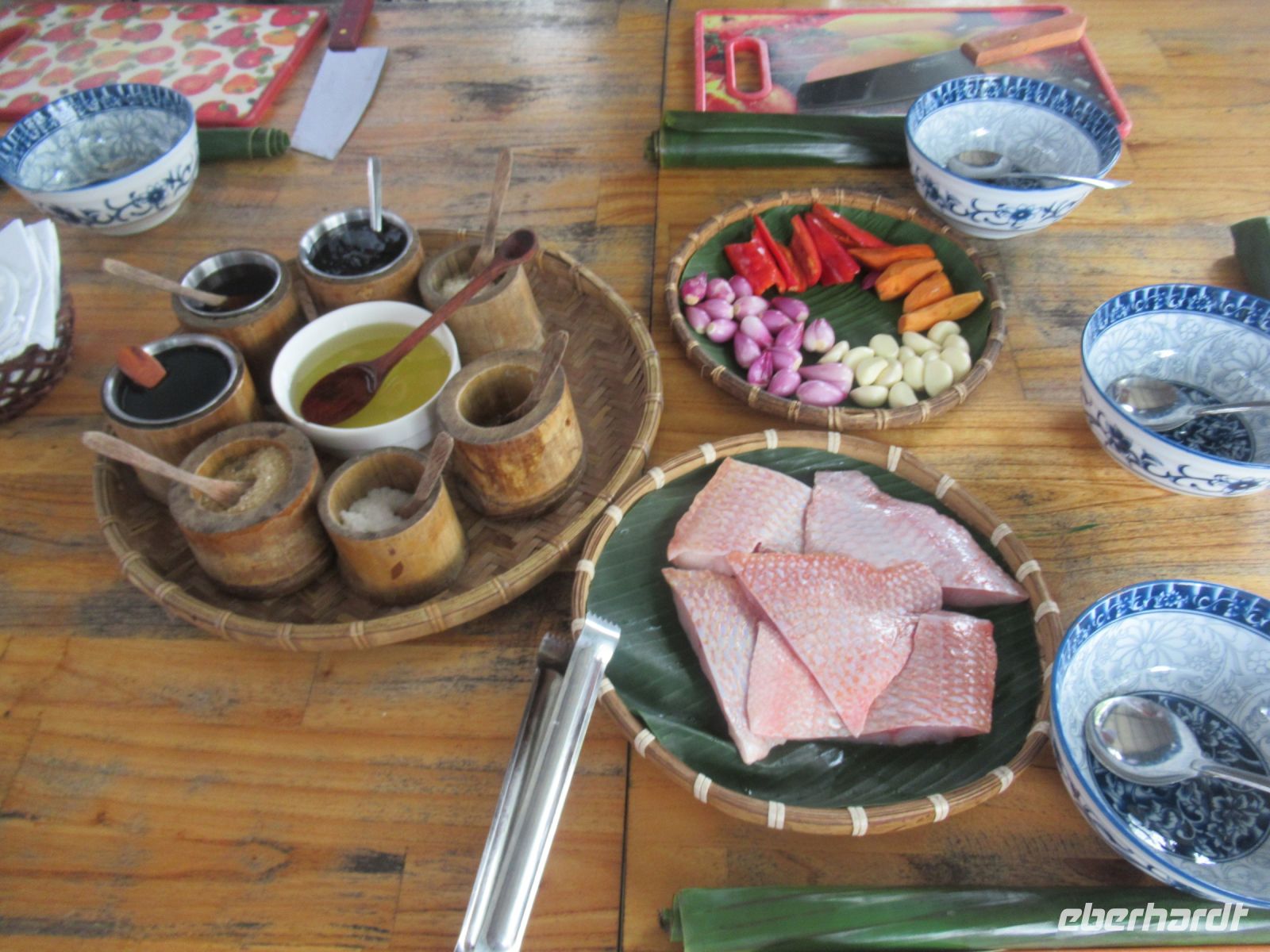 Wir kehren zurück und es erwartet uns eine eingedeckte „Kochtafel“ mit allen Zutaten. Wir bekommen eine Kochmütze aufgesetzt und eine weiße Schürze. Die Chefin und Ihre Helfer bringen die Gewürze, Gemüse, Fisch, Fleisch auf den Tisch, und los geht´s!