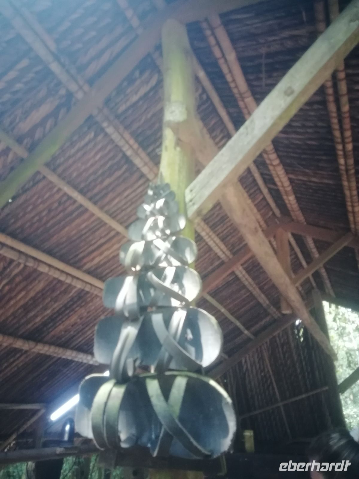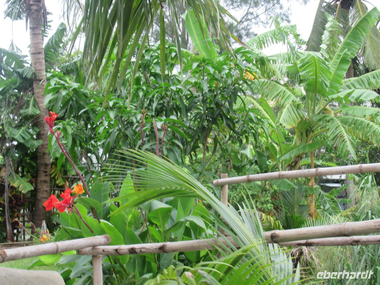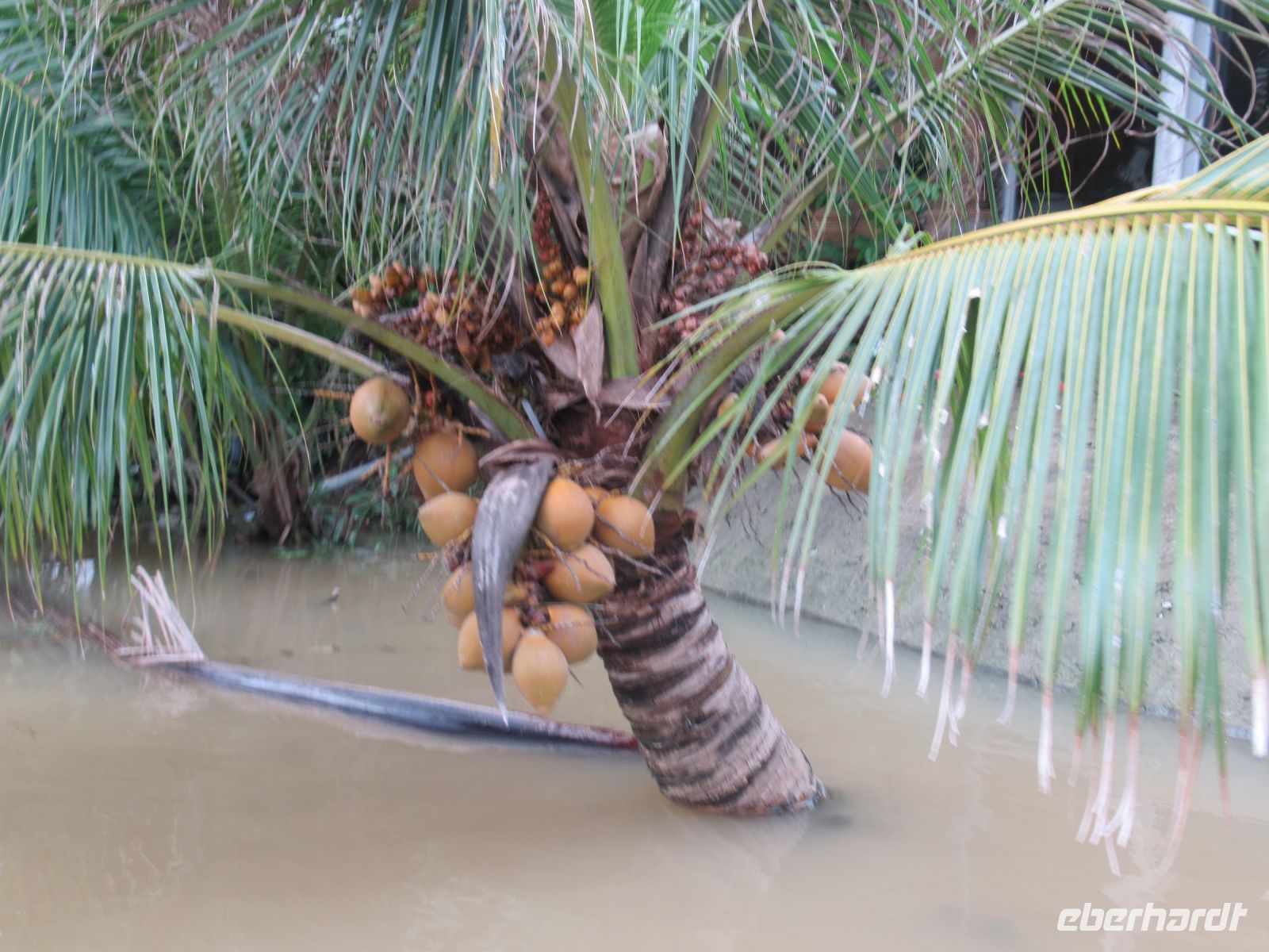 Eine wunderschöne romantische Stimmung und Stille. Am Rande des Flusses sind kleine Häuschen, man-che sogar auf Pfählen teils über den Fluss. Der Wettergott hat gottseidank aufgehört uns mit Wasser zu begießen und so konnten wir die Bootsfahrt richtig genießen. Am Rande wachsen Wasserkokosnusspal-men, oder auch Nipa Palmen. Unsere Ruderin nimmt das Messer, dass Sie selbstverständlich dabei hat und schneidet die riesengroße „Blume“ mit ganz festem Stamm ab. Ein schöner Abschluss des kleinen Abenteuers auf dem Bio-Bauernhof, um zu sehen, wie einfach hier noch das Leben ist und was die Men-schen daraus machen.