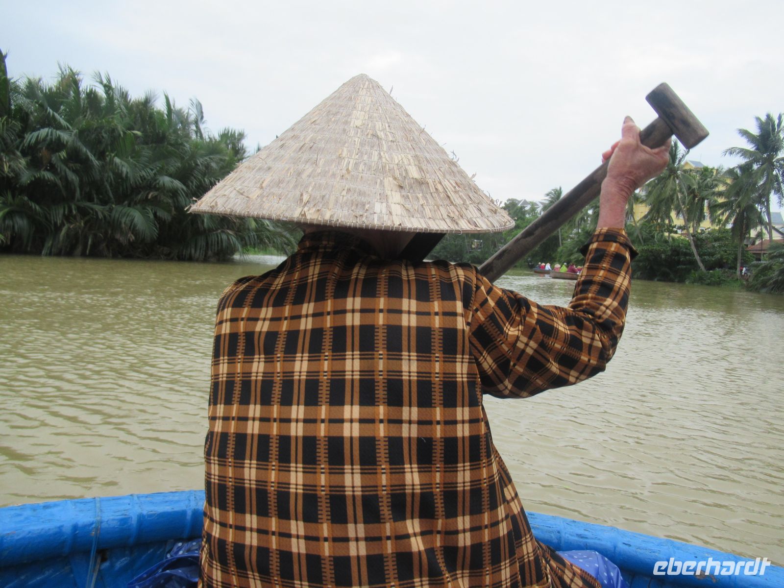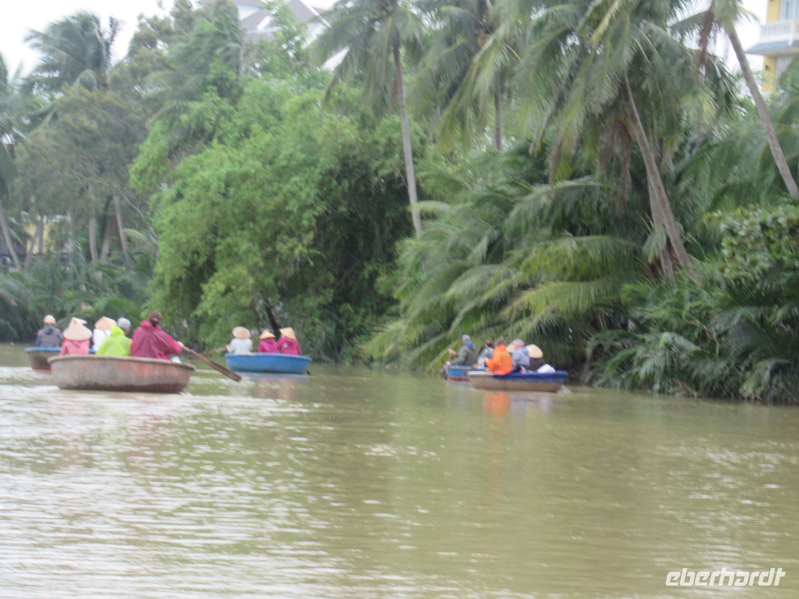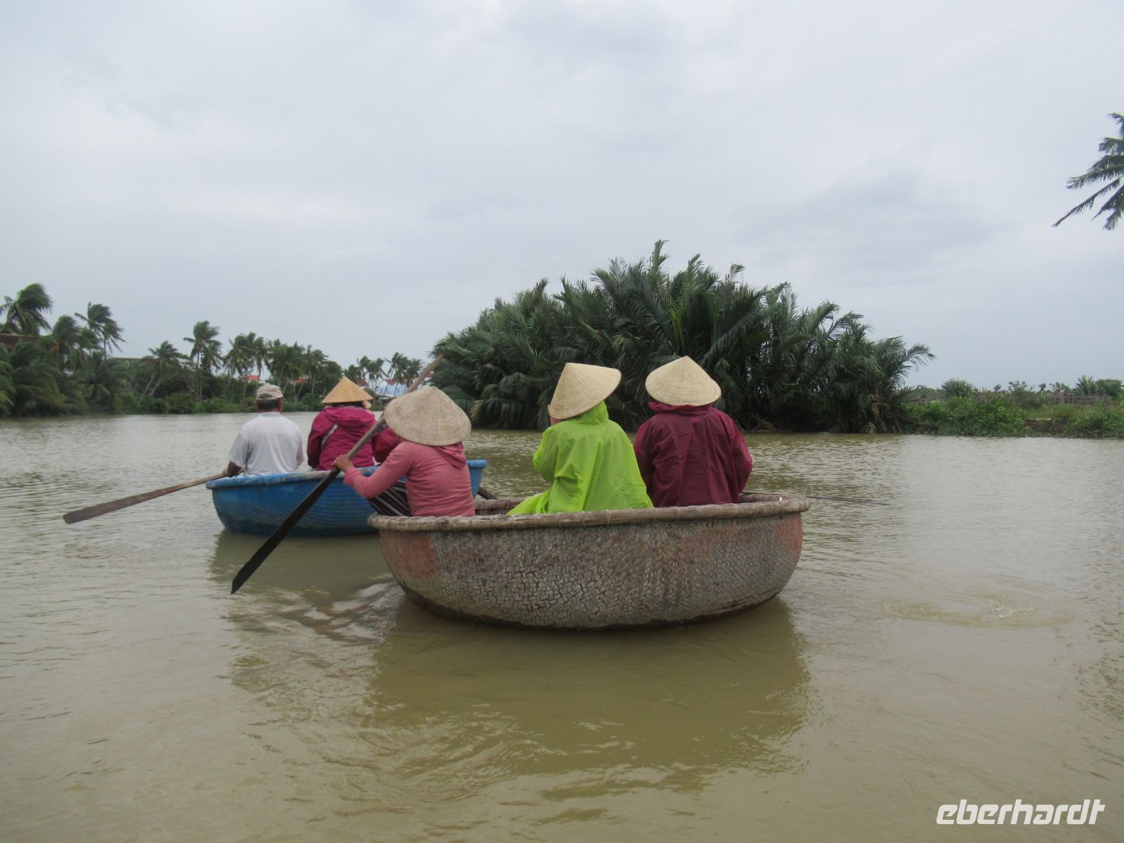 Ob wir noch die Bootstour in den runden Bambusbooten wagen? Alle sagen ja und so organisieren die Gastgeber es schnell und wir laufen zu der kleinen Anlegestelle des Flusses Hô. Fünf kleine runde Boote nehmen je zwei Gäste auf und das Bootchen wird von den Einheimischen gesteuert.
