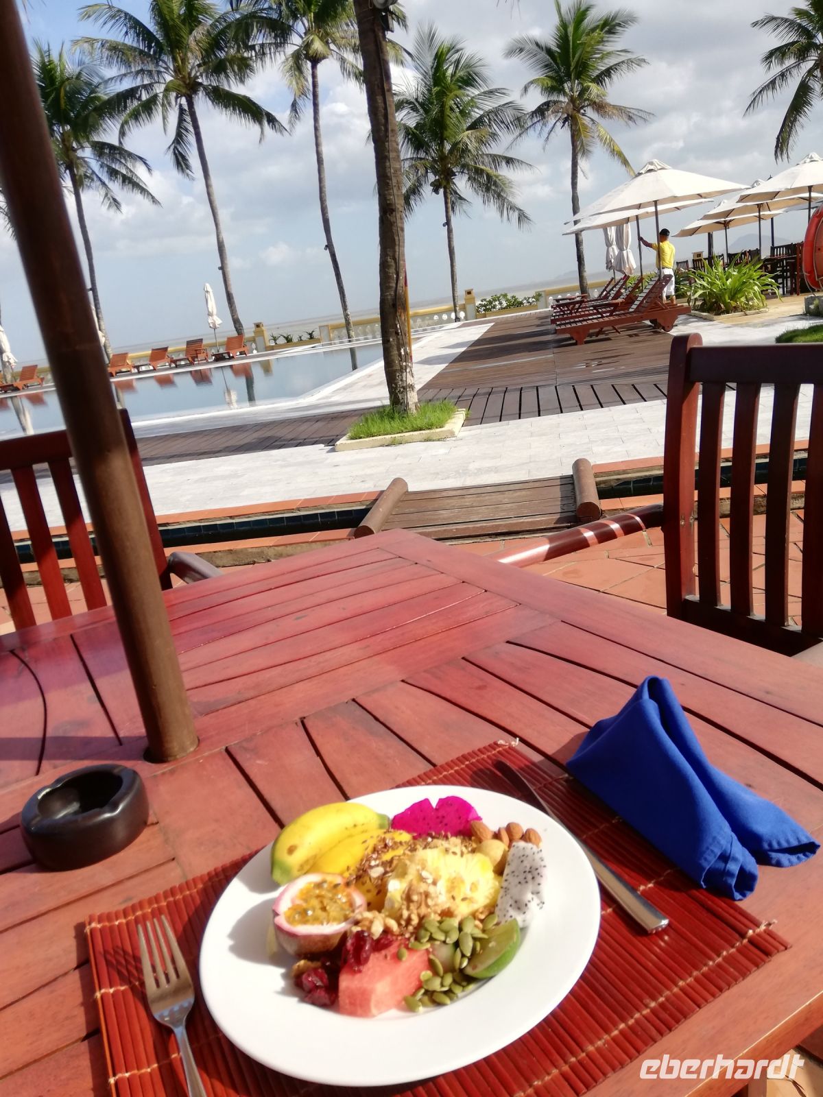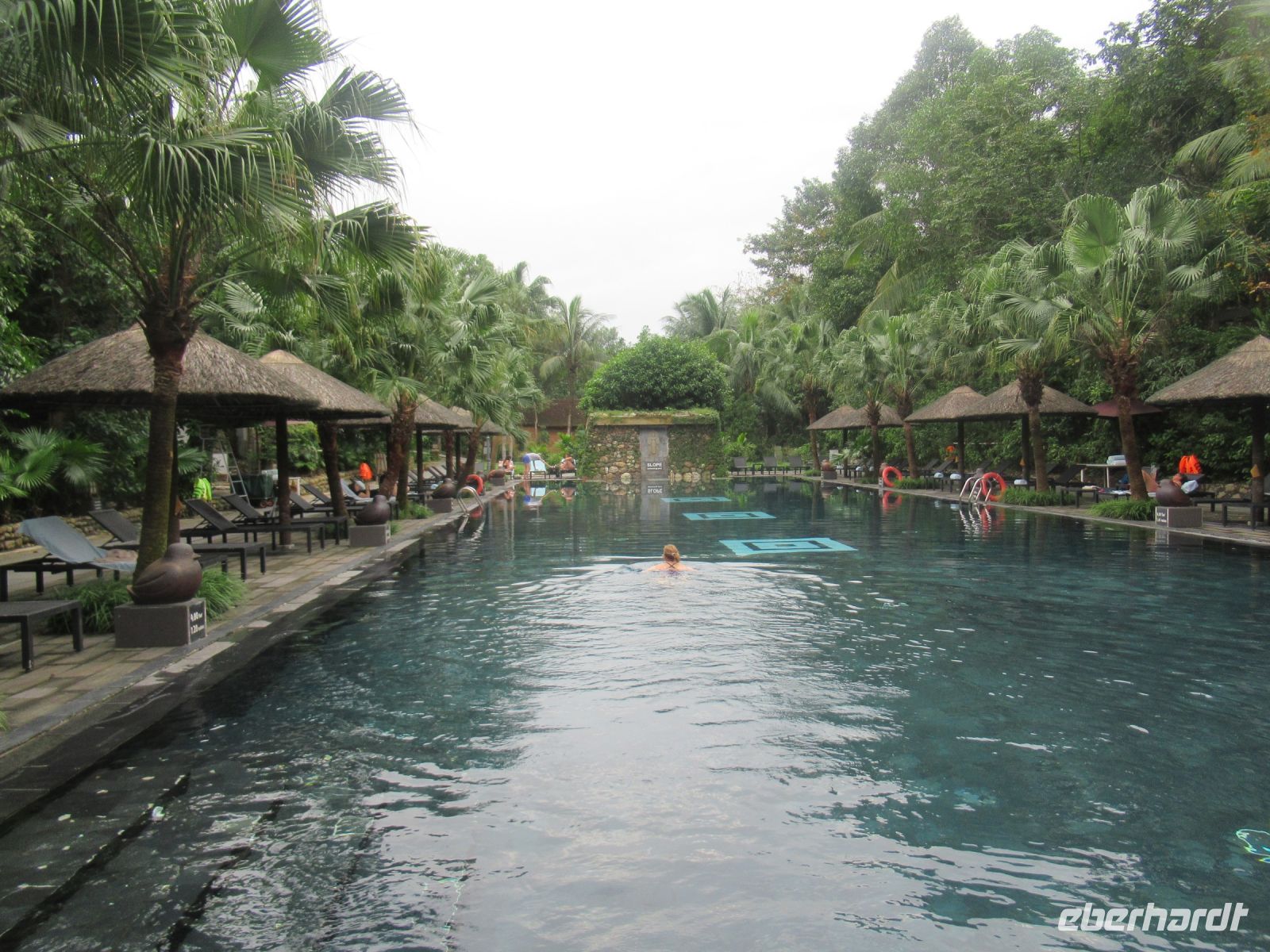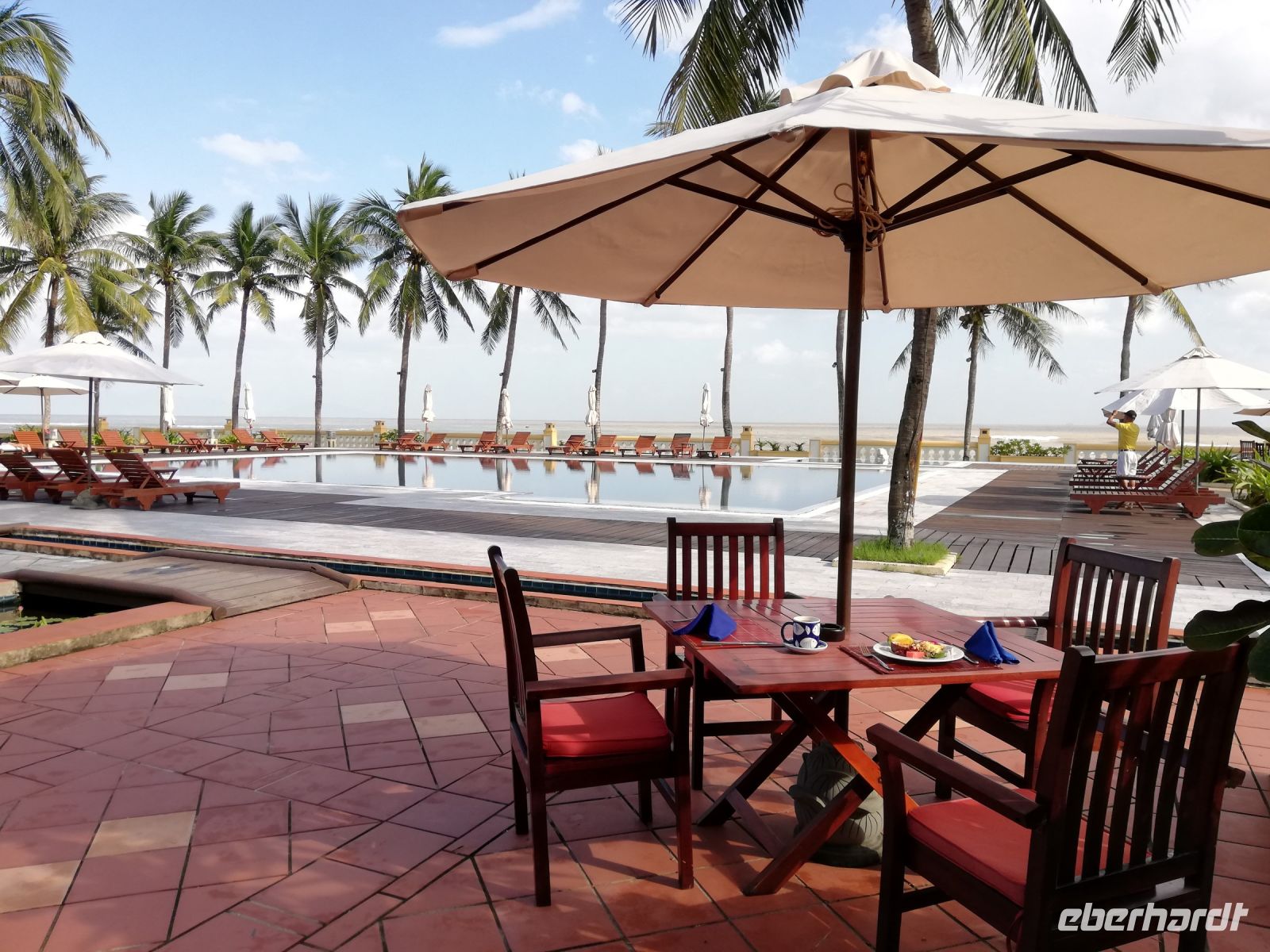 Die Frühaufsteher konnten sich schon vor dem Frühstück im Swimmingpool erfrischen. Nach und nach tref-fen wir uns auf der Terrasse des großen Frühstückspavillon beim üppigen Frühstücksbüffet, das keine Wünsche offenlässt.