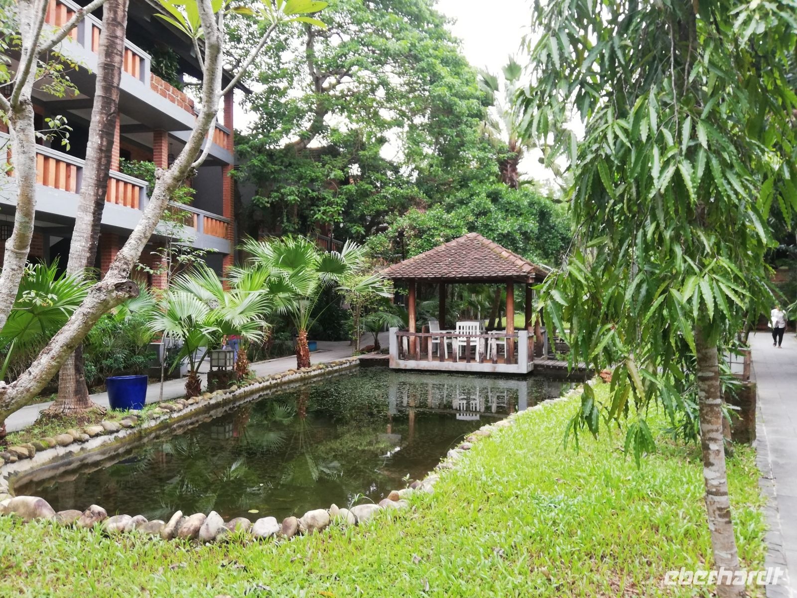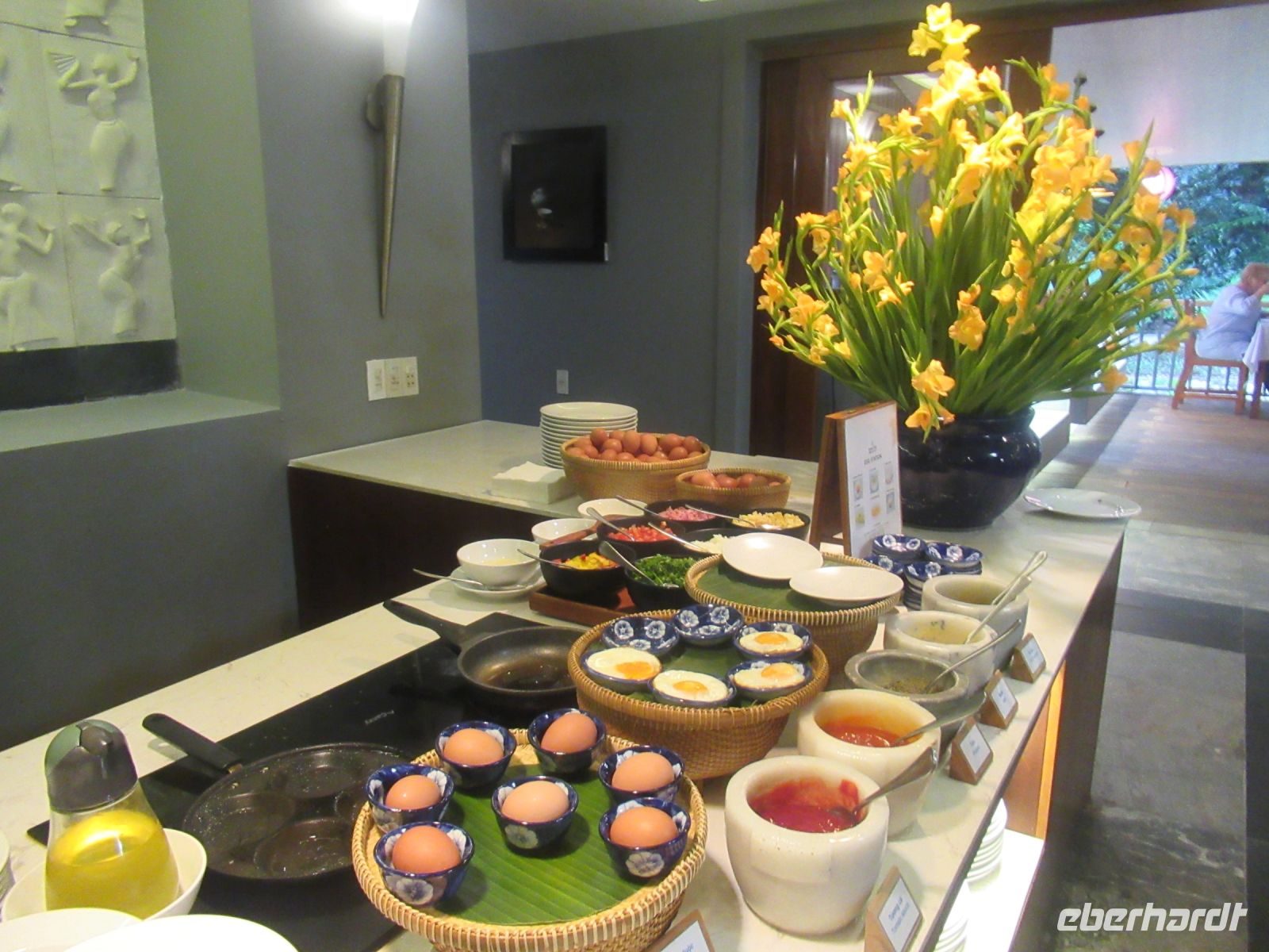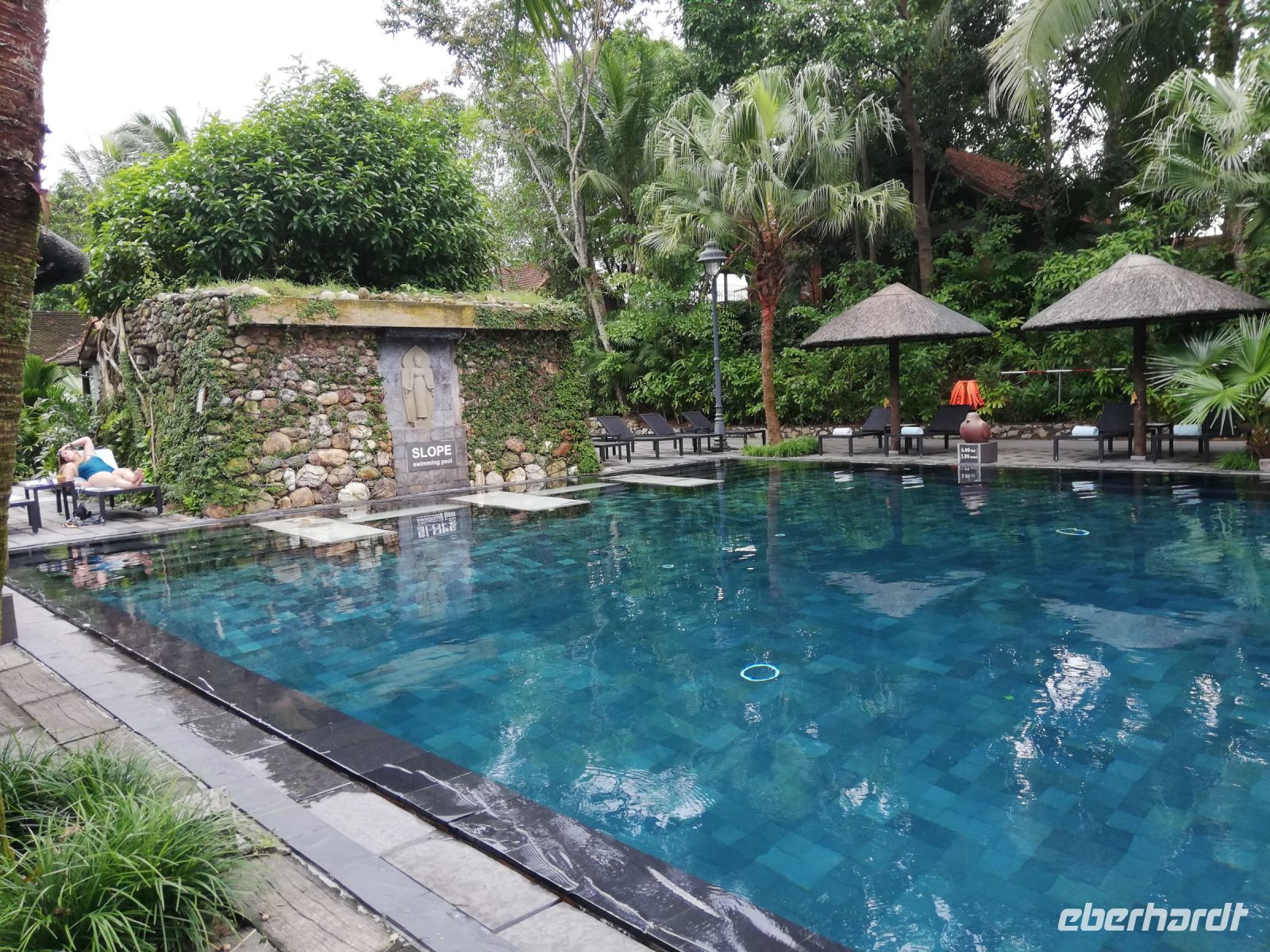 Die Frühaufsteher konnten sich schon vor dem Frühstück im Swimmingpool erfrischen. Nach und nach tref-fen wir uns auf der Terrasse des großen Frühstückspavillon beim üppigen Frühstücksbüffet, das keine Wünsche offenlässt.