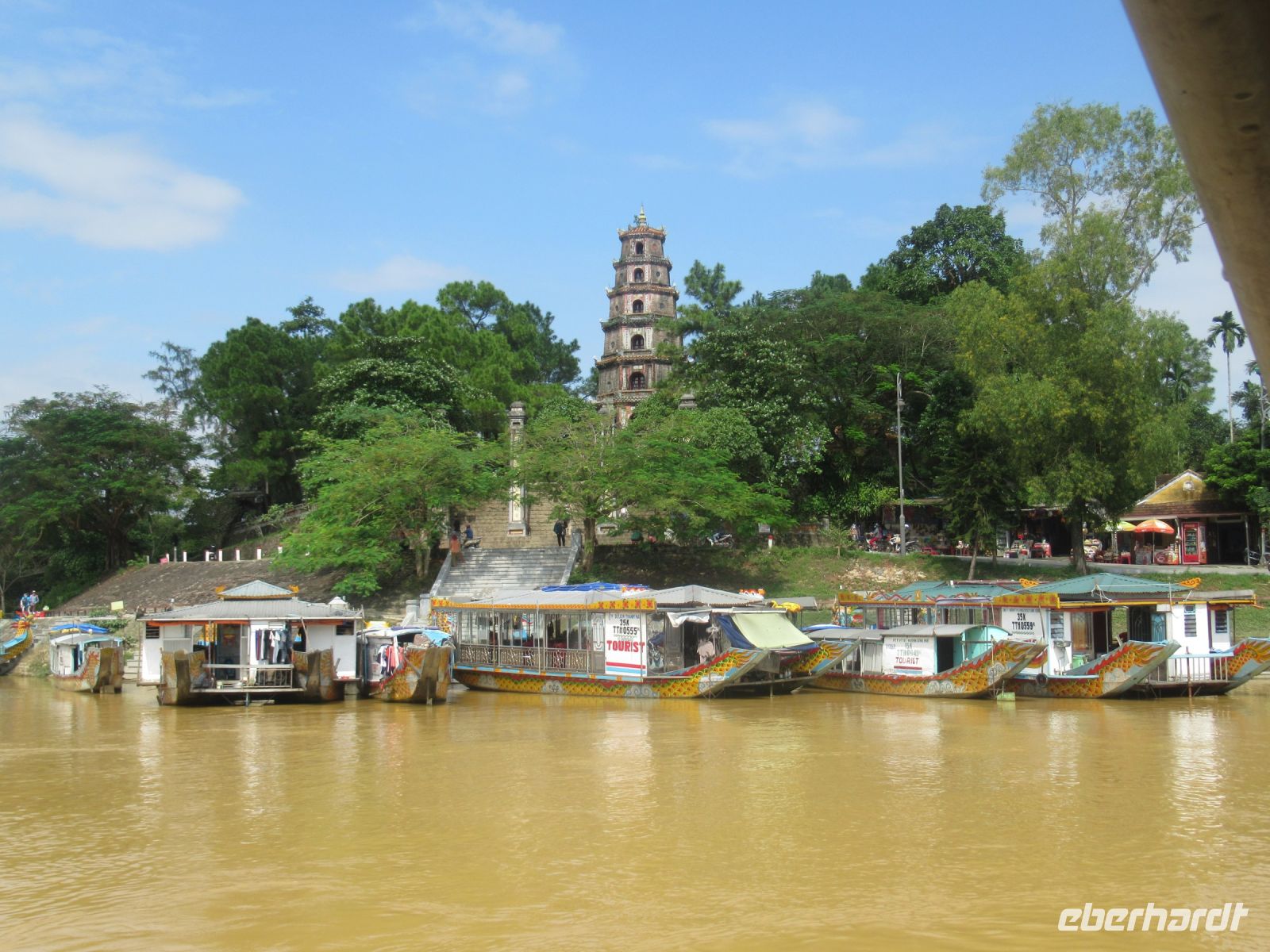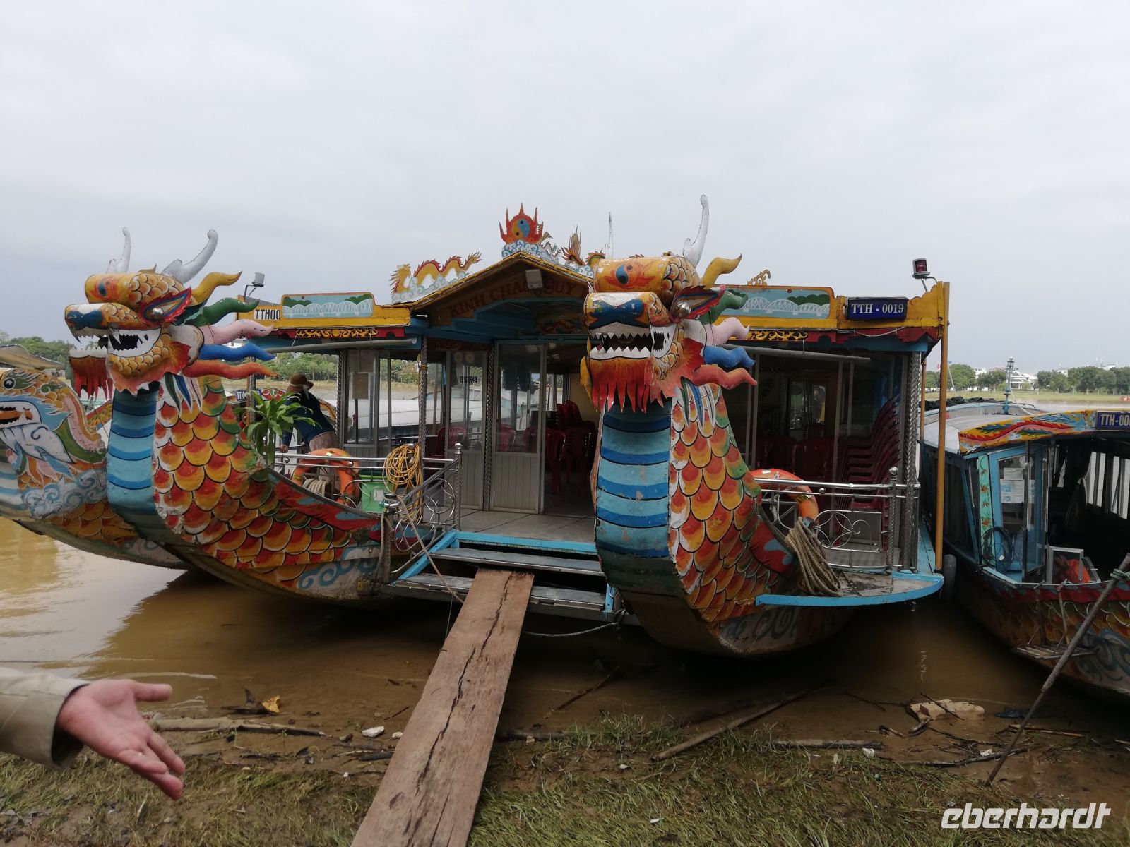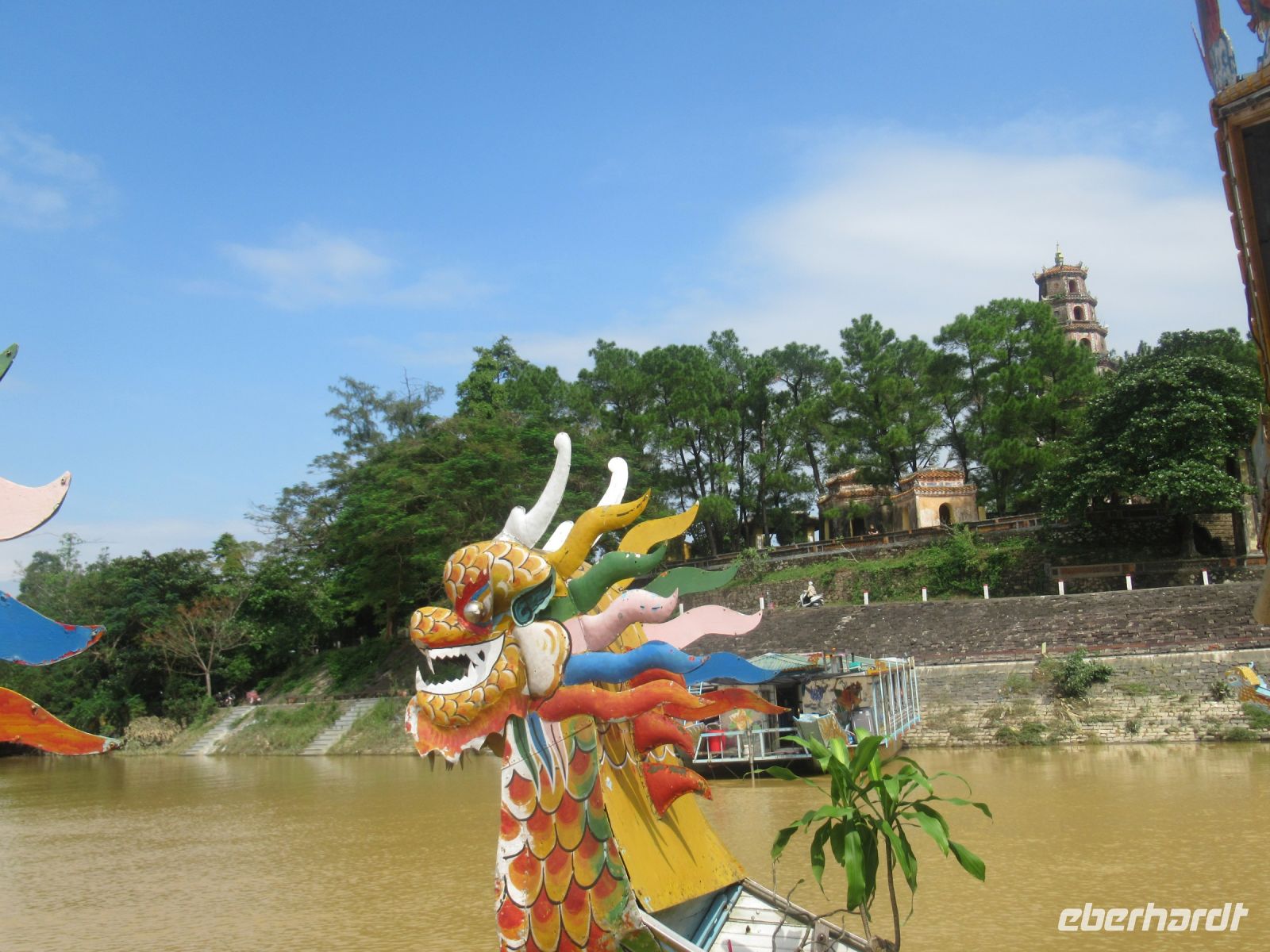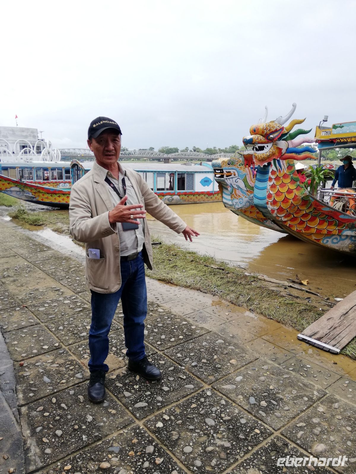 Oh, es beginnt wieder zu regnen… so müssen wir noch kurz unsere Kleidung anpassen und Regenschirme holen. Unser Busfahrer und Tim warten schon auf uns und nach einer kurzen Busfahrt sind wir schon an der Anlegestelle der „Drachenboote“ am Parfumfluss. Eine Stunde schippern wir mit Boot am Parfumfluss und bewundern die Landschaften rechts und links des Flusses.