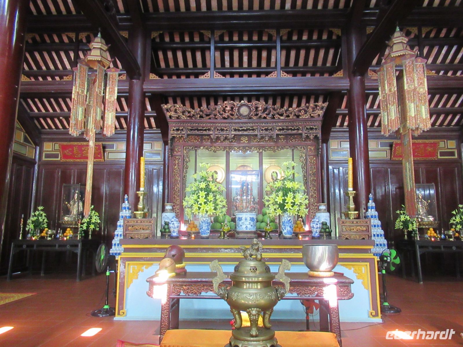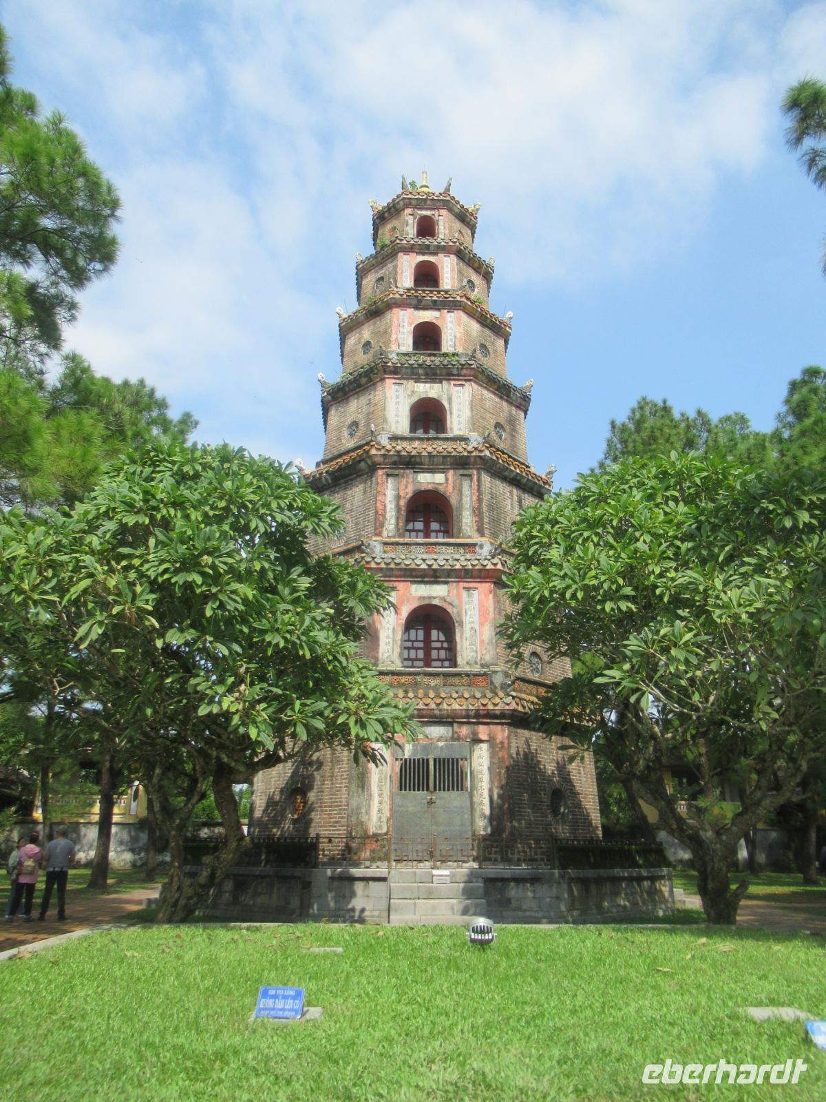 Von unserem Schiff sehen wir zunächst die „Thien Mu Pagode“. Wir verlassen das Schiff und betreten das Gelände der Pagode. Hier kamen uns ein paar Damen in typischen vietnamesischen Kleider entgegen, wie eine Modeschau, und mit Ihren bunten Kleidern haben Sie uns eine Weile als Models ein Fotoshooting gewährt. Aber zurück zu Pagode: Die Thien Mu Pagode ist insgesamt sieben Stockwerke hoch, damit die höchste Pagode Vietnams und ist das Wahrzeichen von Hue. Erbaut wurde diese im Jahre 1601 von Nguyen Hoang, der der kaiserlichen Familie angehörte. Wir beschreiten die Tempelanlage mit einigen Gebäuden. Neben der Thien Mu Pagode ist eine gigantische Bronzeglocke, deren Klang angeblich bis zu 10 Kilometer weit zu hören ist. Diese Glocke wurde 1710 speziell für die Thien Mu Pagode angefertigt und wiegt 2052 Kilo.