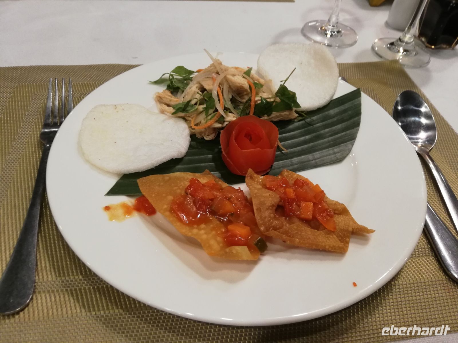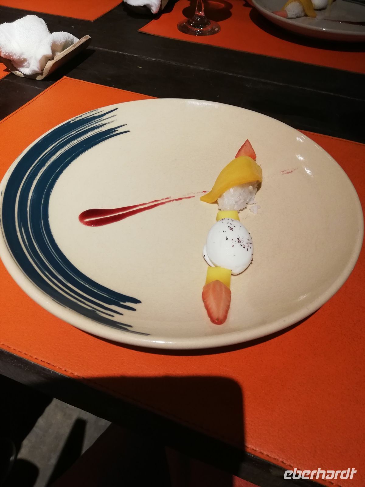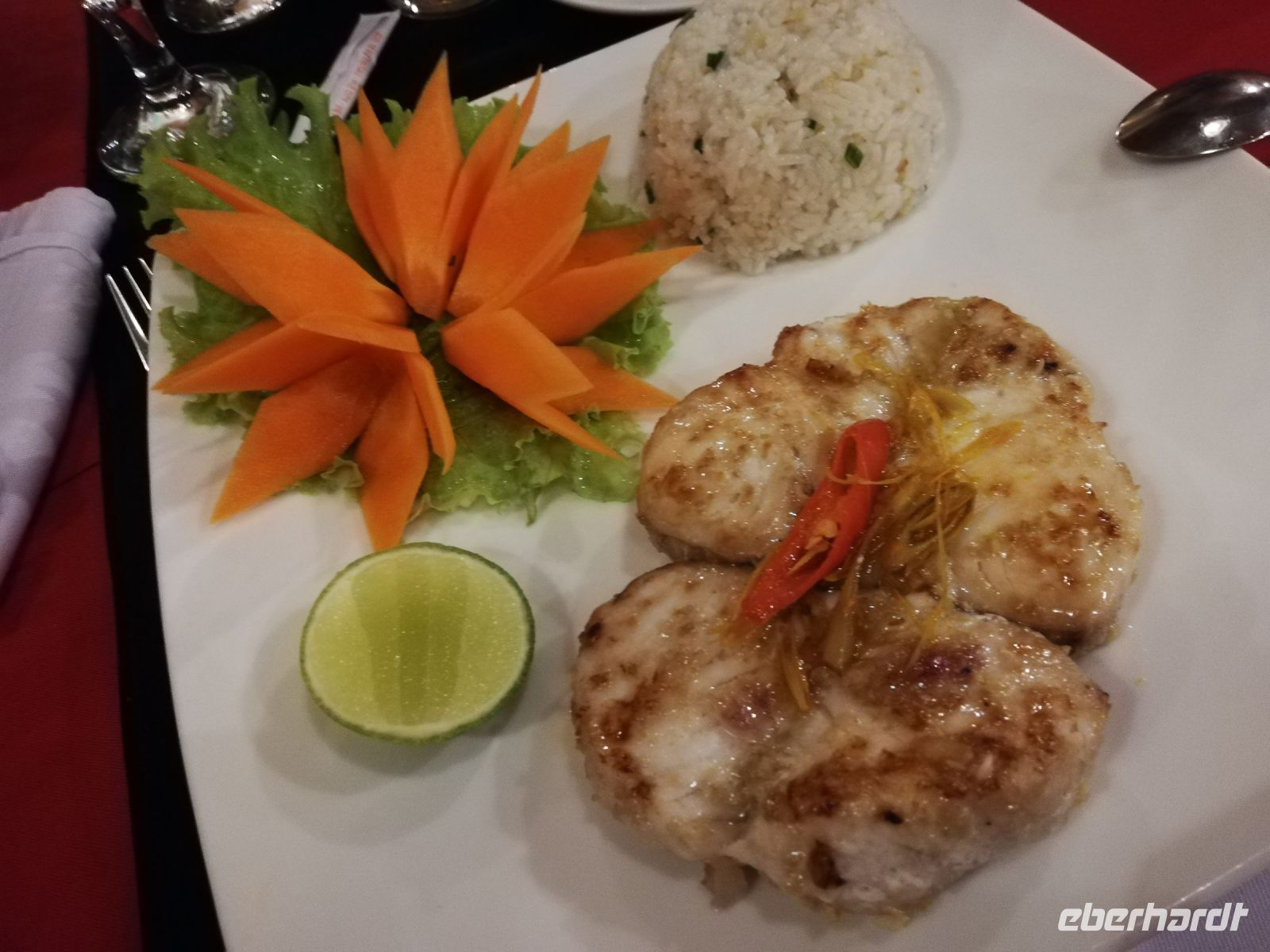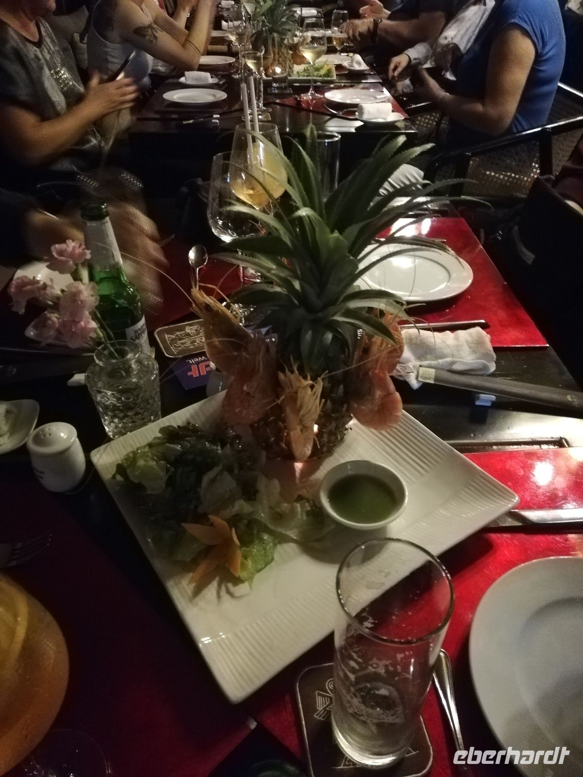 Garnelen auf Ananas serviert, Fisch oder Fleisch, sowie Dessert, nicht nur geschmacklich ein Genuss, sondern auch eine Augenweide ist das Kocharrangement, das wir von der engagierten Crew serviert bekommen.