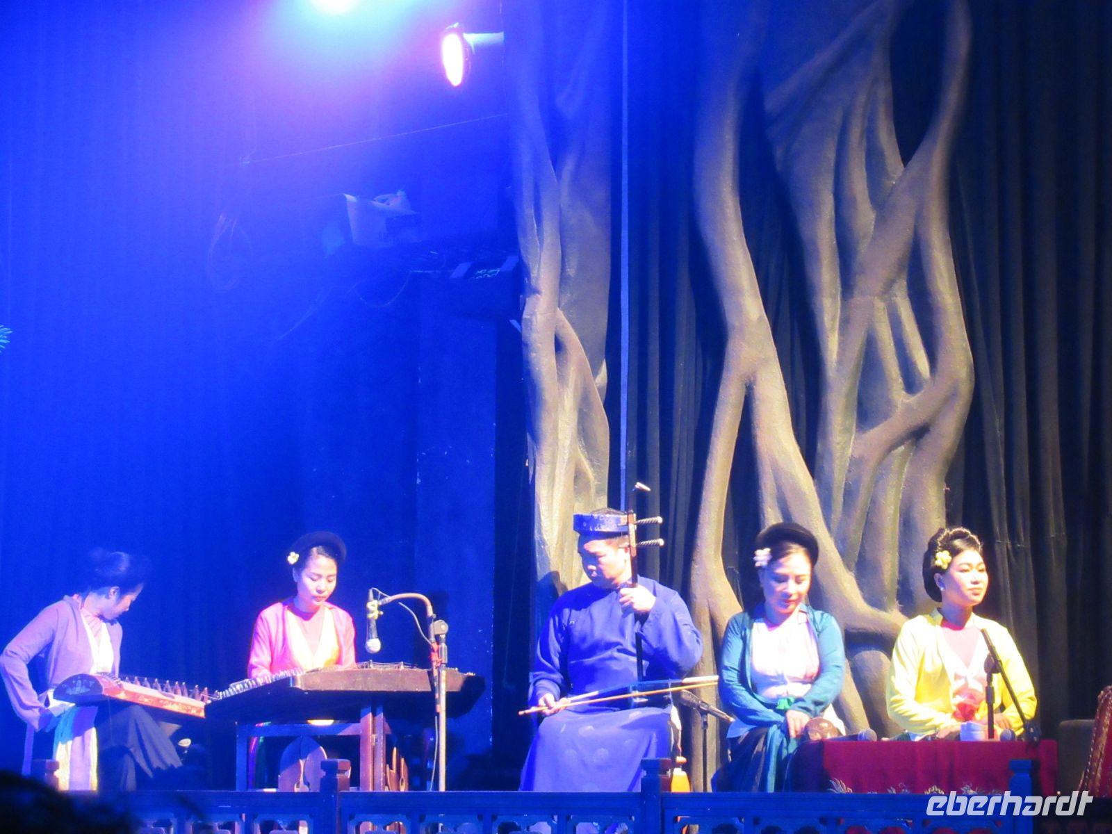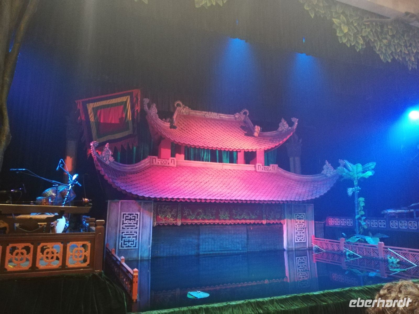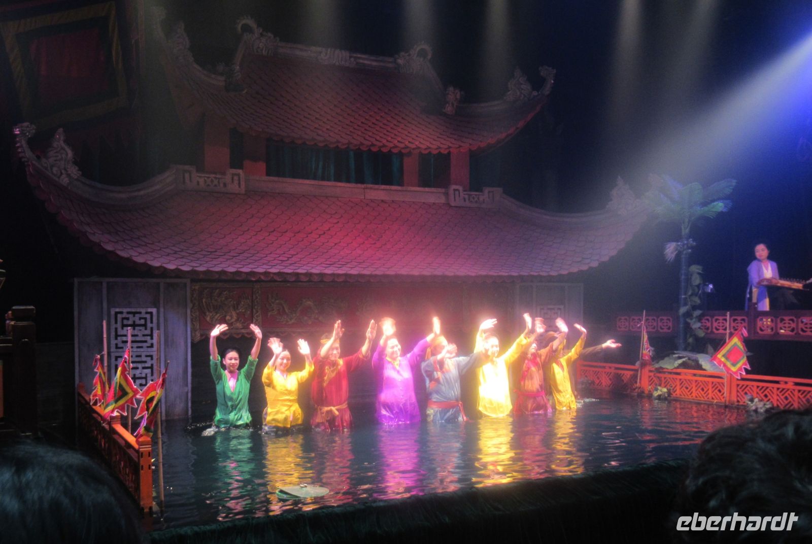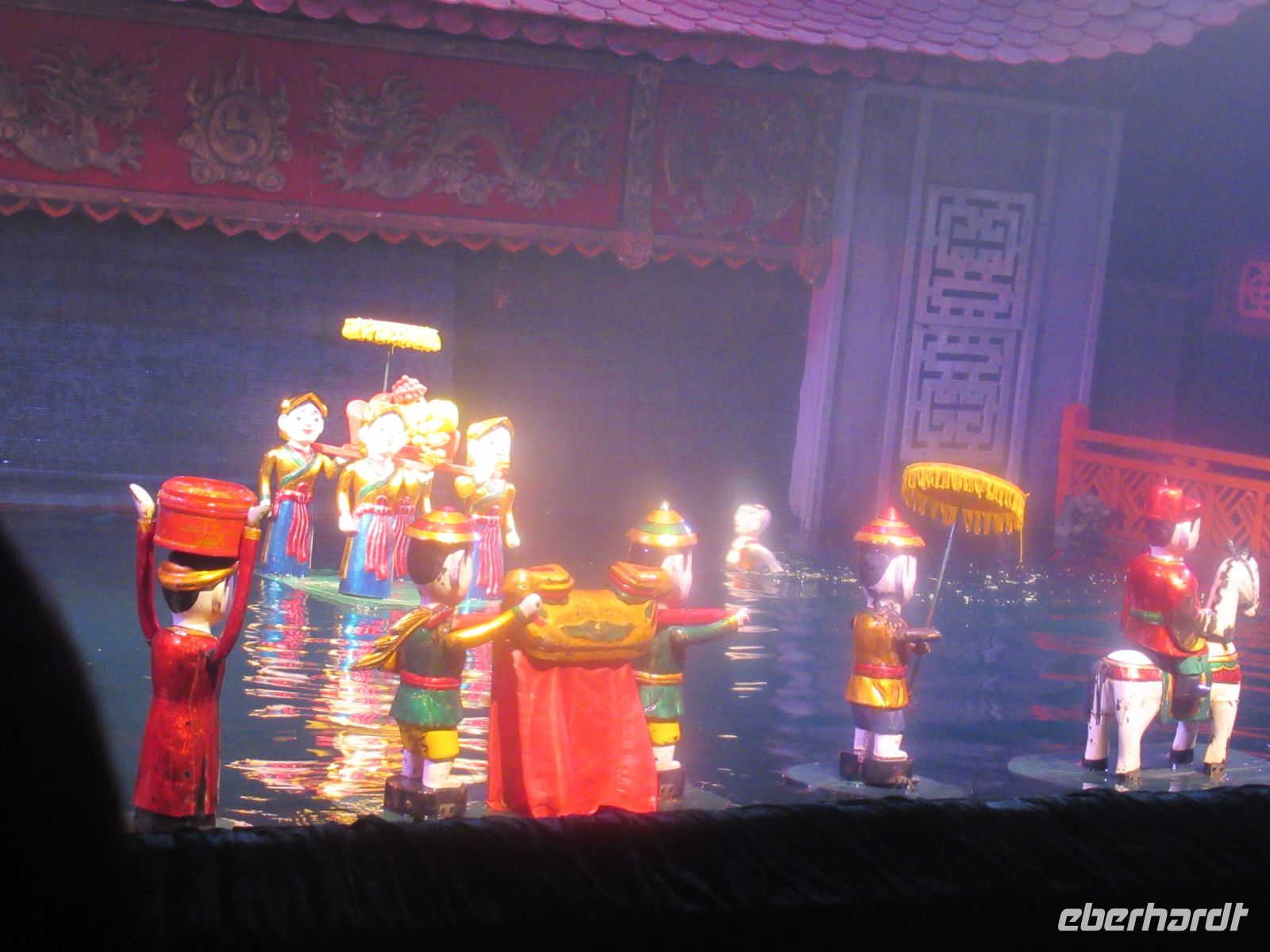 Den Zuschauern bleiben die Marionettenspieler verborgen. Sie stehen hinter einer Bühnenwand im Wasser und bewegen von dort aus mit langen Stäben die Holzfiguren. Es werden Motive von Landeleben der Fischer und Bauer gezeigt, aber auch die Kämpfe der Drachen und Königsprozession. Ein wunderschönes Theater mitten in Hanoi bietet bis zu drei Vorstellungen am Abend und es ist ausverkauft. Auf den Seiten der Bühne sind Sänger und Musiker platziert, die sehr kunstvoll die Szenen begleiten und außer wunderschönen Gesang und Musik wird auch jedes Geräusch auf der Bühne „in time“ und live begleitet. Einfach entzückend und eine künstlerische Leistung mit allen Facetten! Am Ende zeigen sich die Künstler, hinter den Kulissen, stehend im Wasser, dem Publikum.
