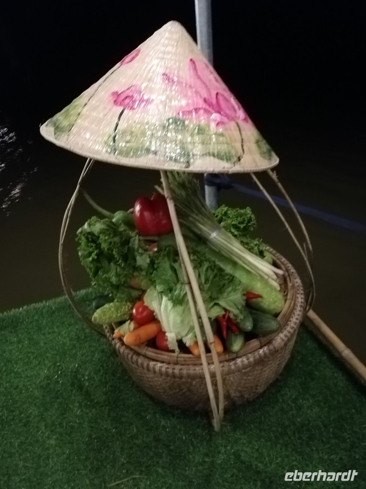 Nach dem Abendessen gibt es auf dem Deck hinter der Bar eine kleine Vorführung, wie man Obst und Gemüse kunstvoll schneiden kann. Wir lernen selbst oder schauen zu, wie man Frühlingsrollen einwickelt und mit welchen Zutaten wir sie füllen können. Zum Abschluss werden vietnamesische Weine, die eher Liköre sind, zum Verkosten angeboten. Jetzt verlassen auch die letzten Gäste das Deck und lassen sich vom Schiff in den Schlaf schaukeln.