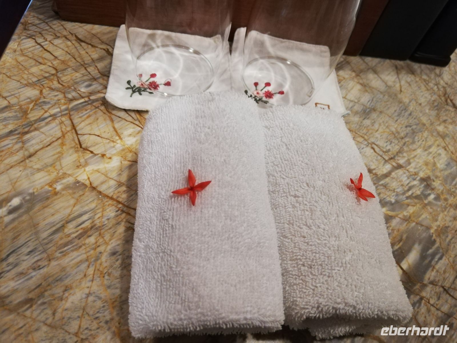 Gegen 14 Uhr geht es aber zurück ins Hotel. Bevor wir in die Zimmer gehen, bringe ich den Reisschnaps und die kleinen Gläschen – als Reisebegleitung muss ich doch dafür sorgen, dass die Gäste nicht krank werden… ?.