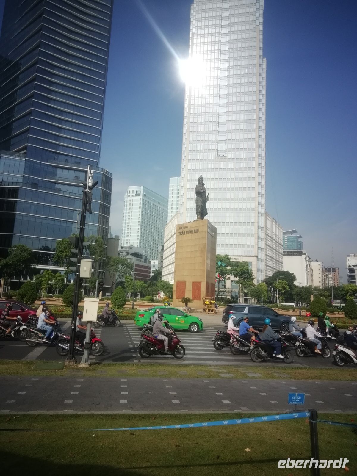 Mit Taxi fahren wir zu dem Bitexco Financial Tower – Mit einer Höhe von 265,5 m war er bei seiner Fertigstellung 2010 das höchste Gebäude in Vietnam. Heute gibt es in Ho-chi-Ming Stadt einen zwei-ten Wolkenkratzer „Landmark 81“, der mit 461 m aktuell das höchste Gebäude in Vietnam ist. Wir genießen die Ausblicke von Skydeck des Bitexco Tower und betrachten die farbenwechselnden Wolkenkratzer rundum und die Dimension der Stadt von oben. Dann laufen wir am Ufer des Flusses und überqueren eine der am stärksten befahrenen Straßen der Stadt. Das haben wir die Tage schon et-was geübt, aber dazu braucht man wirklich Mut. Warten auf grünes Licht eines der wenigen Semaphors hilft auch nicht. Hunderte… tausende Motorräder und Autos strömen durch die Stadt und so muss man einfach zügig losgehen und sich zwischen dem Strom kleine Lücke suchen und einfach durch. Wir sind Alle auf der anderen Seite der Straße!