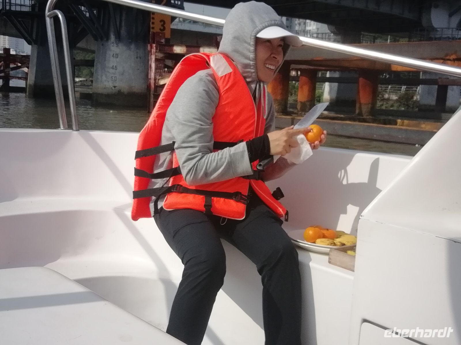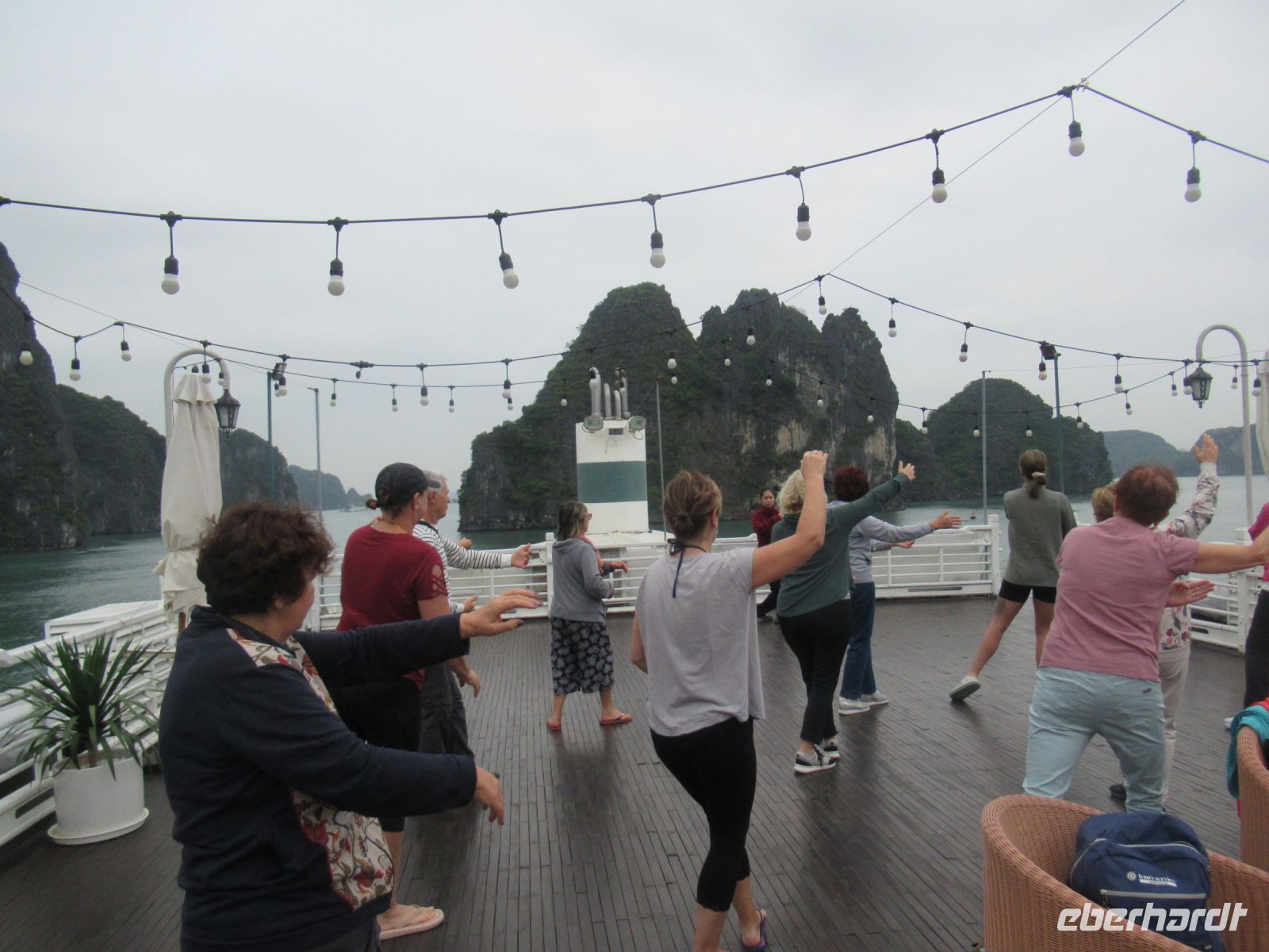 Den Tag können wir mit dem bekannten Spruch „Morgenstund hat Gold in Mund“ starten. Denn es kommen doch recht viele um 6:15 (!) zu Tai-Chi Übungen aufs Deck. Es füllt sich wirklich sehr gut an, mit den anderen Gästen unsere noch müden Muskeln und Knochen zu bewegen und den sanften Bewegungen unserer Allround-Betreuerin Anna zu folgen. Zum Abschluss dürfen wir uns noch von dem hinter uns stehendem Nachbarn den Rücken massieren lassen und das Gleiche an den vor uns stehenden Nachbarn weitergeben. Nach und nach kommen auch die anderen Gäste und wir nehmen zusammen ein kleines Frühstück ein.