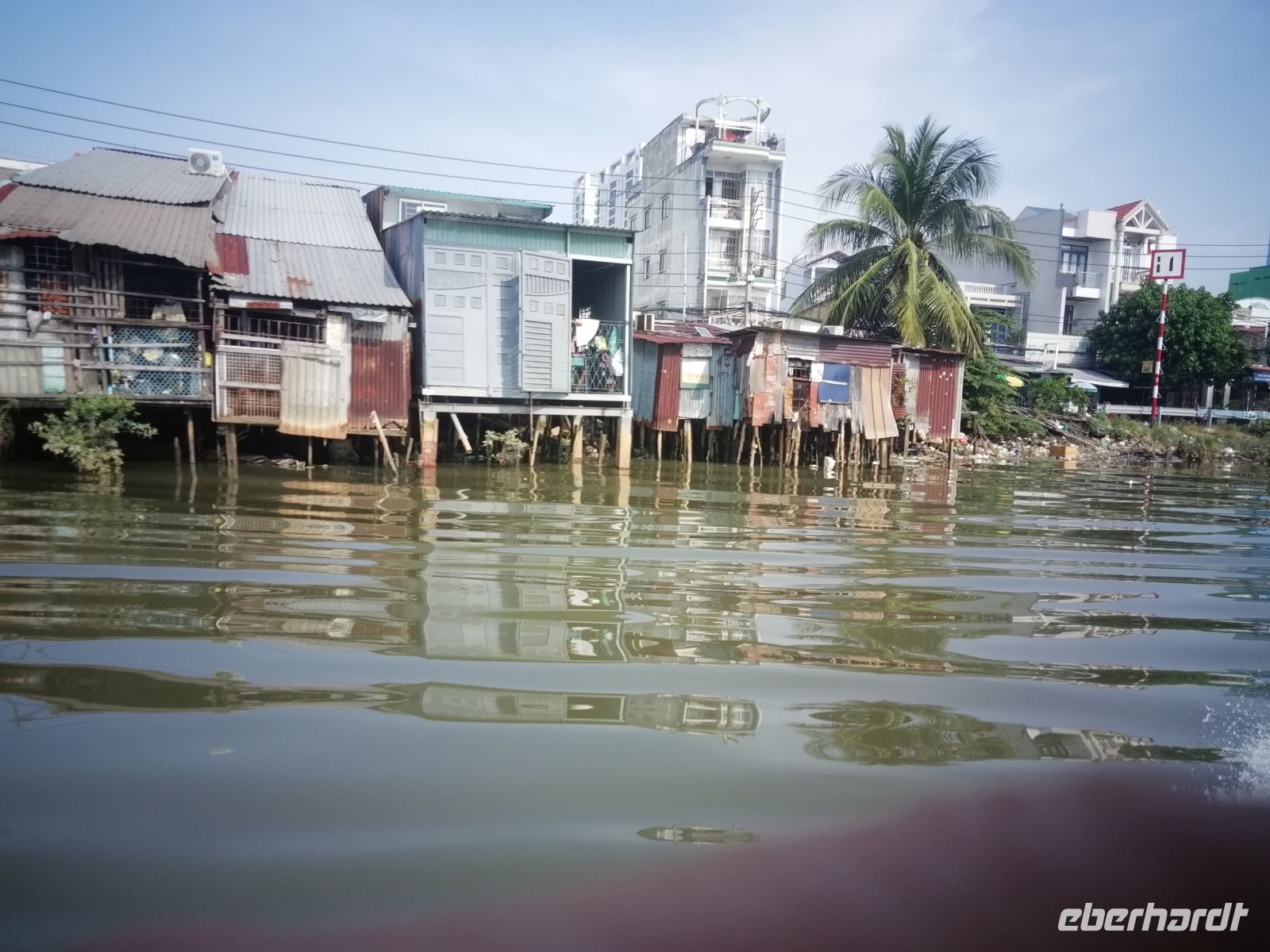 Eine junge Vietnamesin wird uns durch den Tag begleiten. Nach kurzer Zeit serviert sie uns frisch geschnittenes Obst – Melone, Drachenfrucht, Mandarinen, sowie Getränke. Wir starten mit richtigem Speed am Saigon Fluss. Kurz danach verändert sich das Bild sehr schnell; kleine Häuser die teils im Fluss auf Stelzen stehen, bedeckt mit Wellblech, säumen die Ufer des Flusses. Zu einem idyllisch, aber auch sehr einfach oder ärmlich, sind die Häuschen der hier lebenden Einwohner.