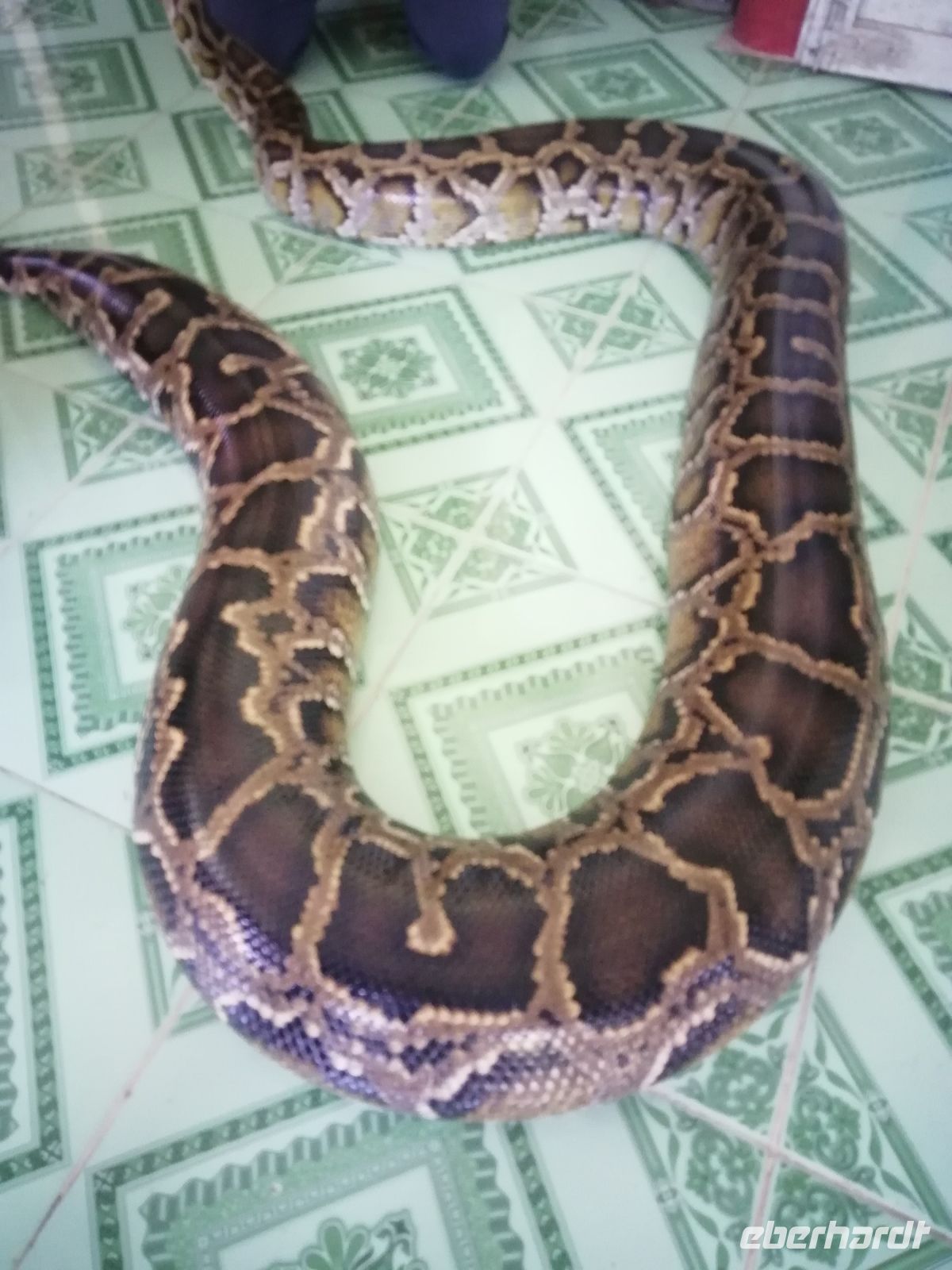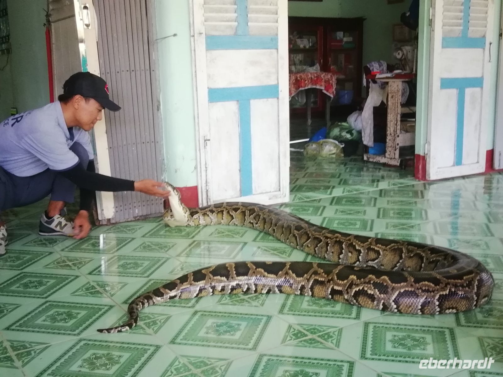 Nach ungefähr anderthalb Stunden abenteuerlicher Fahrt erreichen wir einen kleinen Ort und besuchen eine Bauernfamilie, die Pythons züchten. Einige mutigen Gäste dürfen die riesige Schlange um den Hals legen und in den Händen halten, schon etwas komisches Gefühl – eine Mutprobe oder eine besondere Begegnung mit dem wunderschönen etwa 40 kg schweren „Tierchen“.