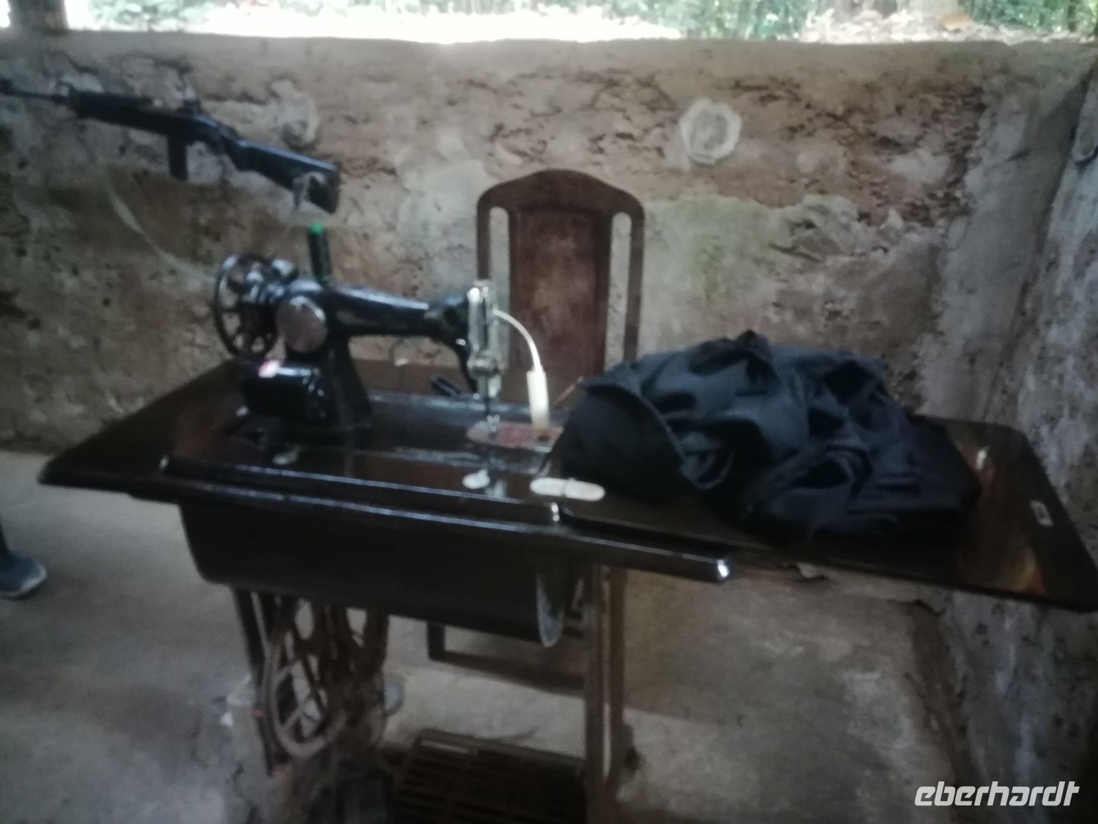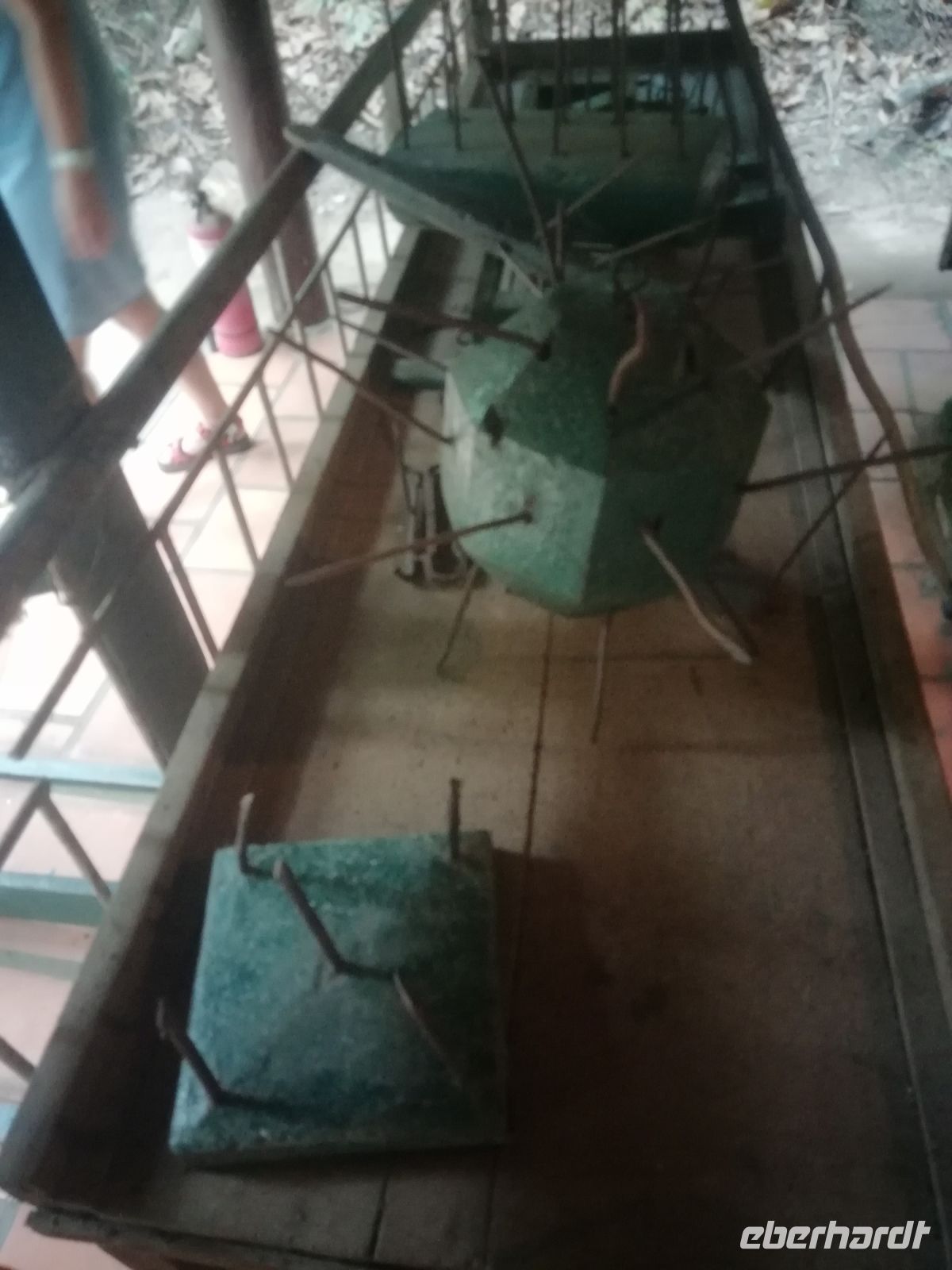 Etwas bedrückt schauen wir uns das Gelände an, interessant sind auch die Werkstätten, wo das Kriegsmaterial auch einfachste Weise hergestellt wurde. Beeindruckend war z.B. die Herstellung der Gummischlappen aus alten Autoreifen. Das Profil war rutschfest und die clevere Art der Vietnamesen, die Sohle in andere Richtung umzudrehen hat es den Feind in eine falsche Richtung geführt.