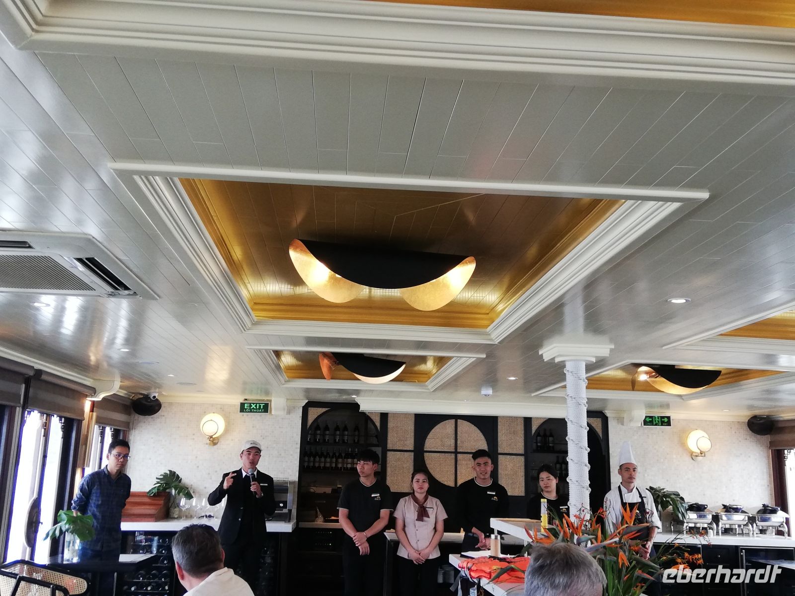 Wir treffen uns im Restaurant zum Mittagessen. Vorher stellt sich die Crew vor. Crew Manager Henry hat mir vorab einige Informationen zu dem Programm und Ablauf des heutigen Tages und dem Vormittag morgen gegeben. Das Menü wird serviert, wir sind am Schiff eine kleine Gruppe, den Rest bildet eine große italienische Gruppe.
