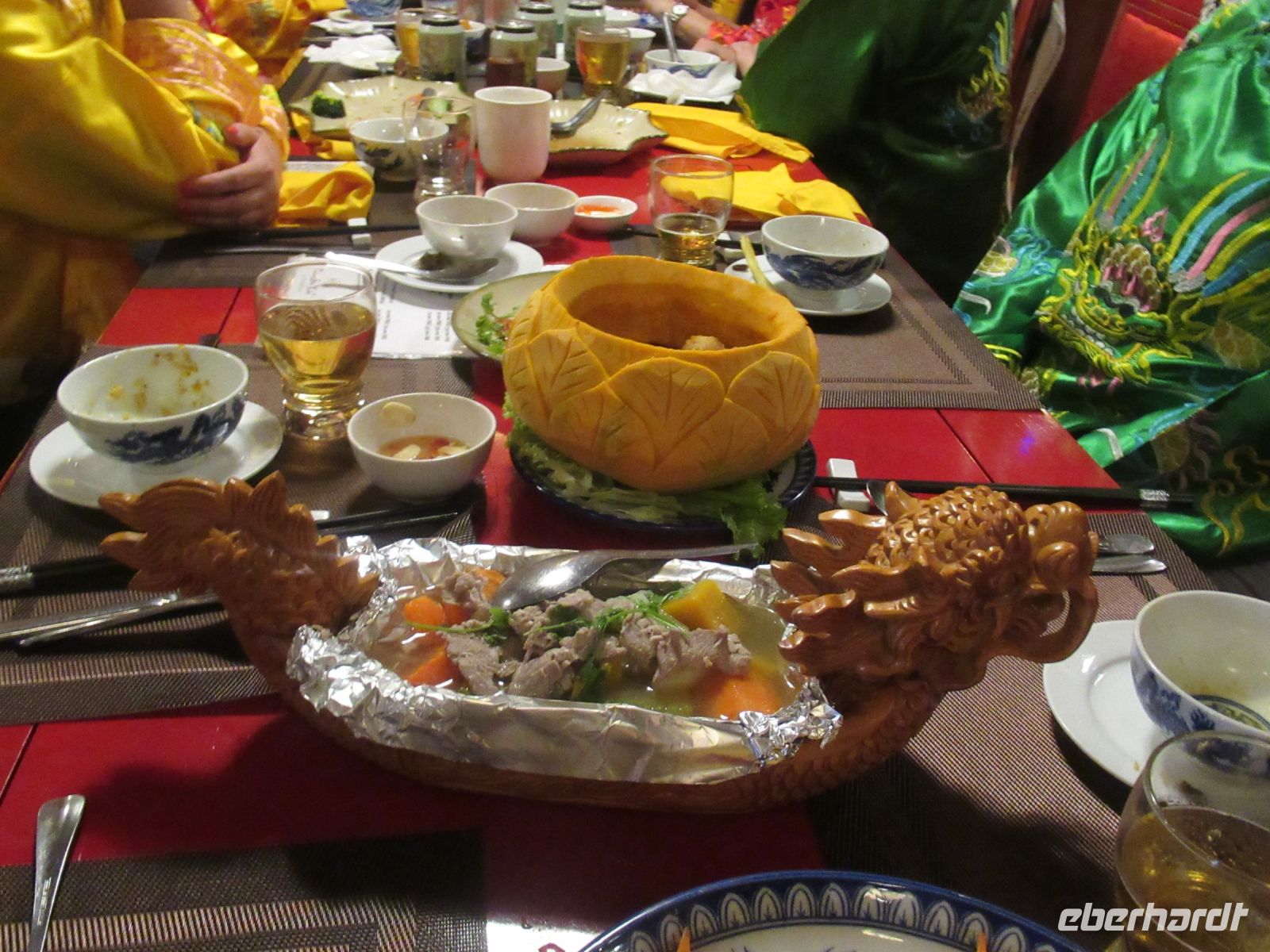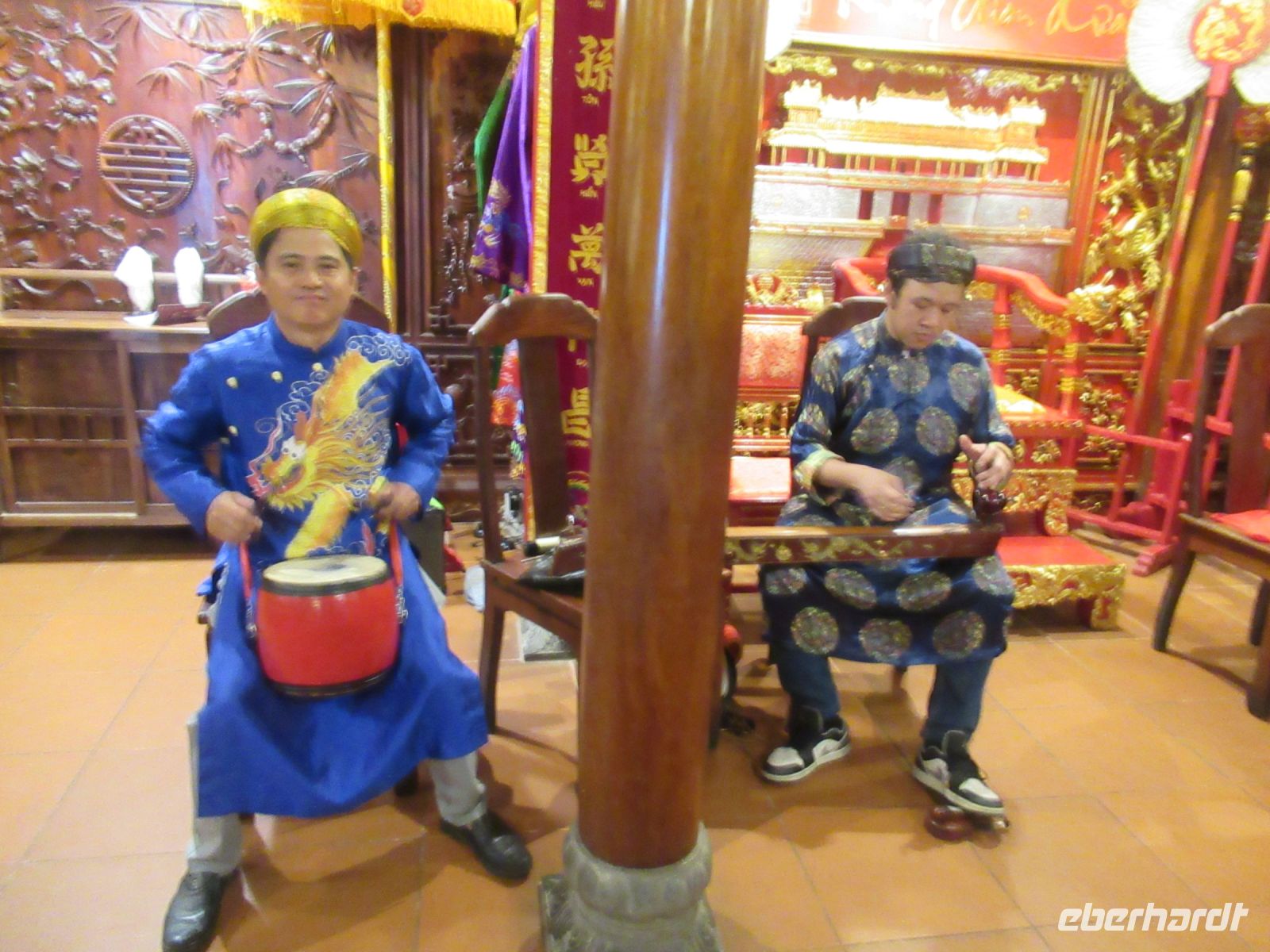 So langsam verabschieden wir uns von den beeindruckenden Werken und Schätzen der Vergangenheit und kehren in unsere Oase zurück. Aber kaiserlich endet heute der Tag mit einem „Kaiserlichen Abendessen“ im Restaurant KHONG GIAN XUA HUE. Hier werden wir noch im Vorraum des Restaurants in Brokat kaiserlicher Gewänder angekleidet und betreten in Prozession angeführt von dem „Kaiserpaar“ das Restaurant. Wir werden von Musikklängen und Gesang einer traditionellen vietnamesischen Musik empfangen und an die lange Tafel platziert. Ein sehr dekorativ angerichtetes Menü wird uns serviert. Die außergewöhnlichen Musikinstrumente können wir von ganz nah betrachten und die Sänger und Musiker zelebrieren mit viel Stolz ihre Tradition.