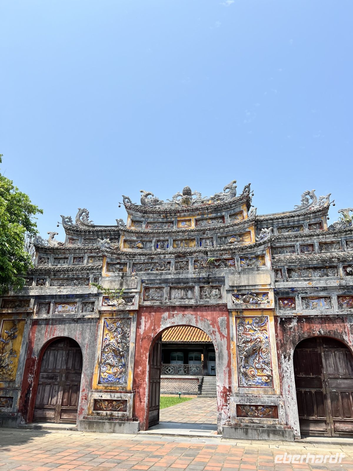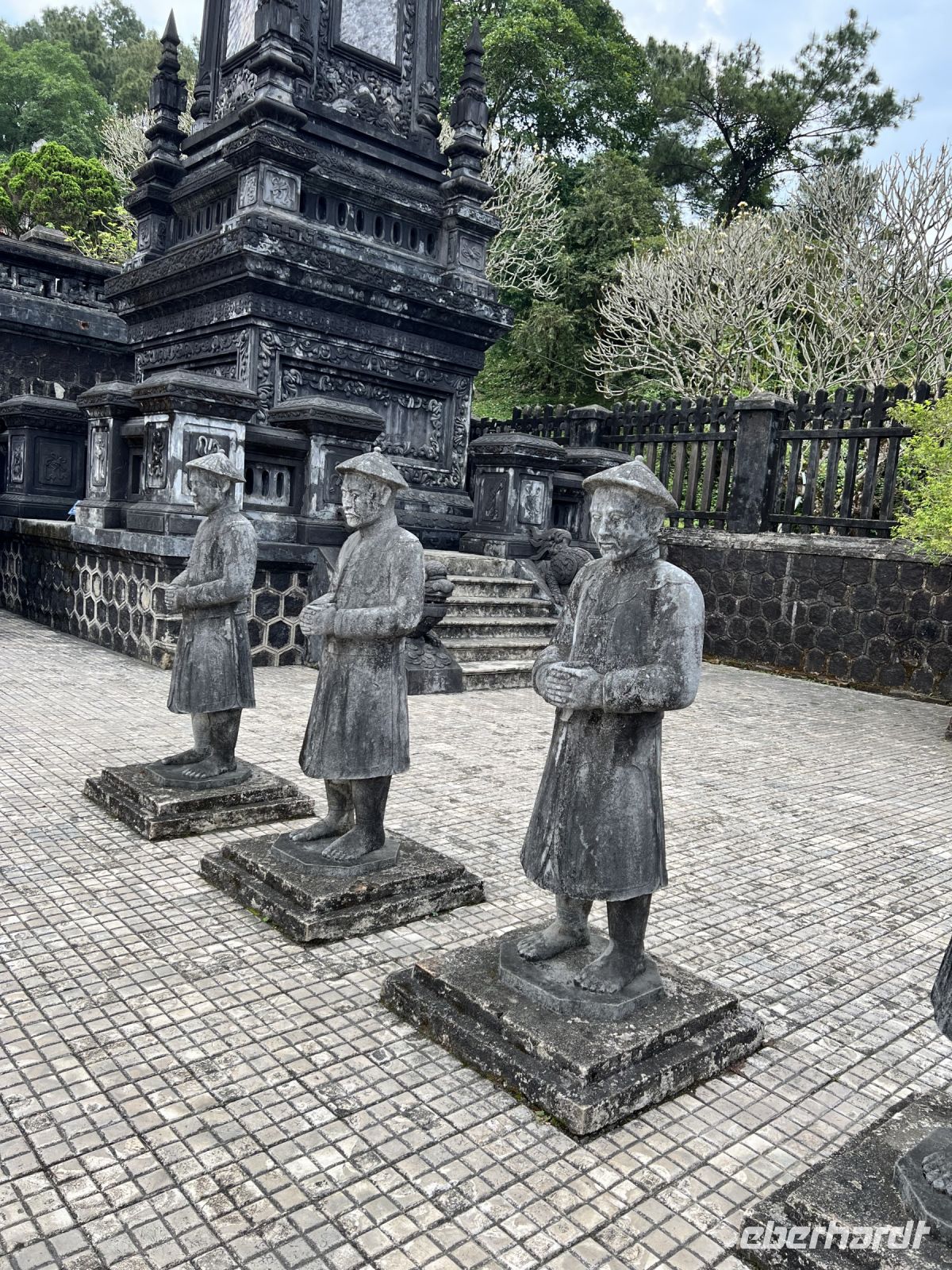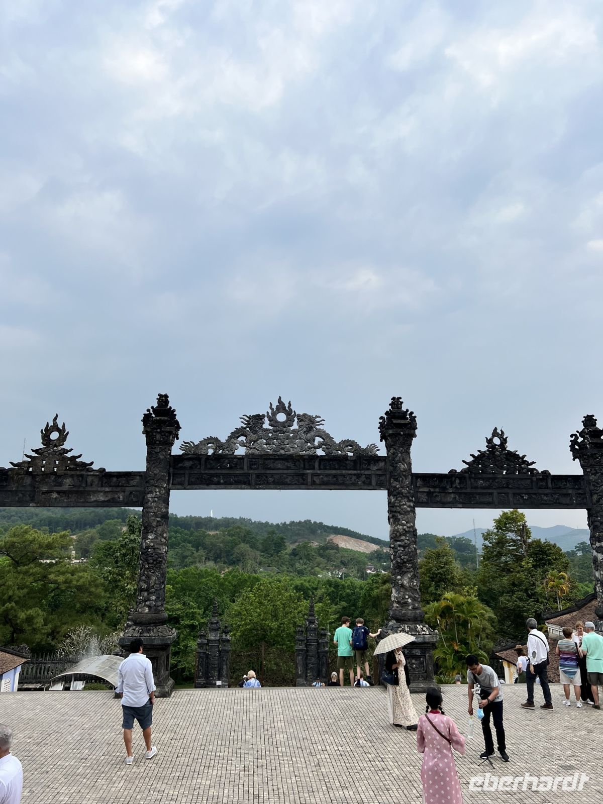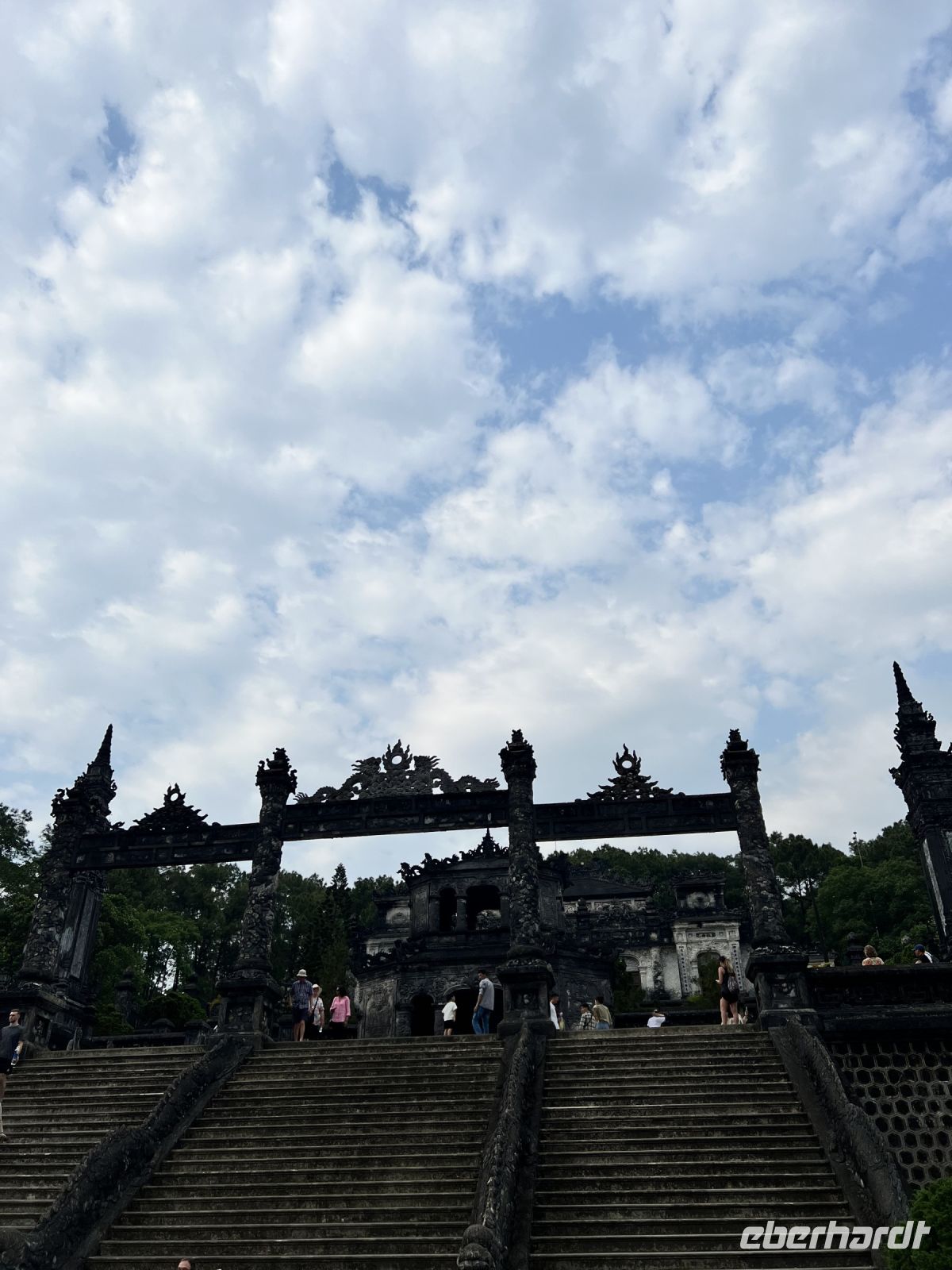 Nach einer Mittagspause spazierten wir noch durch den Kaiserkomplex, bis wir den Ausgang erreichten und weiter zum Mausoleum von Khai Dinh fuhren. Der Kaiser regierte zwischen 1916 und 1925 und liegt am Hang am Chau Chu Berg. Die Bauzeit betrug 11 Jahre und der Komplex besteht aus reinem Beton.