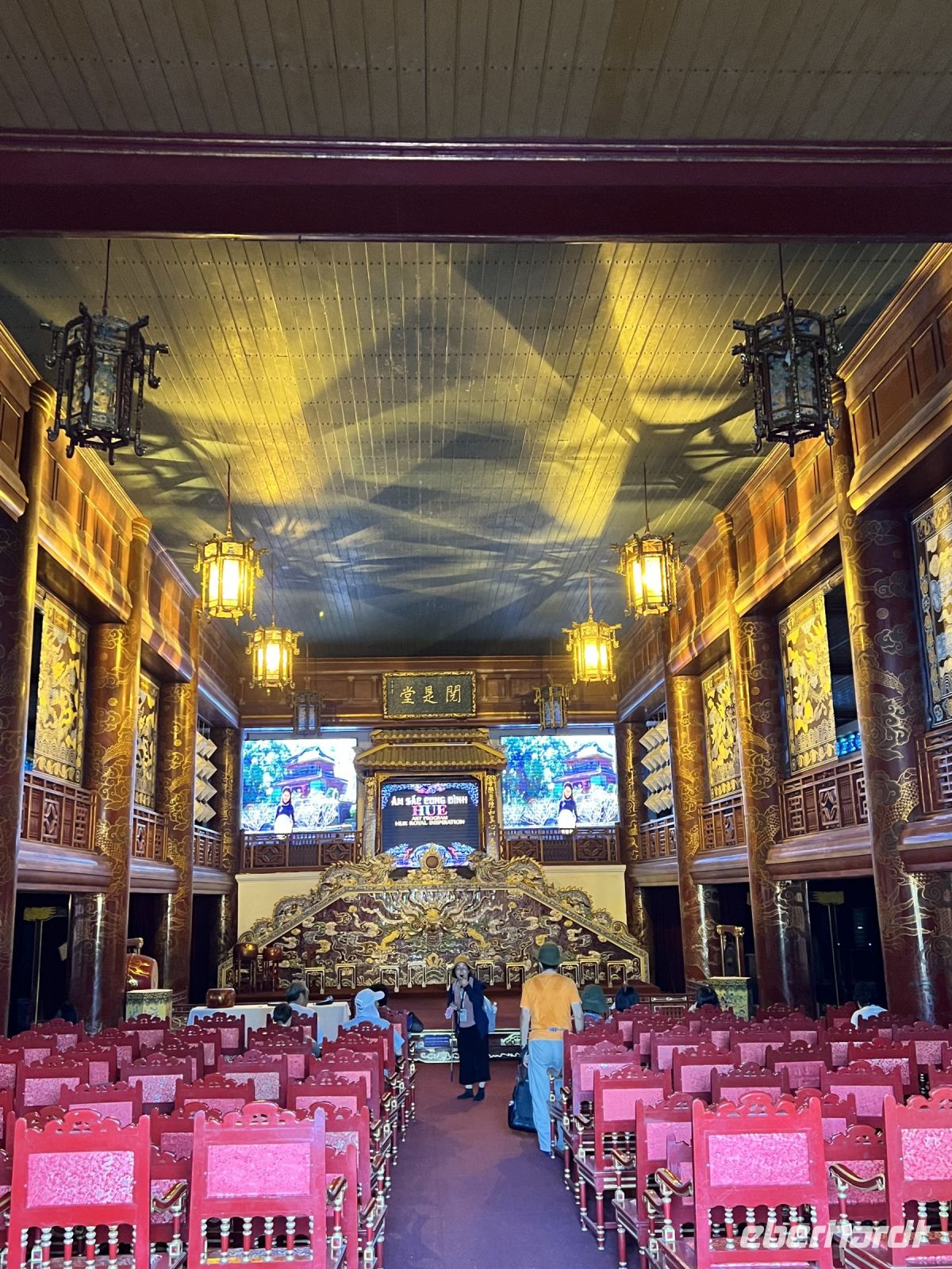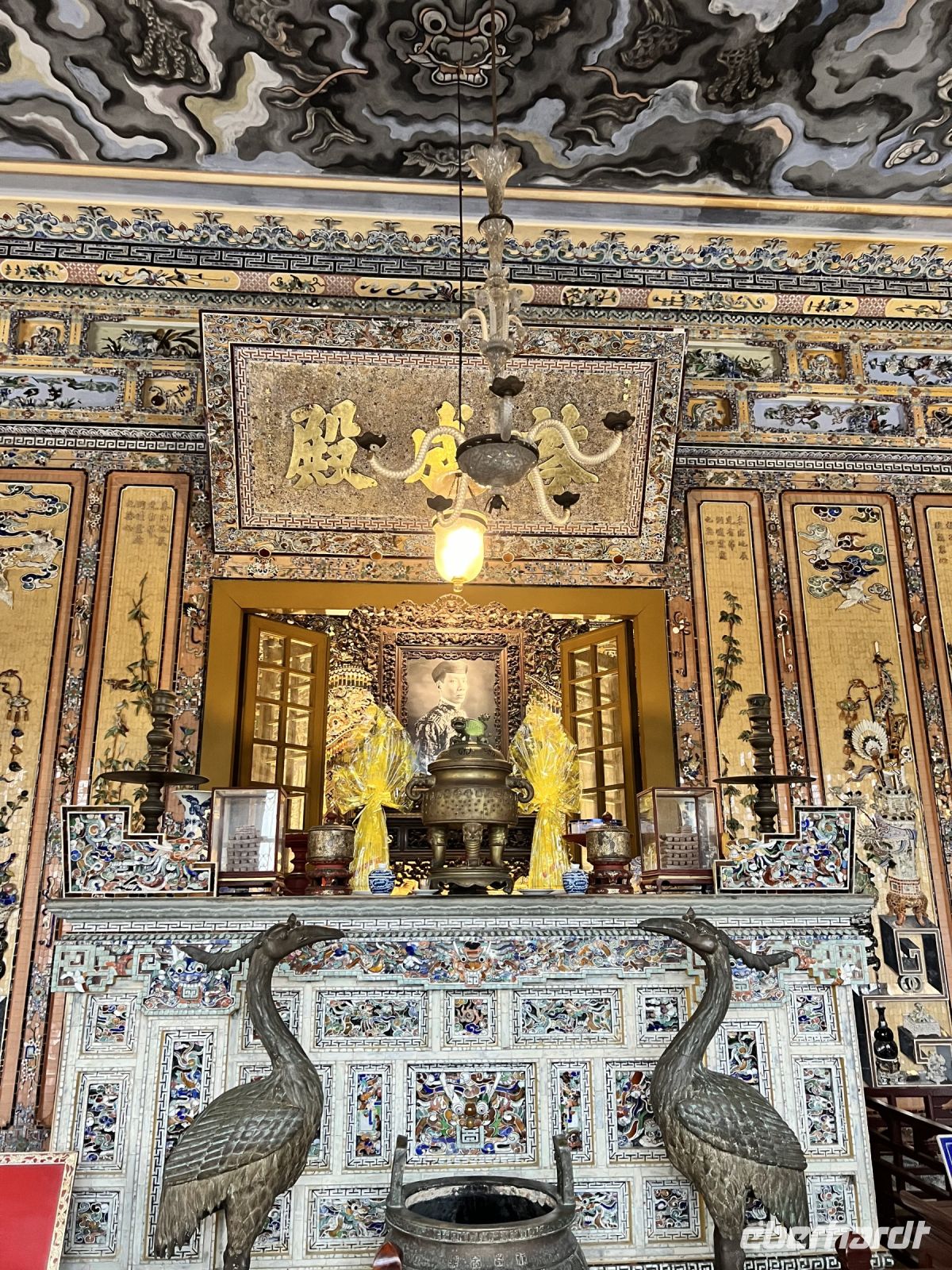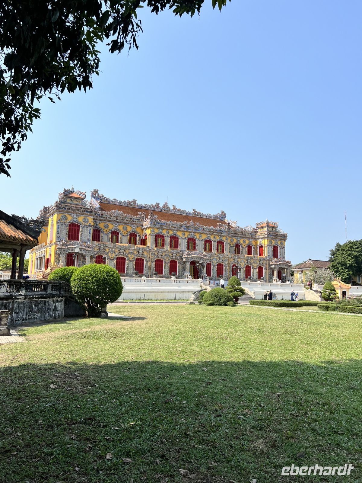 Nach einer Mittagspause spazierten wir noch durch den Kaiserkomplex, bis wir den Ausgang erreichten und weiter zum Mausoleum von Khai Dinh fuhren. Der Kaiser regierte zwischen 1916 und 1925 und liegt am Hang am Chau Chu Berg. Die Bauzeit betrug 11 Jahre und der Komplex besteht aus reinem Beton.