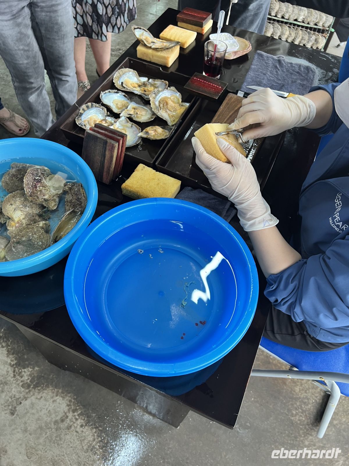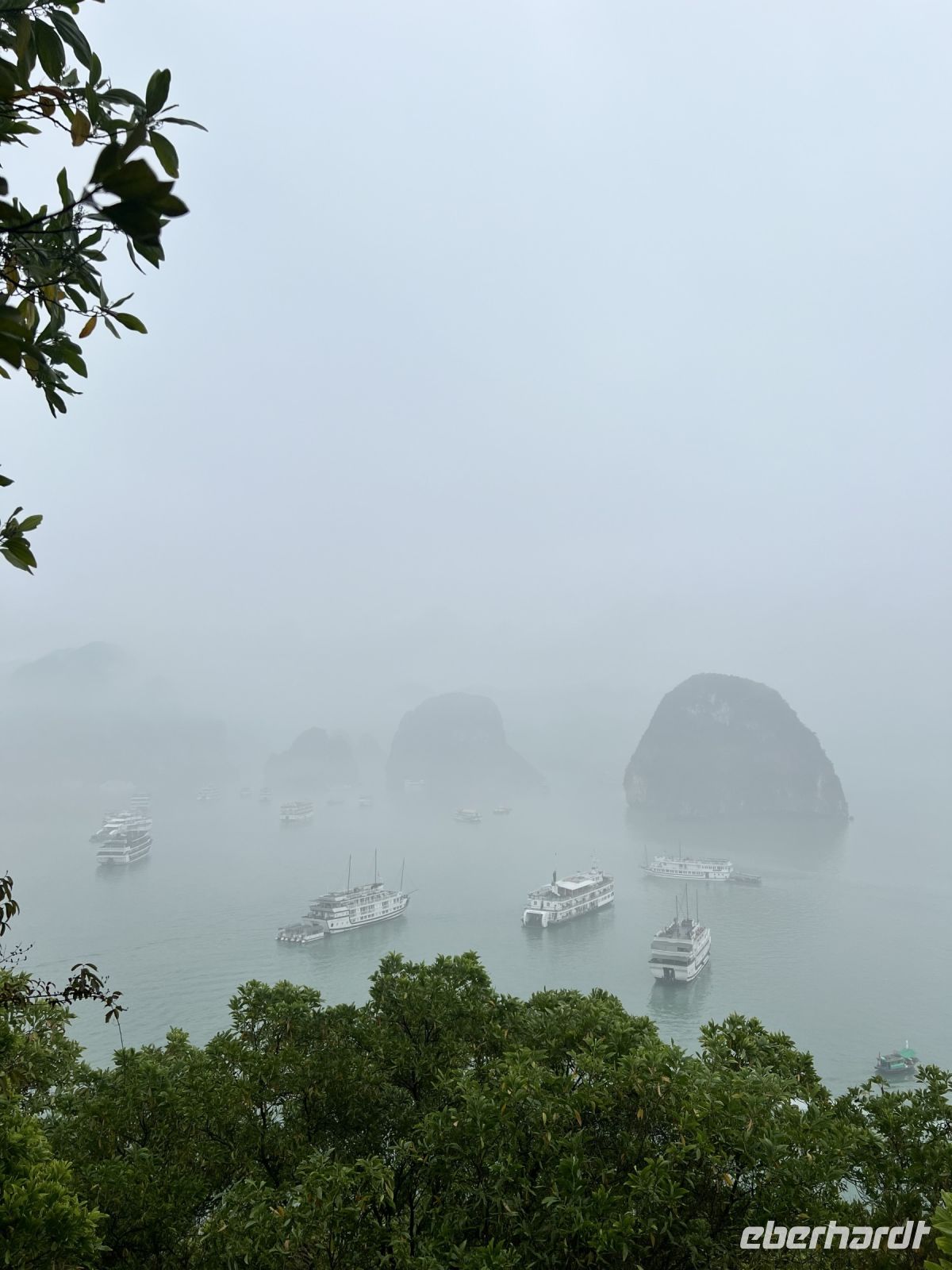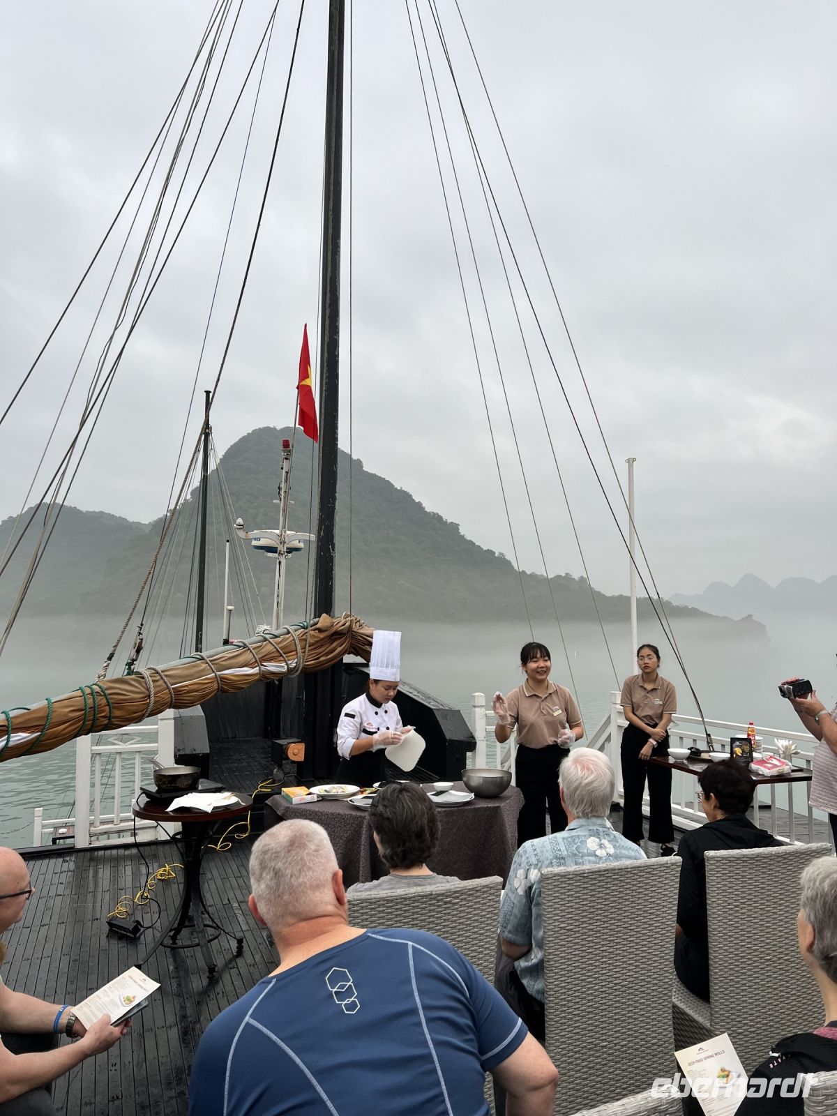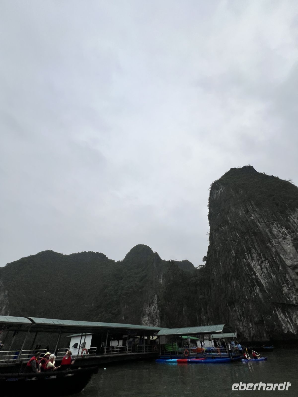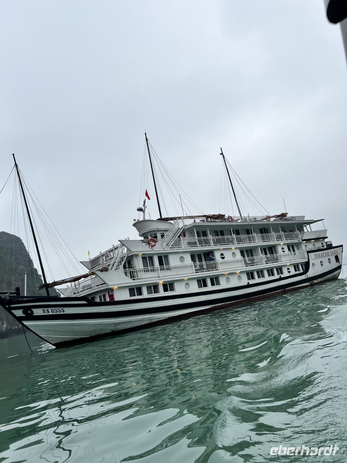 Wie verließen gegen 08:00 Uhr die Hauptstadt und fuhren über die Schnellstraße nach Ha Long. In Ha Long-Stadt angekommen, machten wir einen kurzen Stopp bei einer Austerperlenherstellung. Diese ist in Nordvietnam sehr bekannt und zeigt wie aus Austern, wunderschöne Perlen für Halsketten oder Gesichtscremen hergestellt werden. Gegen 11:30 Uhr erreichten wir die Lounge von der Rederei Paradise - wir entspannten etwas in der Lounge, bis wir zu unserer Dschunke transferiert wurden. Wir schifften ein und das Programm in der Ha Long Bucht begann. Zunächst bekamen wir ein kleines Brefing zum Schiff und es wurde uns ein leckeres Mittagessen serviert. Gestärkt fuhren wir auf die Ti Top Insel - die Insel die Hügelförmig mit dichtem Dschungelgrün bewachsen ist. Aufgrund des nicht so guten Wetters, hatten wir von der Insel aus keine gute Sicht in die Bucht. Jedoch ließen wir uns die Zeit im grünen nicht verderben und wir genossen die Zeit mit einem Bier oder eine frischen Kokosnuss. Danach besuchten wir die Luon Höhle - Die Tropfsteine haben sich über Jahrmillionen in verschiedenen Formen und Größen gebildet. Vor der Höhle befindet sich rechts das Cong Troi (Himmelstor) und die Con Rua (Schildkröteninsel). Nach den zahlreichen Entdeckungen fuhren wir mit dem Speedboot zurück zur Dschunke und erlebten eine Kochdemonstration auf dem Deck des Schiffes. Nach dem wir noch etwas getrunken haben, kleideten wir uns in vietnamesische Trachten und aßen wie zu Kaiserzeiten! Am Abend haben wir dann versucht Tintenfische zu angeln, jedoch waren wir nicht erfolgreich.