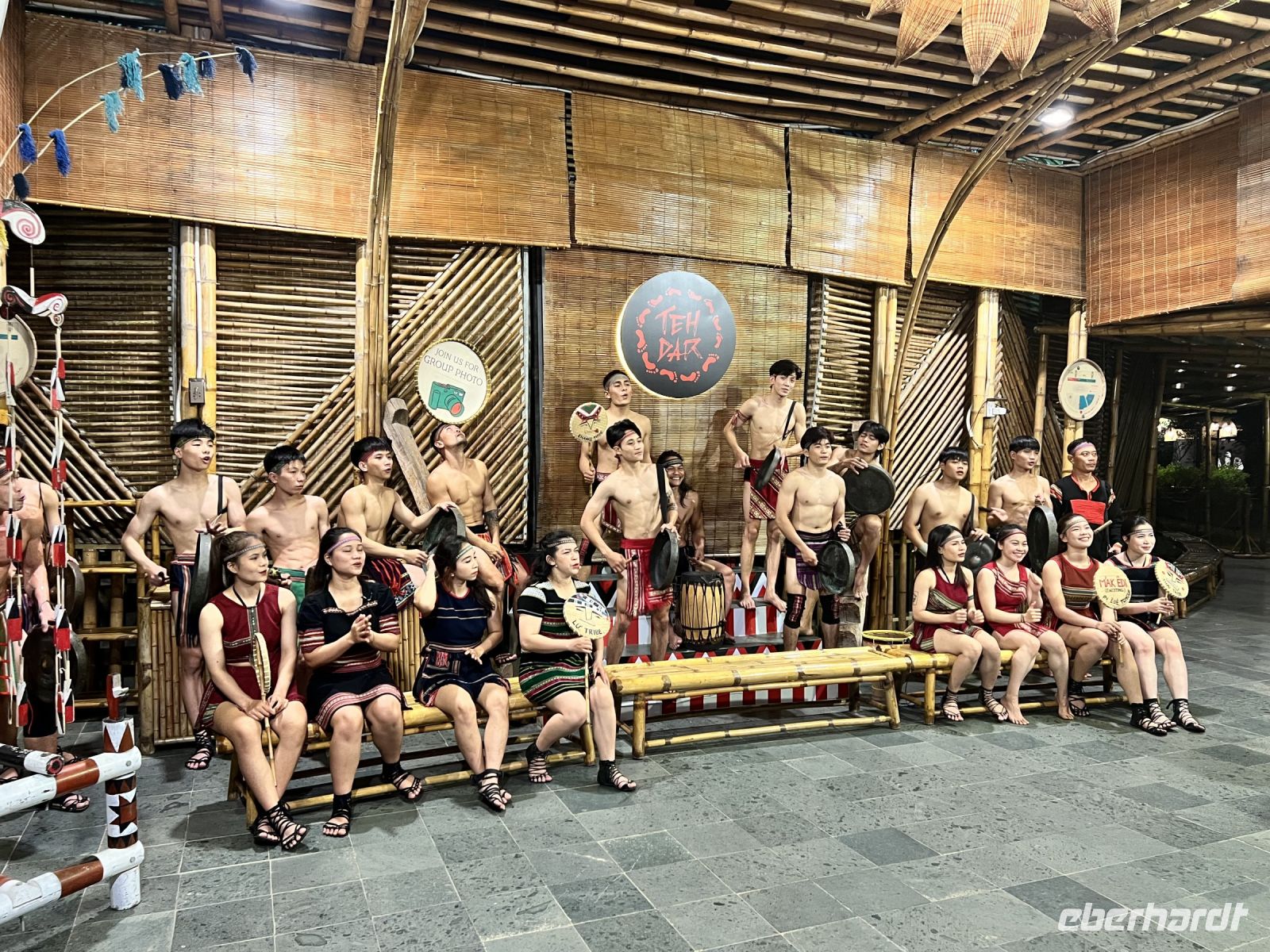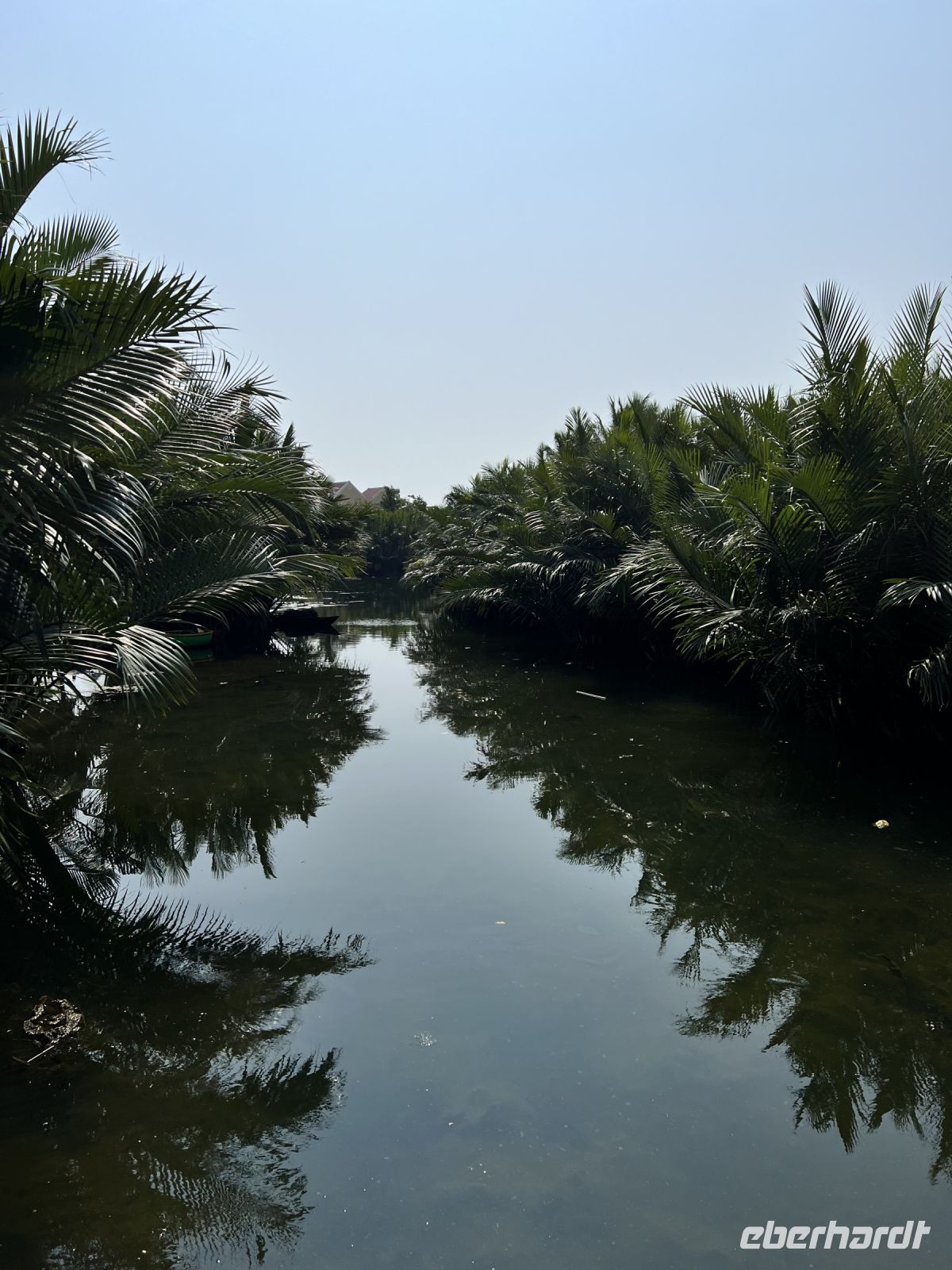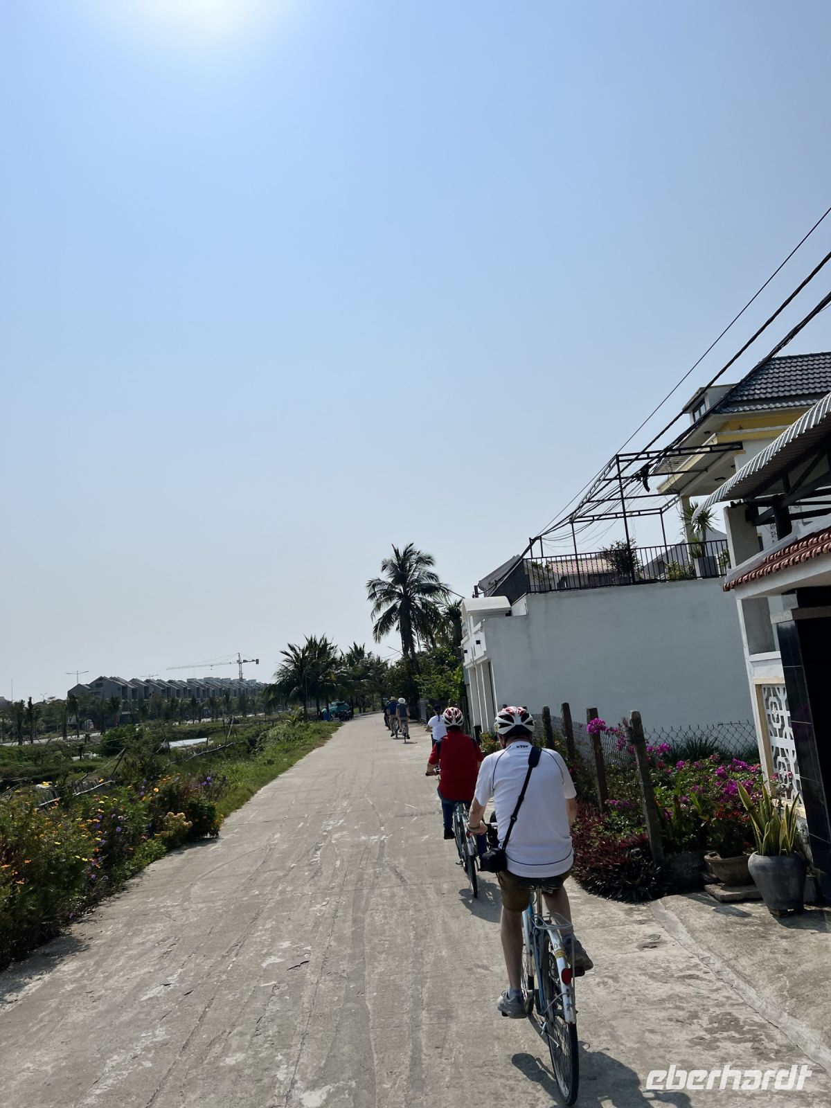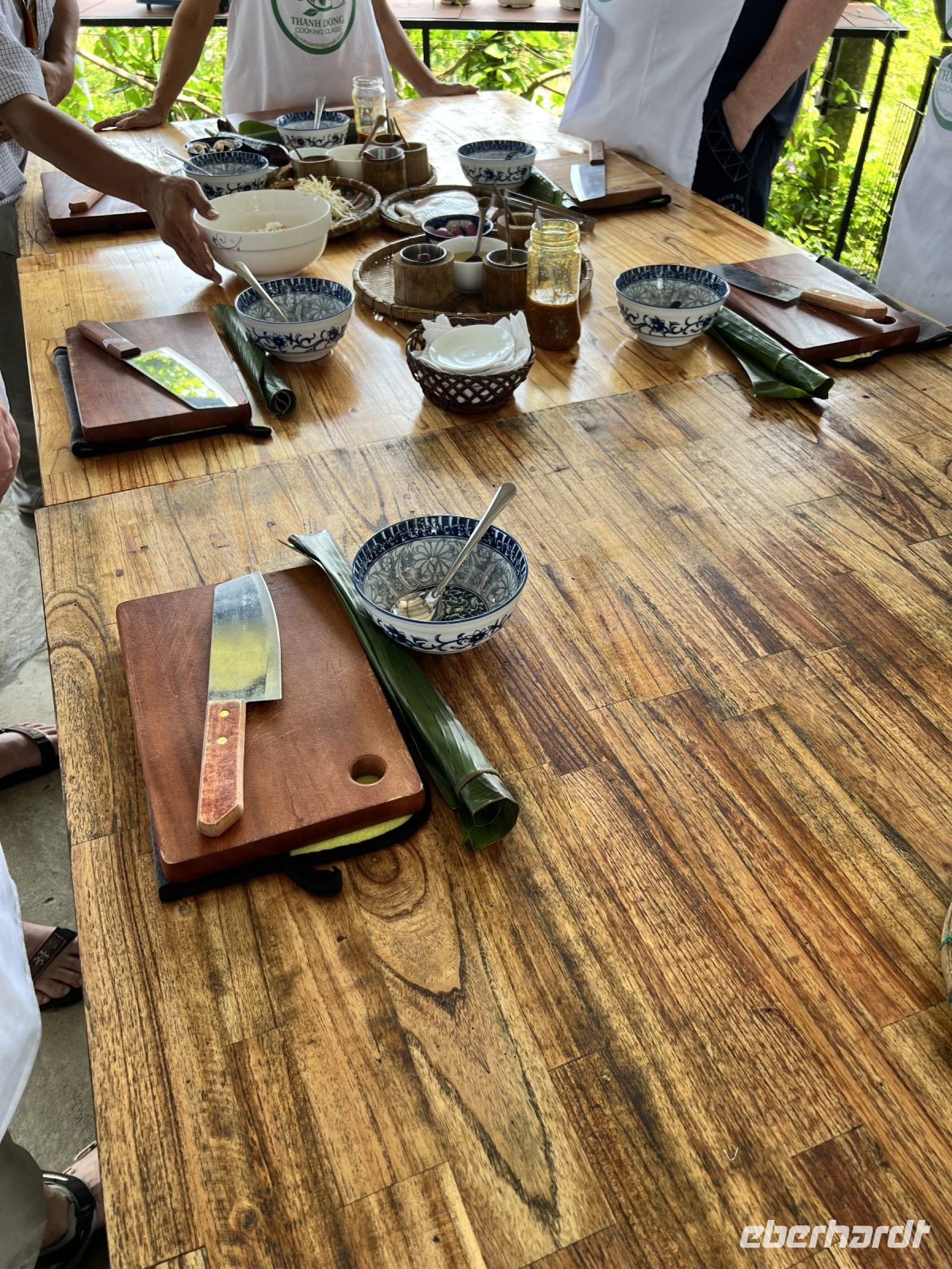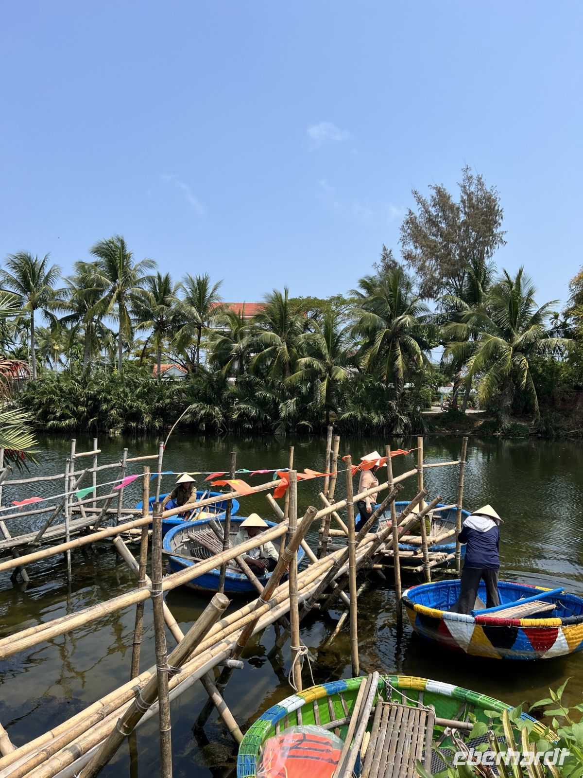 Heute begann unser Tag nach einem Frühstück mit einer Fahrradtour! Wir fuhren an Dörfer und Reisfeldern vorbei, wodurch wir die Landschaft Vietnams noch einmal näher kennenlernen durften. Unser Ziel war der Kochkurs bei einer vietnamesischen Familie - nach dem wir die Familie begrüßt haben, fuhren wir mit einer "Kokosnussschale" durch die tropischen Felder und genossen die Natur. Danach besuchten wir die Gemüsegarten der Familie - dieser ist ohne Chemikalien angebaut und 100% BIO! Wir pflückten einige Gemüsesorten für unseren jetzt anstehenden Kochkurs. Unser Köchin zeigte uns einige Handfertigkeiten und brachte uns bei, wie wir vietnamesische Pfannkuchen (Banh Xeo) und einen leckeren Aubergine-Eintopf zubereiten kann. Mit voller Freude durften wir dann auch die selbstgekochten Speisen verzehren und genießen! Mit einem vollem Magen, ging es dann mit einem Elektrofahrzeug in die Altstadt von Hoi An. Dort besichtigten wir die Chinesische Versammlungshalle, die derzeit gebaute Japanische Brücke und schlenderten entlang des Flusses. Währenddessen lernten wir von unserem Reiseleiter die Geschichte, Kultur und das Hochwasser von Hoi An kennen. Somit endete unser Tag 6...das war noch nicht alles - wir, als Gruppe, habe uns dann entschieden noch eine Artistenshow zu besuchen. Diese nannte sich TEH DAR. Dieses Stück zeigt noch mal deutlich die Geschichte und Lebensweise der ethnischen Minderheiten in Vietnam. Nach ca. einer Stunde endete die Vorstellung und wir waren restlos begeistert von dieser Artistik. Als Belohnung unternahmen wir eine kleine Streetfoodtour durch Hoi An und probierten verschiedene Speisen, wie einen gegrillten Oktopus oder einen vietnamesischen Crepe. Um ein paar Souvinirs zu besorgen, schlenderten wir noch über den bekannten Nachtmarkt. Wir fuhren dann im Anschluss mit einem Taxi zu unserem Resort zurück und mit eindrucksvollen Erlebnissen, endete offiziell unser Tag 6.