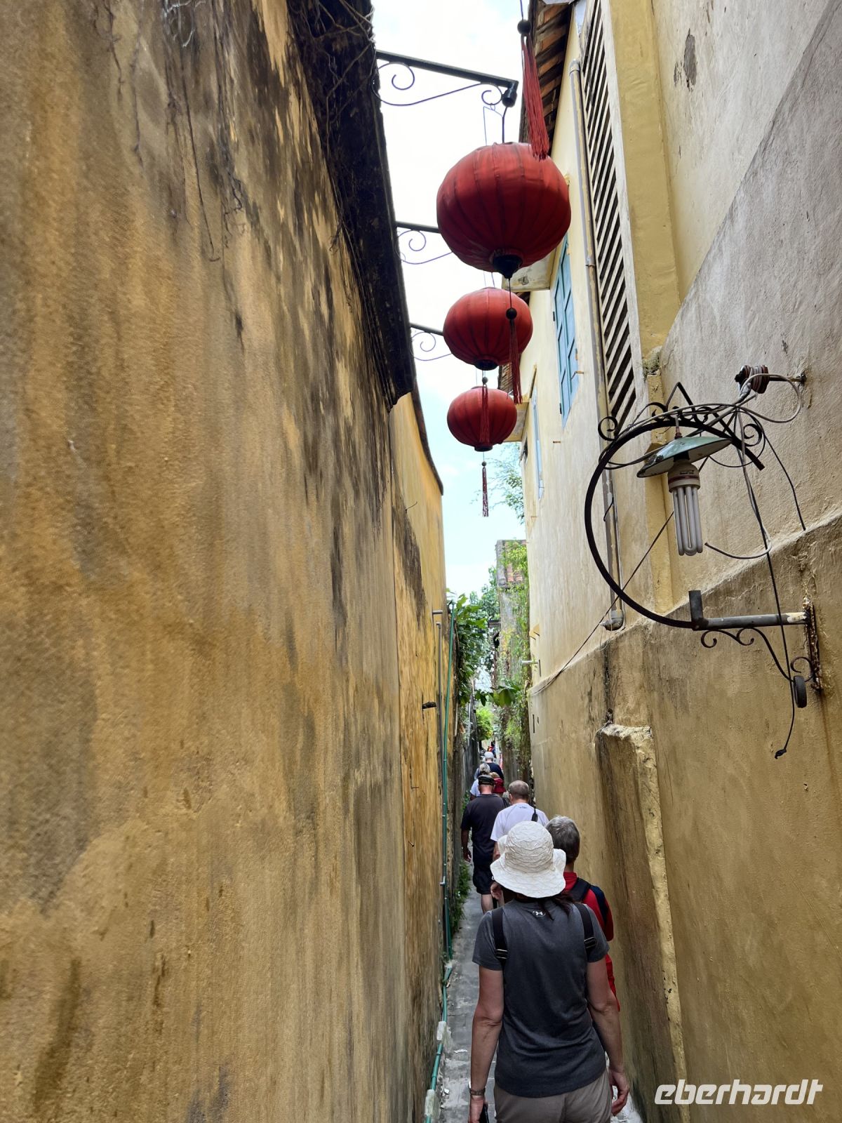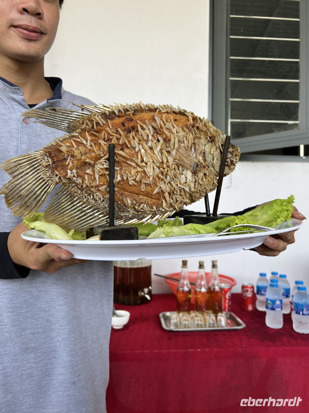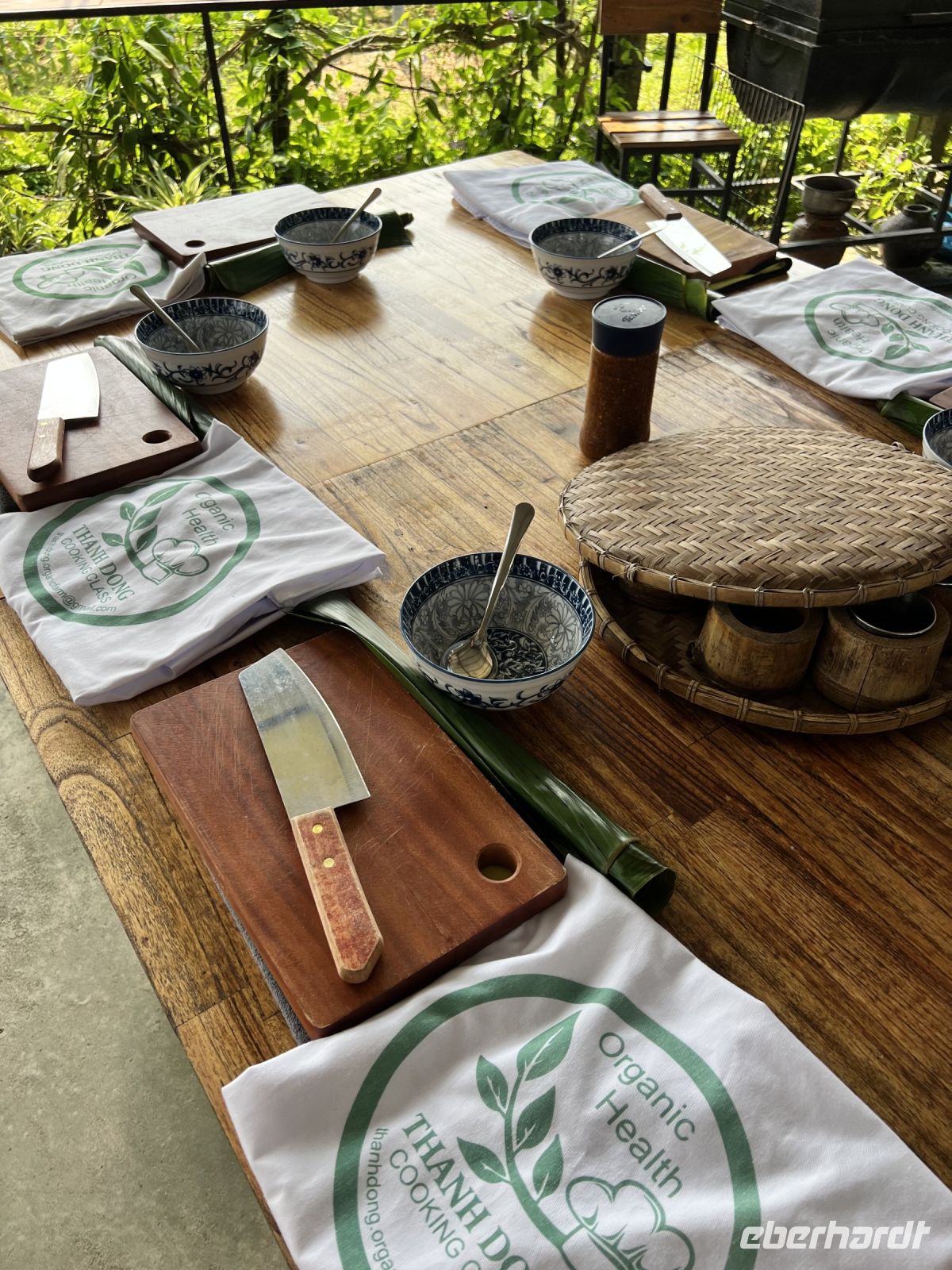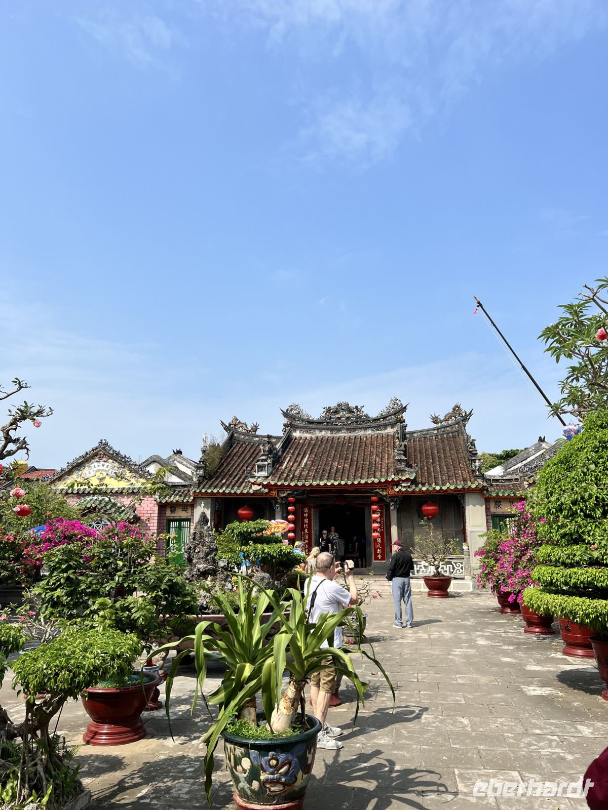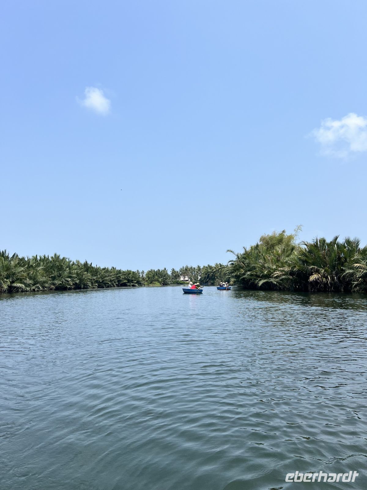 Heute begann unser Tag nach einem Frühstück mit einer Fahrradtour! Wir fuhren an Dörfer und Reisfeldern vorbei, wodurch wir die Landschaft Vietnams noch einmal näher kennenlernen durften. Unser Ziel war der Kochkurs bei einer vietnamesischen Familie - nach dem wir die Familie begrüßt haben, fuhren wir mit einer "Kokosnussschale" durch die tropischen Felder und genossen die Natur. Danach besuchten wir die Gemüsegarten der Familie - dieser ist ohne Chemikalien angebaut und 100% BIO! Wir pflückten einige Gemüsesorten für unseren jetzt anstehenden Kochkurs. Unser Köchin zeigte uns einige Handfertigkeiten und brachte uns bei, wie wir vietnamesische Pfannkuchen (Banh Xeo) und einen leckeren Aubergine-Eintopf zubereiten kann. Mit voller Freude durften wir dann auch die selbstgekochten Speisen verzehren und genießen! Mit einem vollem Magen, ging es dann mit einem Elektrofahrzeug in die Altstadt von Hoi An. Dort besichtigten wir die Chinesische Versammlungshalle, die derzeit gebaute Japanische Brücke und schlenderten entlang des Flusses. Währenddessen lernten wir von unserem Reiseleiter die Geschichte, Kultur und das Hochwasser von Hoi An kennen. Somit endete unser Tag 6...das war noch nicht alles - wir, als Gruppe, habe uns dann entschieden noch eine Artistenshow zu besuchen. Diese nannte sich TEH DAR. Dieses Stück zeigt noch mal deutlich die Geschichte und Lebensweise der ethnischen Minderheiten in Vietnam. Nach ca. einer Stunde endete die Vorstellung und wir waren restlos begeistert von dieser Artistik. Als Belohnung unternahmen wir eine kleine Streetfoodtour durch Hoi An und probierten verschiedene Speisen, wie einen gegrillten Oktopus oder einen vietnamesischen Crepe. Um ein paar Souvinirs zu besorgen, schlenderten wir noch über den bekannten Nachtmarkt. Wir fuhren dann im Anschluss mit einem Taxi zu unserem Resort zurück und mit eindrucksvollen Erlebnissen, endete offiziell unser Tag 6.