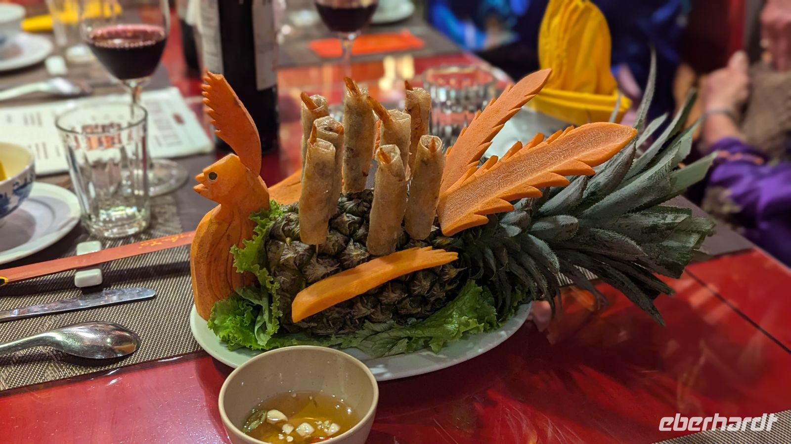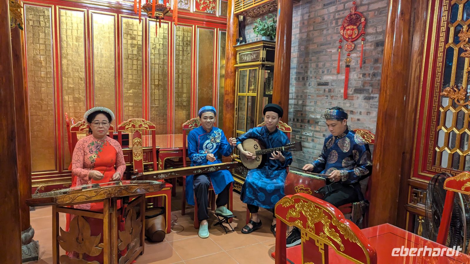Während des Dinners spielte eine traditionelle Band auf vietnamesischen Instrumenten, und eine Sängerin sorgte für die passende Atmosphäre. Das Essen selbst war ein Kunstwerk: kunstvoll dekorierte Speisen in Form von Hähnen oder Schildkröten. Es war ein außergewöhnliches und unvergessliches Abendessen, das uns in die Zeit der Kaiser zurückversetzte.